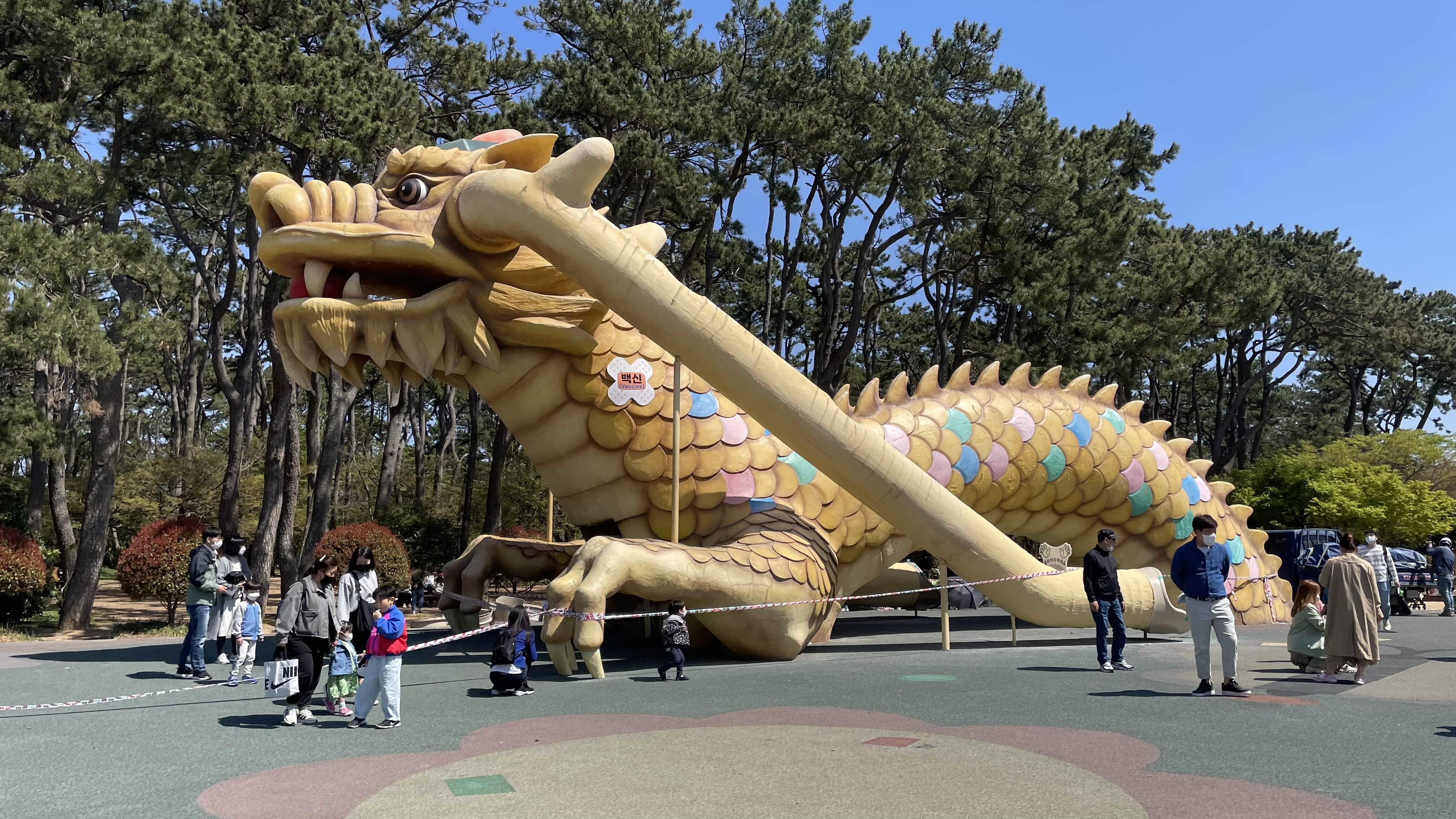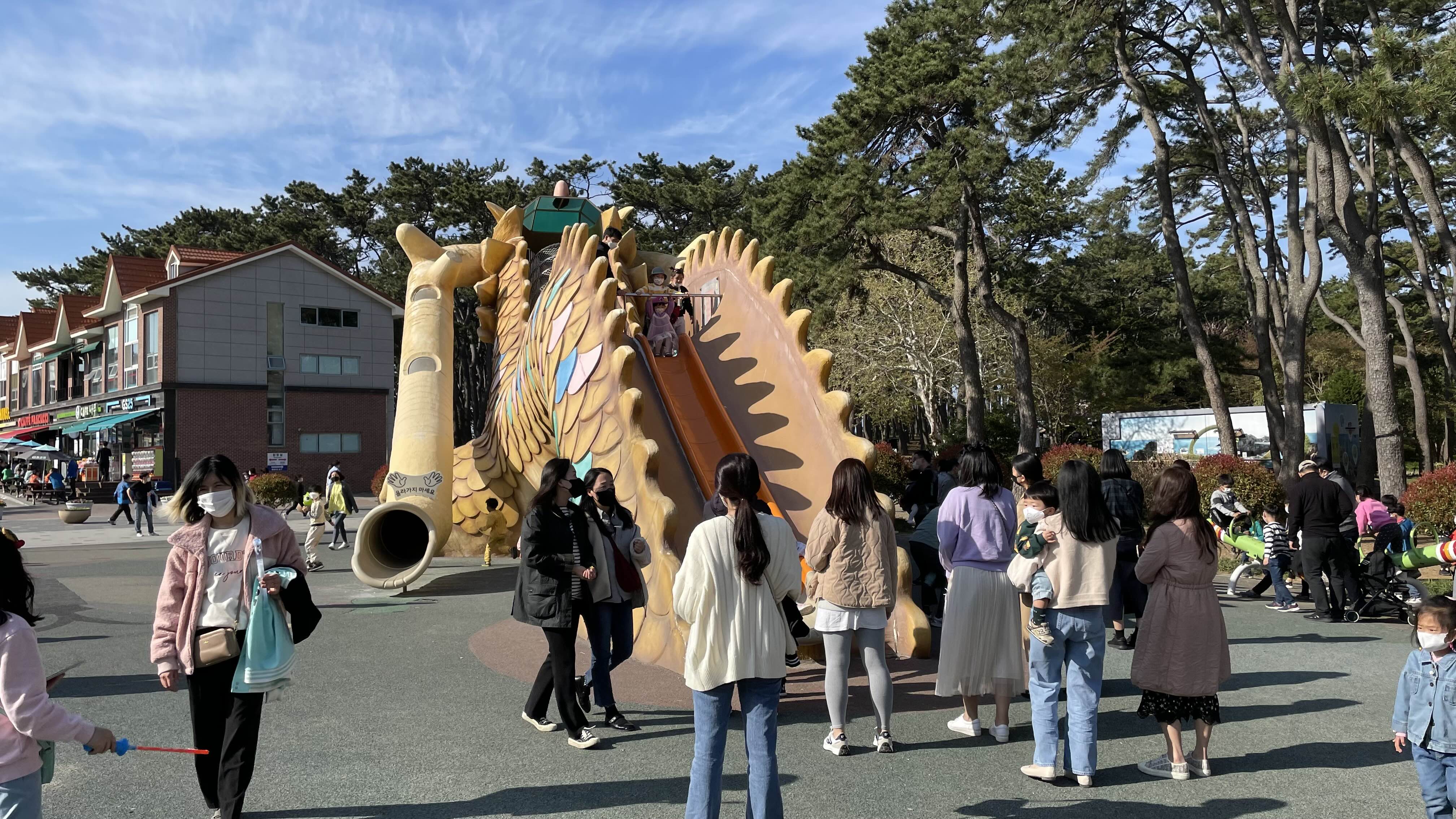 커다란 용 모양의 미끄럼틀이 있는 용 놀이터에 많은 아이들과 부모들이 시간을 보내고 있었습니다.