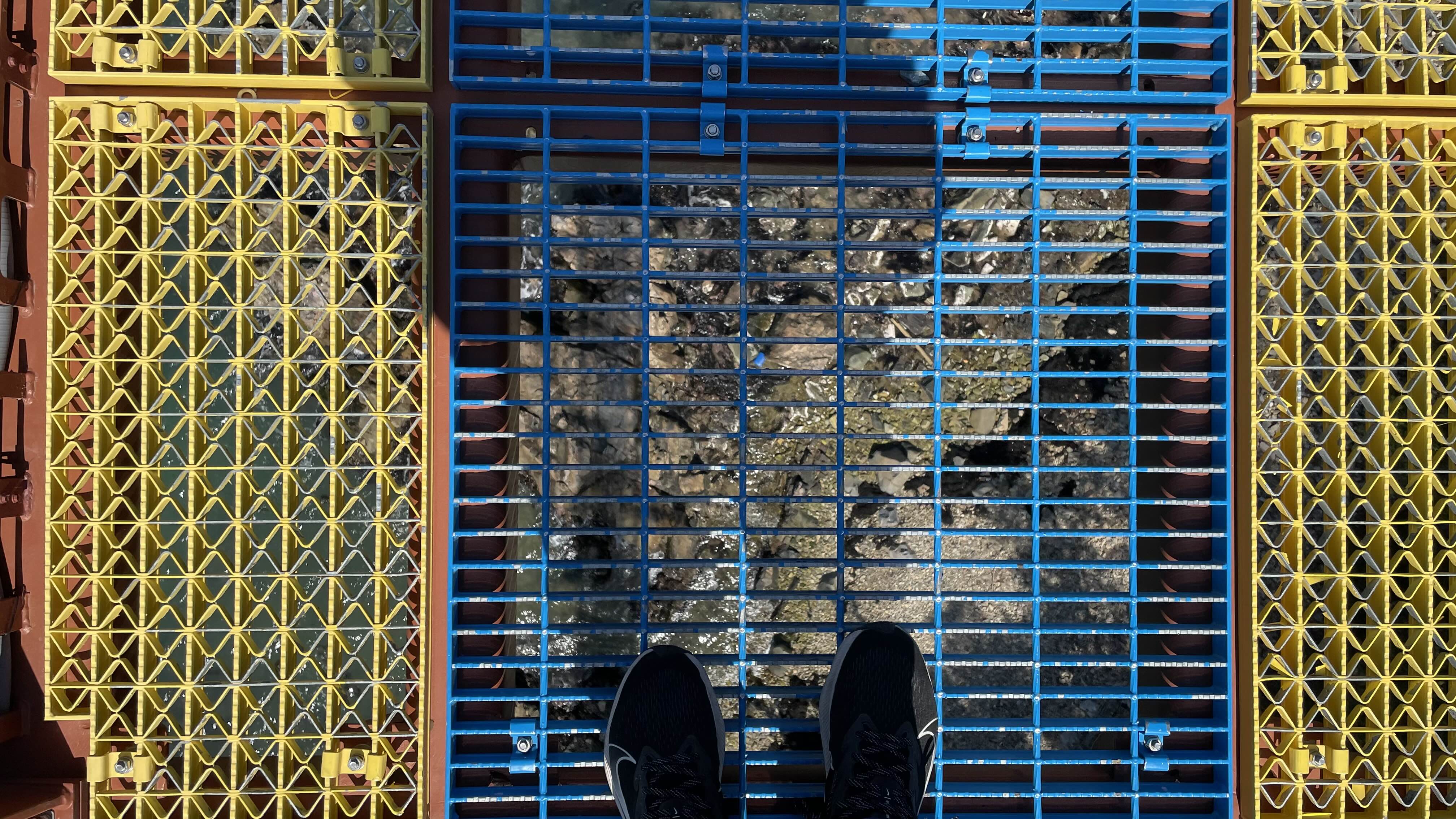 출렁다리 가운데쯤에서 아래를 바라보니 길게 뻗은 그물이 마치 방향을 나타내는 화살표 같습니다.