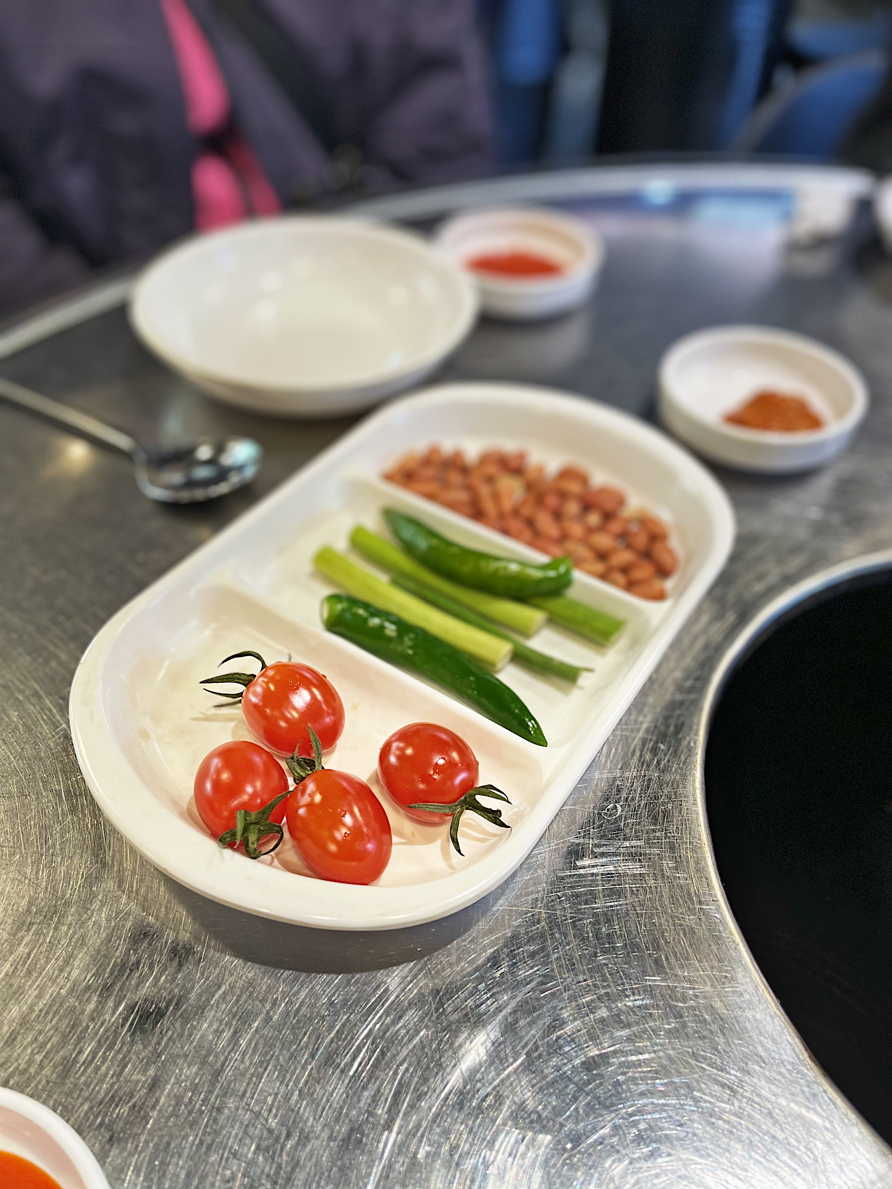 동그란 테이블에 앉으면 먼저 방토와 마늘종, 땅콩 그리고 콘치즈를 기본으로 내어주십니다.