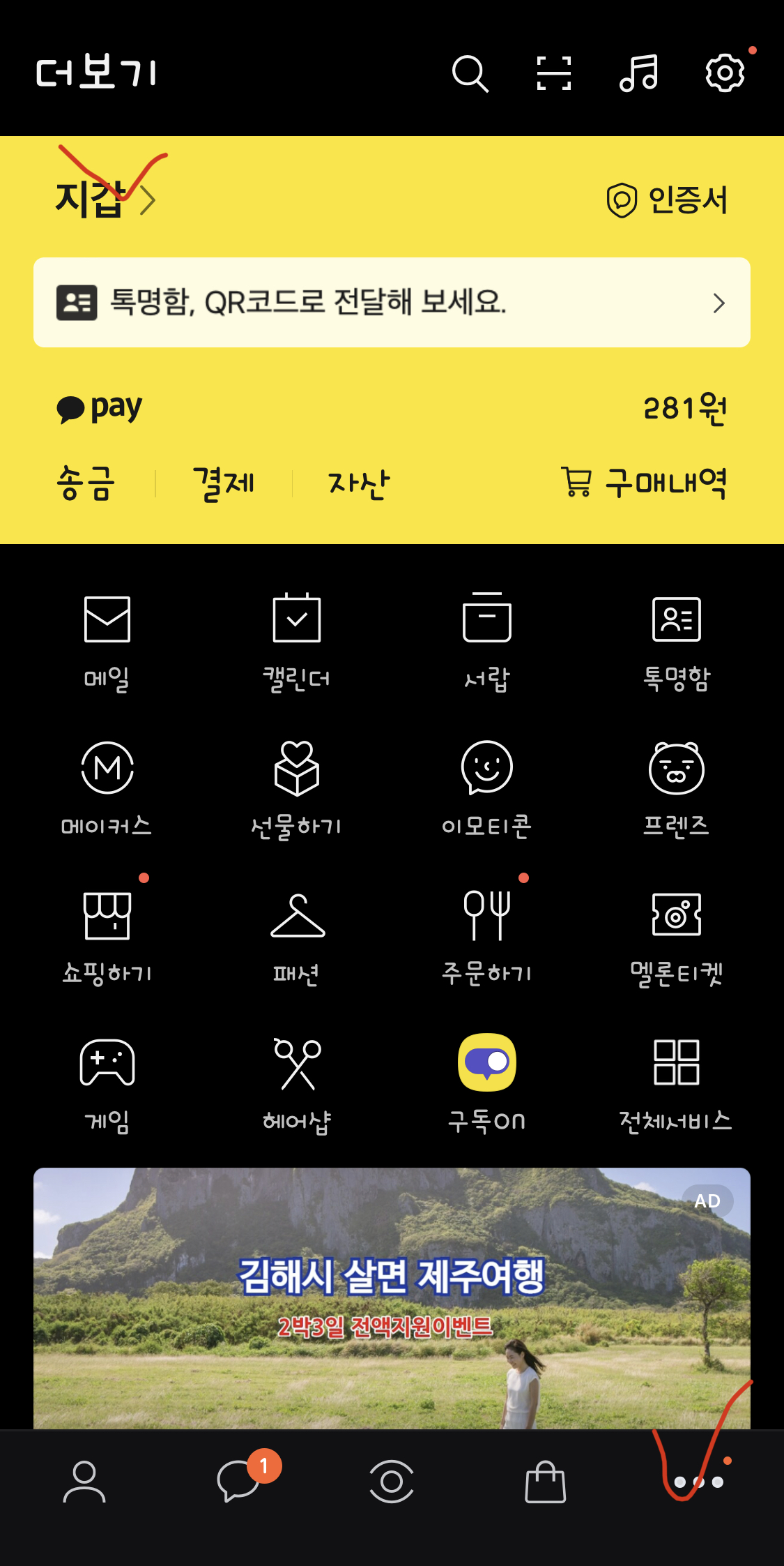 1. 먼저 카카오톡 실행 후 우측 하단의 점 3개 클릭한 다음 좌측 상단의 더보기 아래 지갑> 을 클릭합니다.