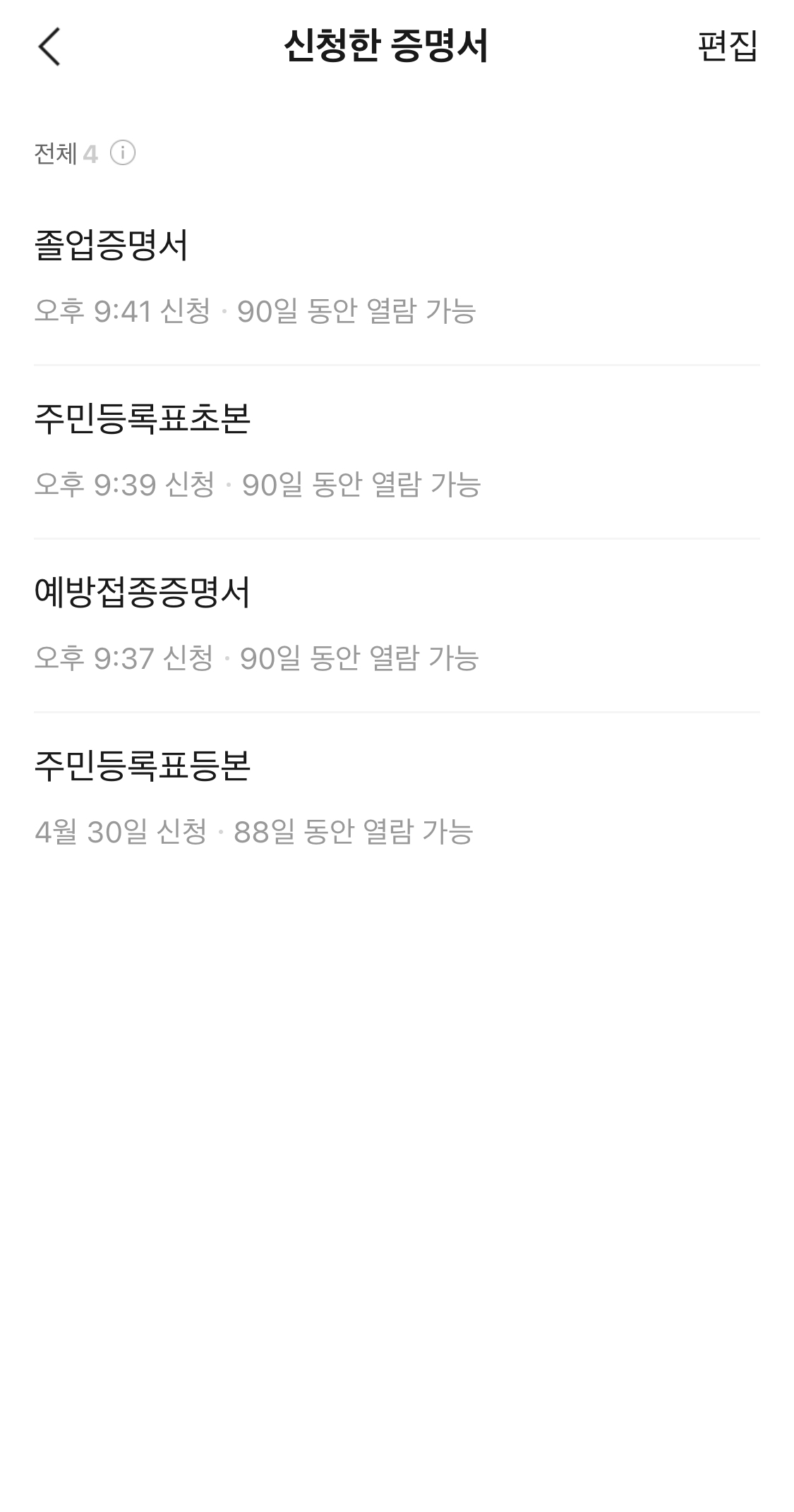 한 번 발급한 서류는 "신청한 증명서" 메뉴에서 90일 동안 열람 가능하기 때문에