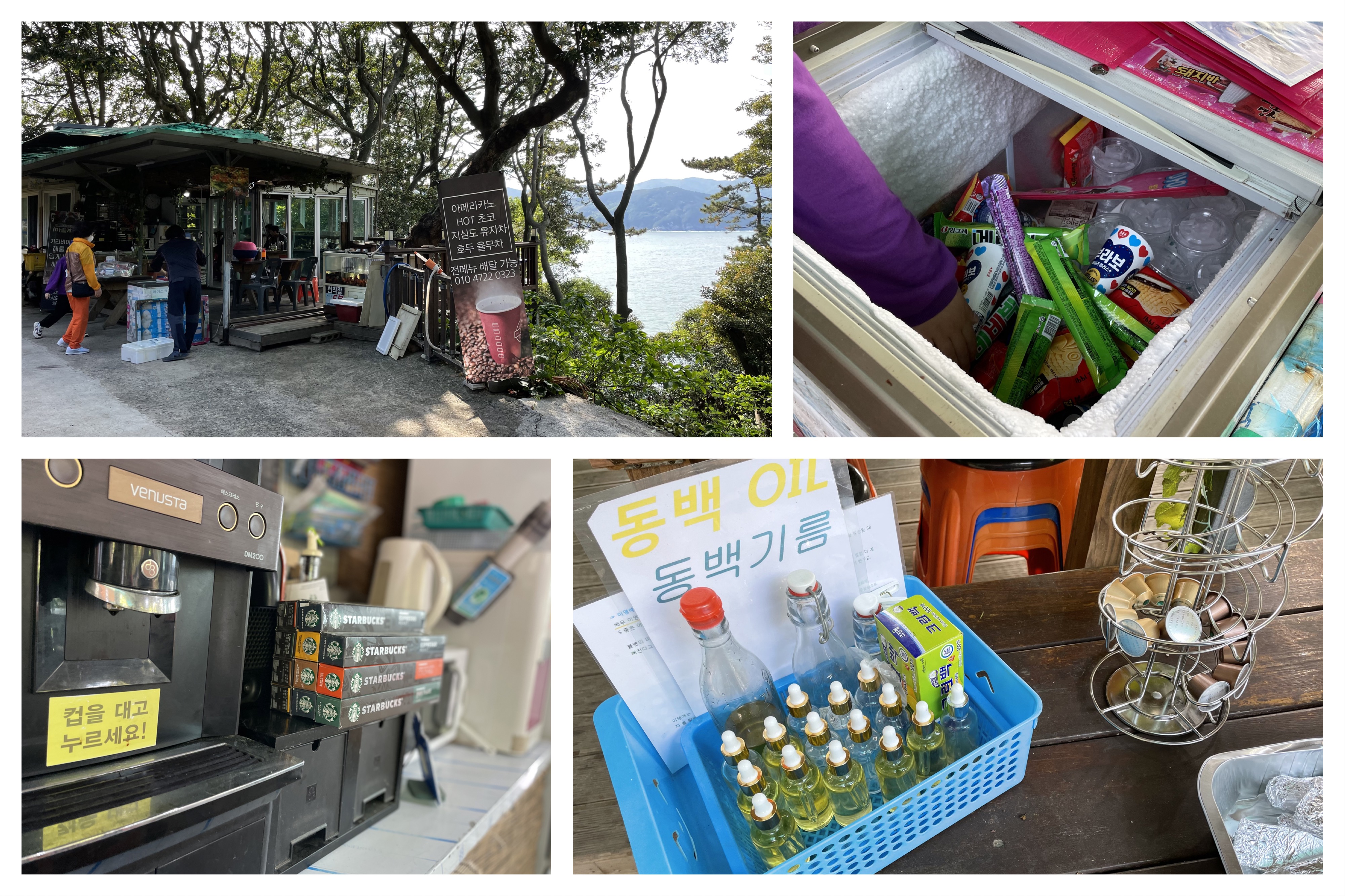 가게에서는 갖가지 해산물과 술안주뿐만 아니라 아이스크림, 동백기름도 판매하고 있습니다.