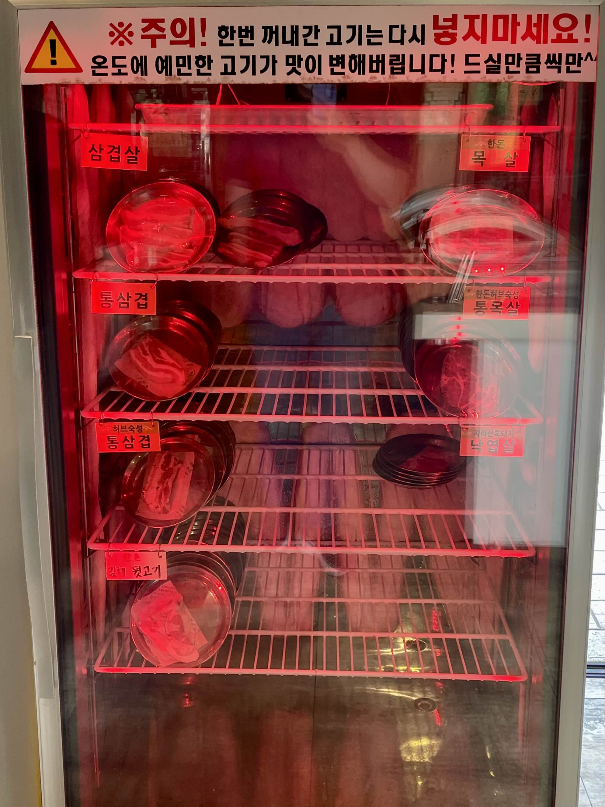 옆에 냉장고에는 삼겹살, 목살, 통삼겹, 뒷고기, 낙엽살, 통목살이 접시에 담겨 있습니다.