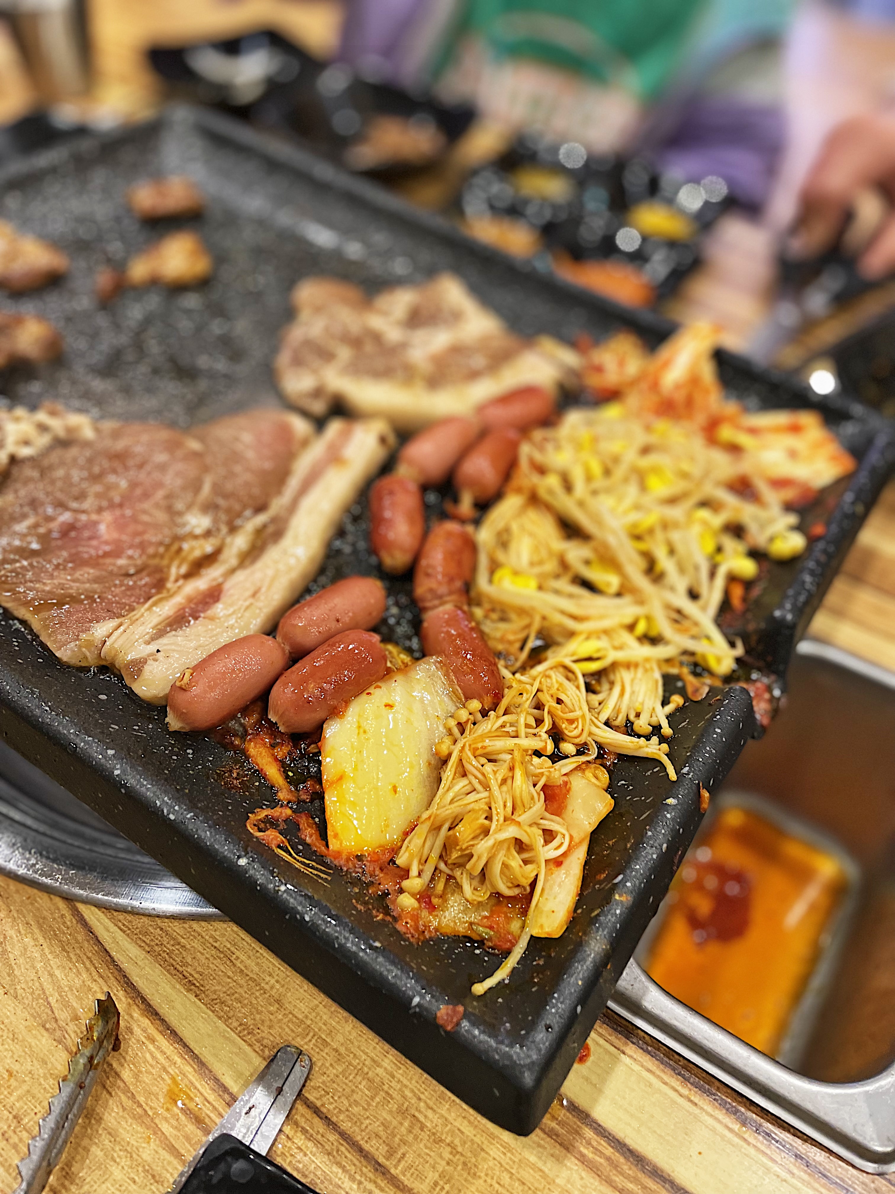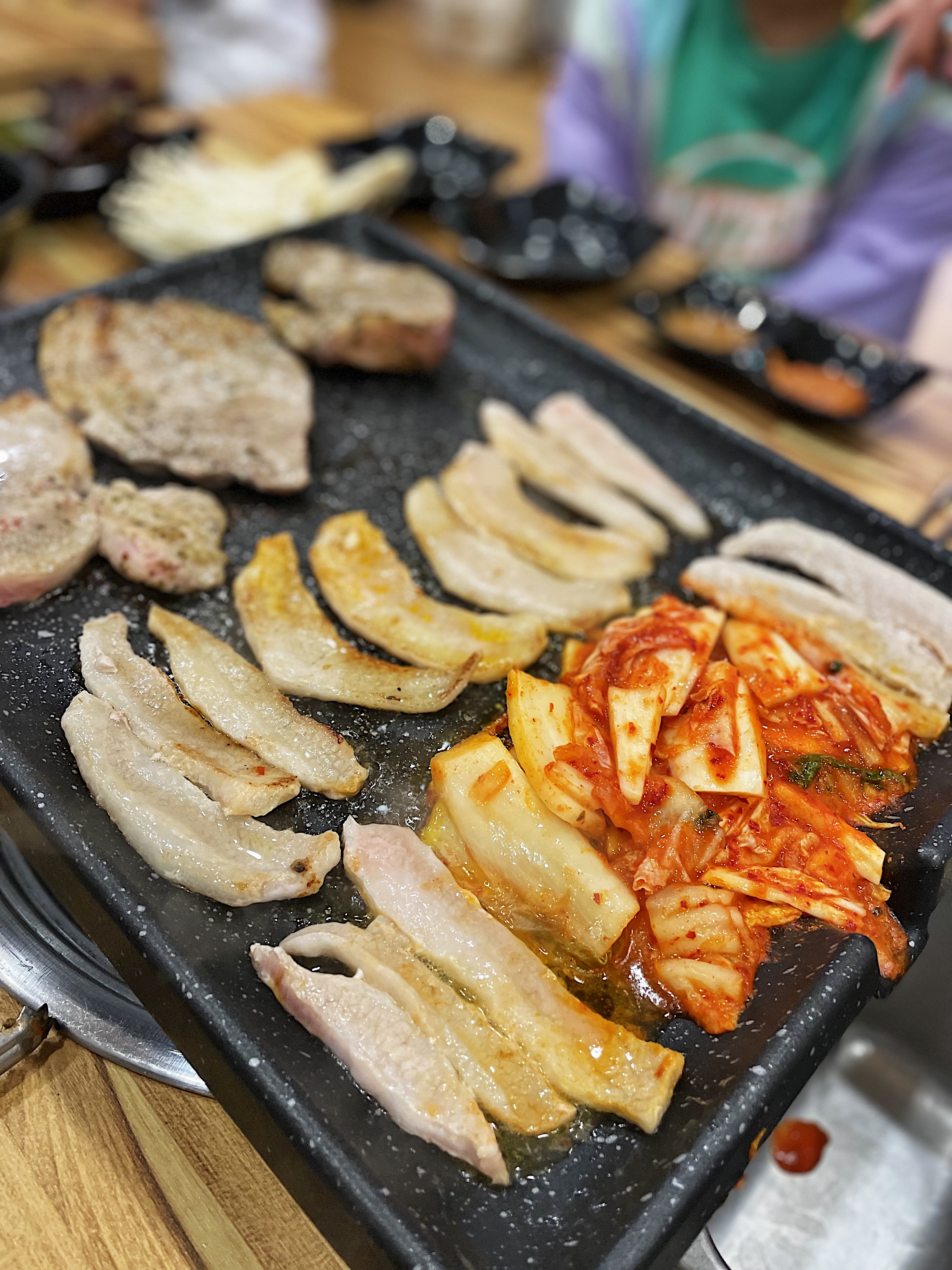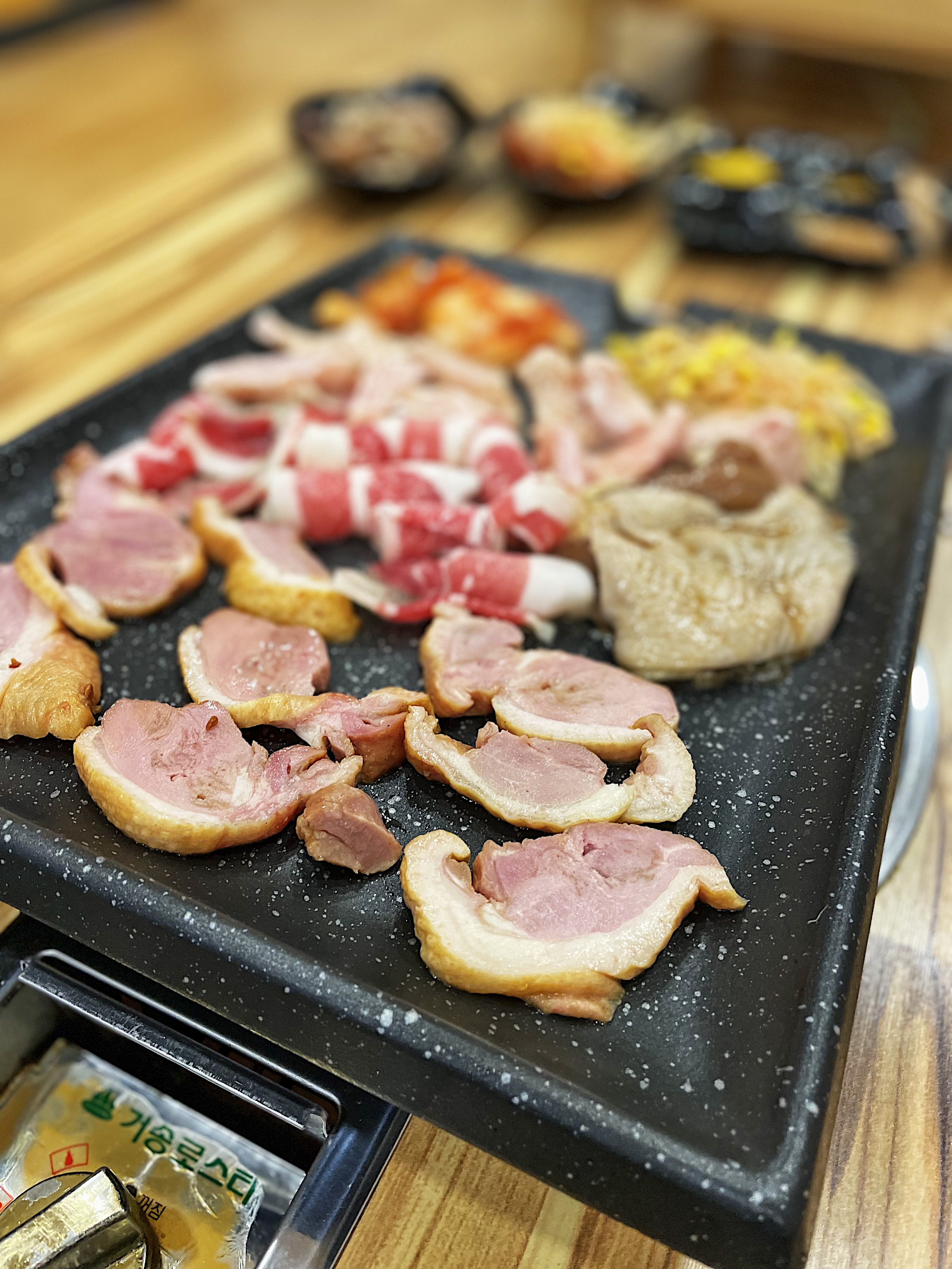 빠르게 불판부터 달궈주고 일단 고기부터 굽습니다.