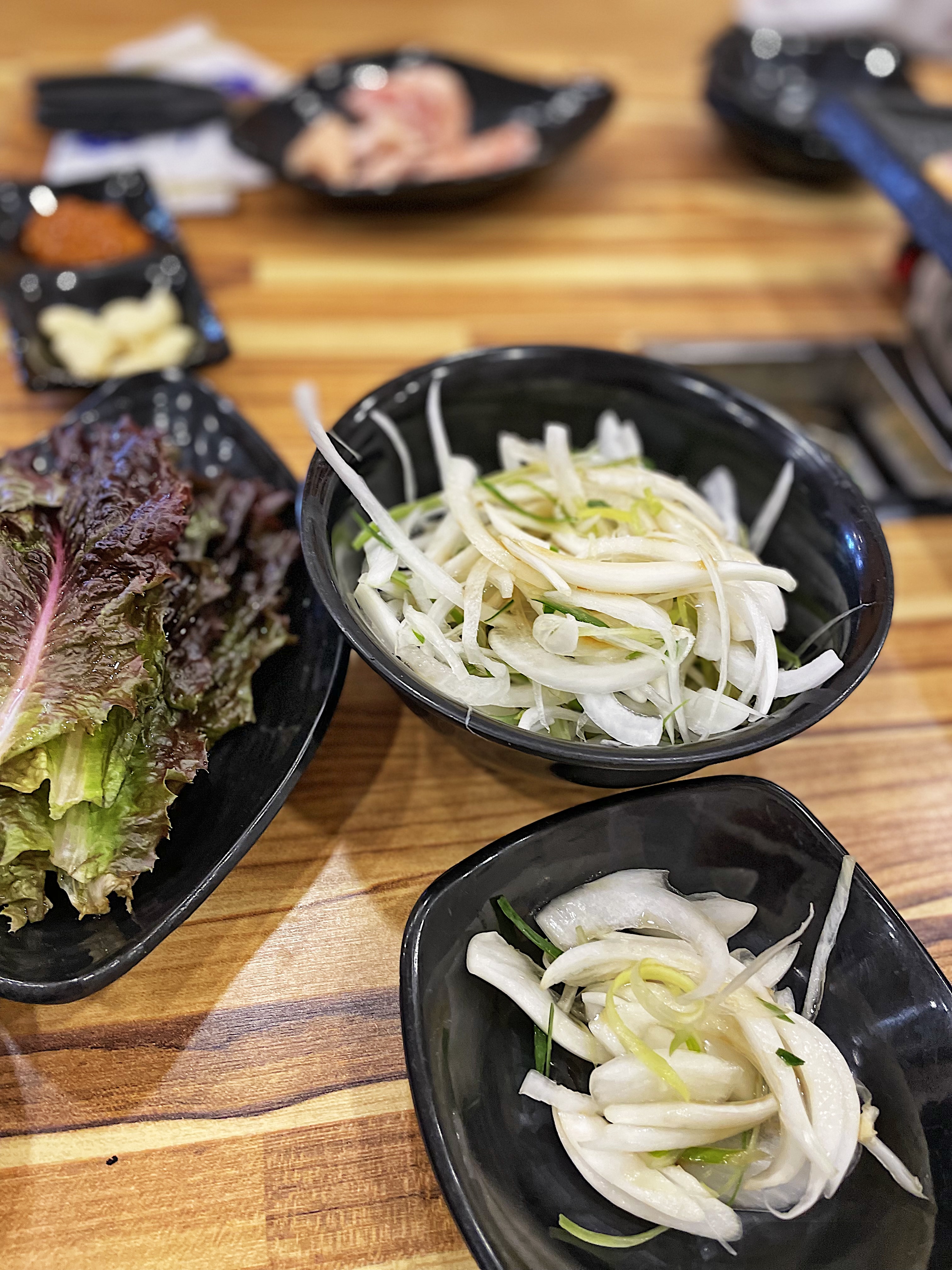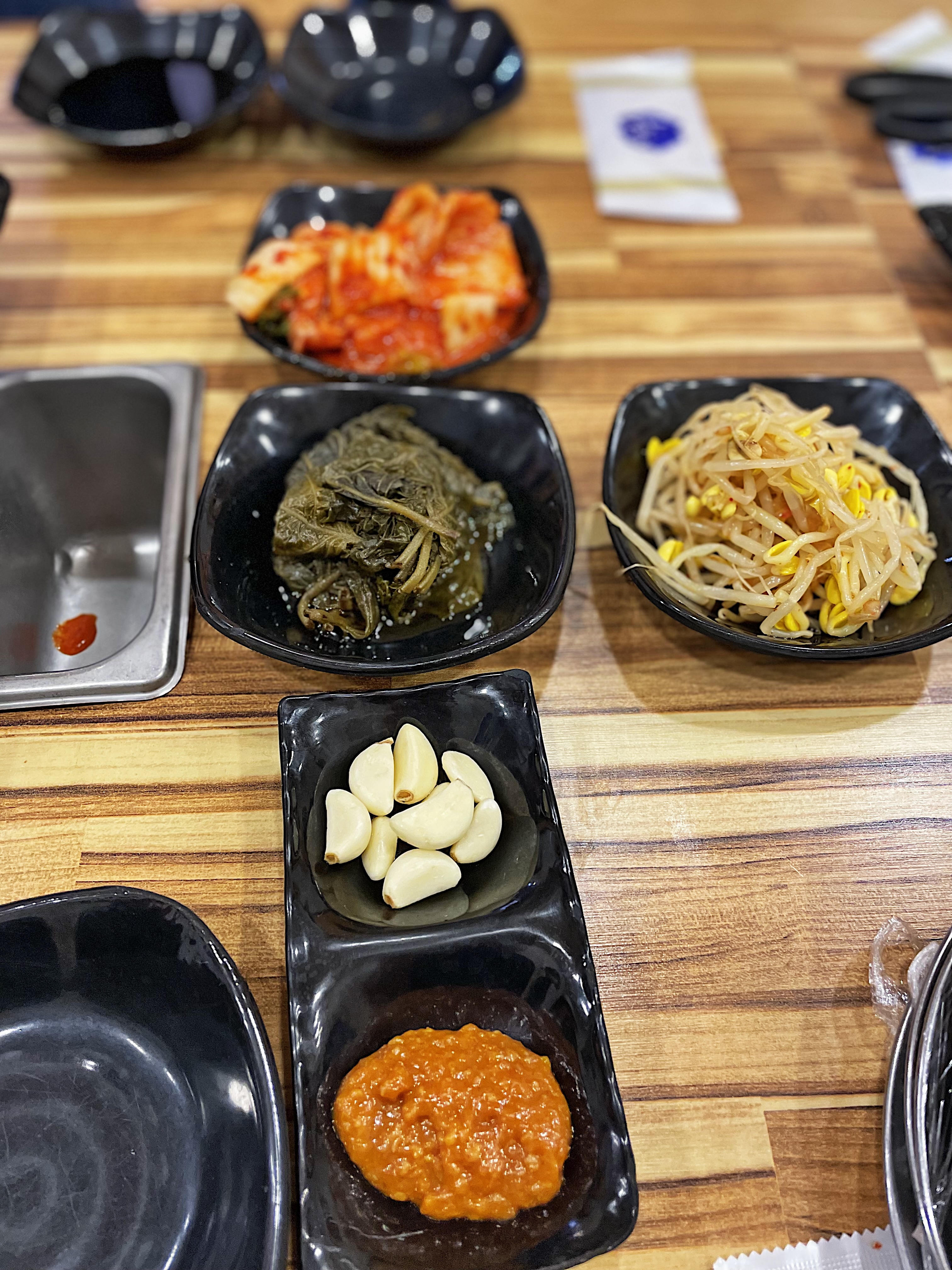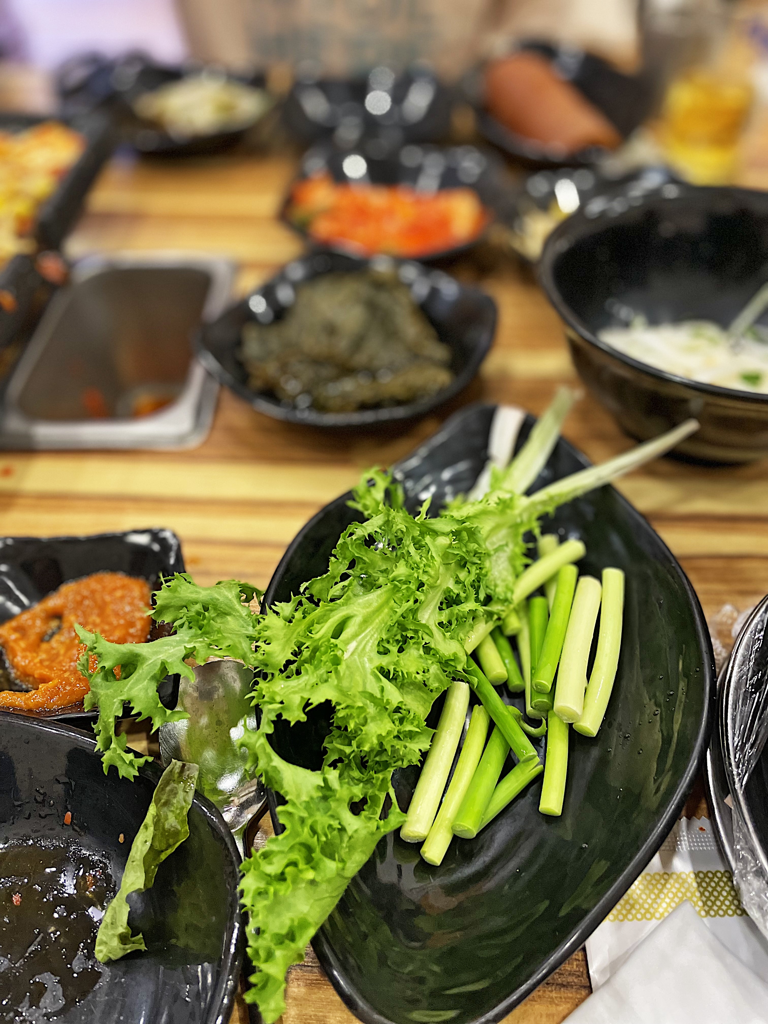 셀프바에는 각종 야채(상추, 깻잎, 치커리) 뿐만 아니라 김치, 콩나물, 마늘쫑, 고추, 마늘,