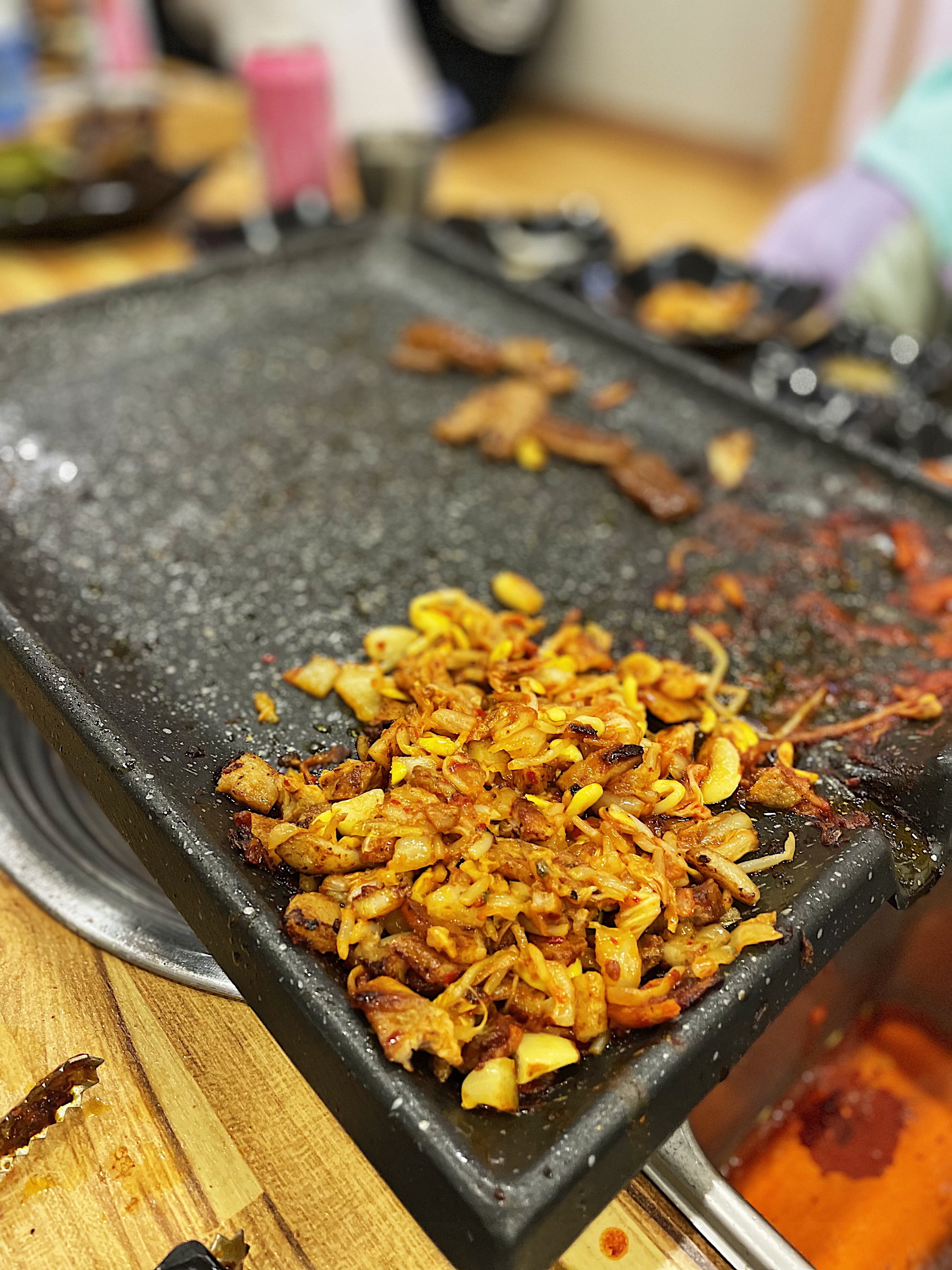 다년간의 고기 경력으로 김치와 콩나물, 마늘을 굽고 조금 남은 고기를 잘게 자른 다음,
