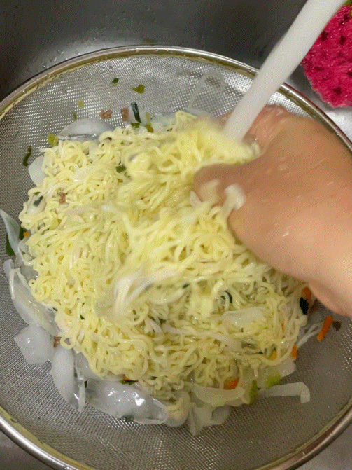 건져낸 면은 찬물에 빠르게 헹궈줍니다.