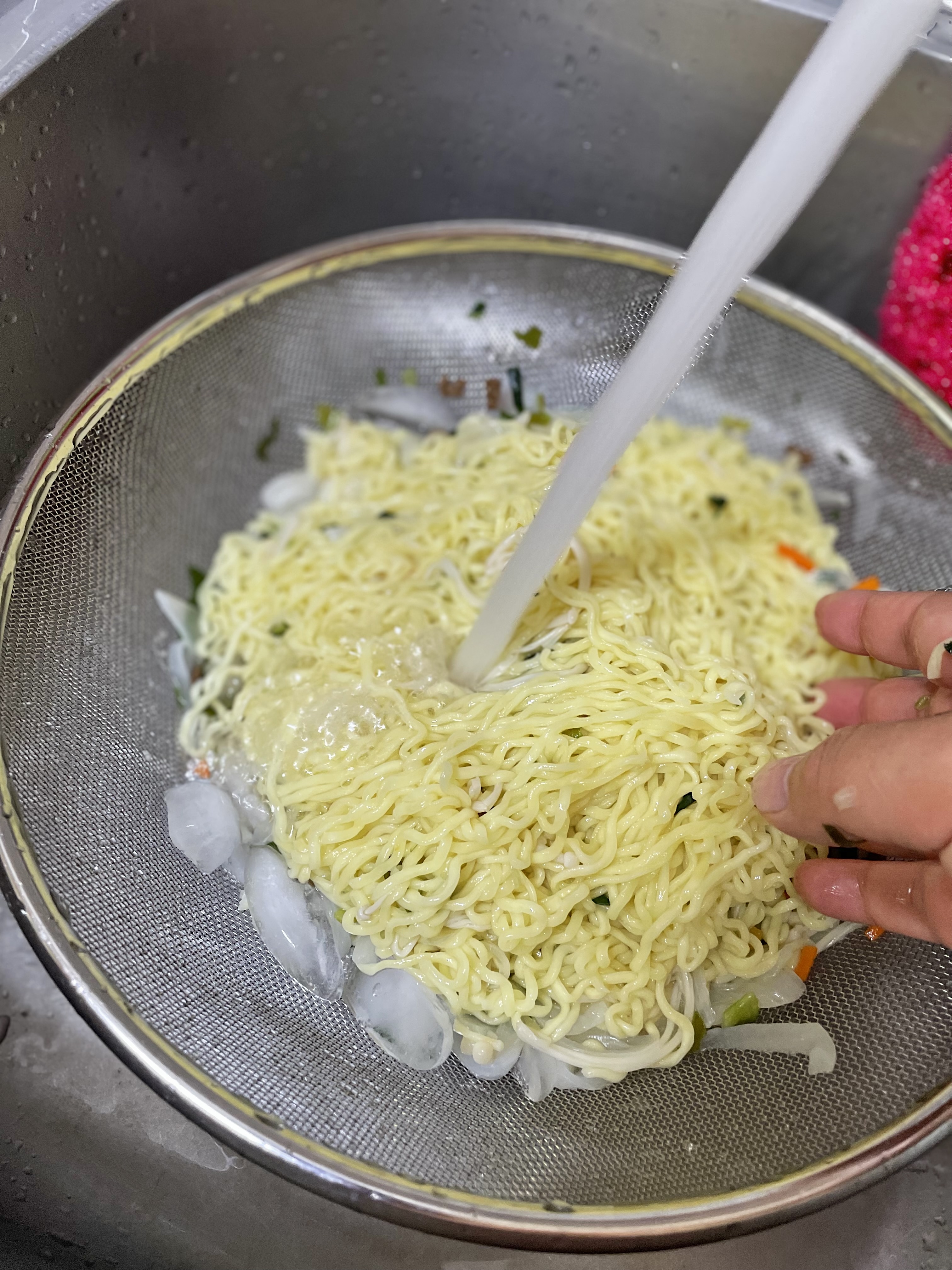 면이 미지근하면 맛이 없으니 차가워지도록 얼음도 넣고 함께 헹궈주세요.