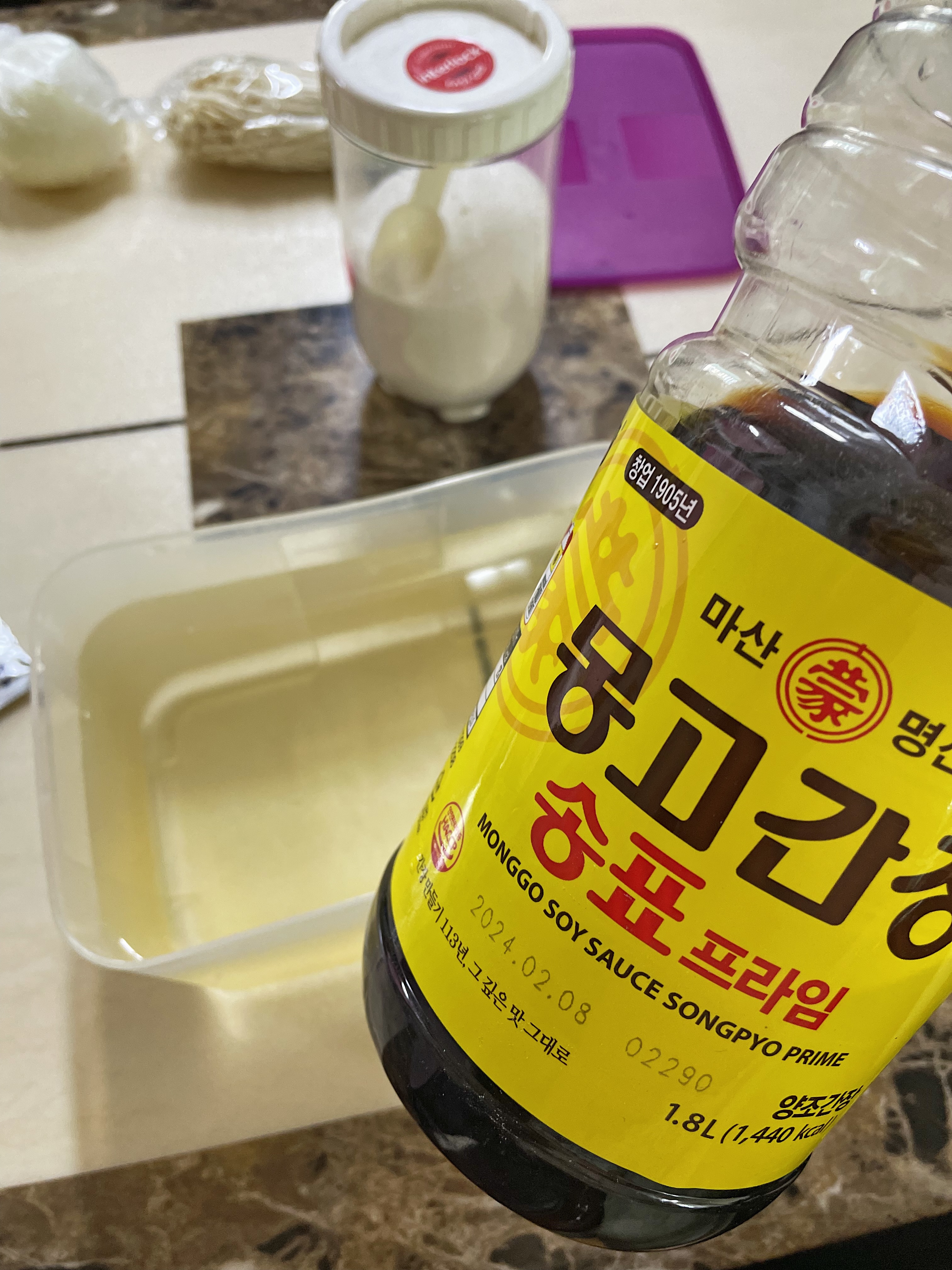 - 양념(숟가락계량) : 라면스프(1), 간장(2), 식초(2), 설탕(2), 물(2컵 반)