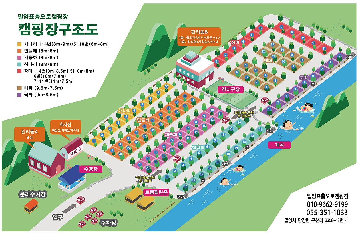 입구 가까운 쪽 개나리, 민들레, 채송화, 참나리 는 모두 8m x 8m 사이즈로 총 70개의 사이트가 있습니다.