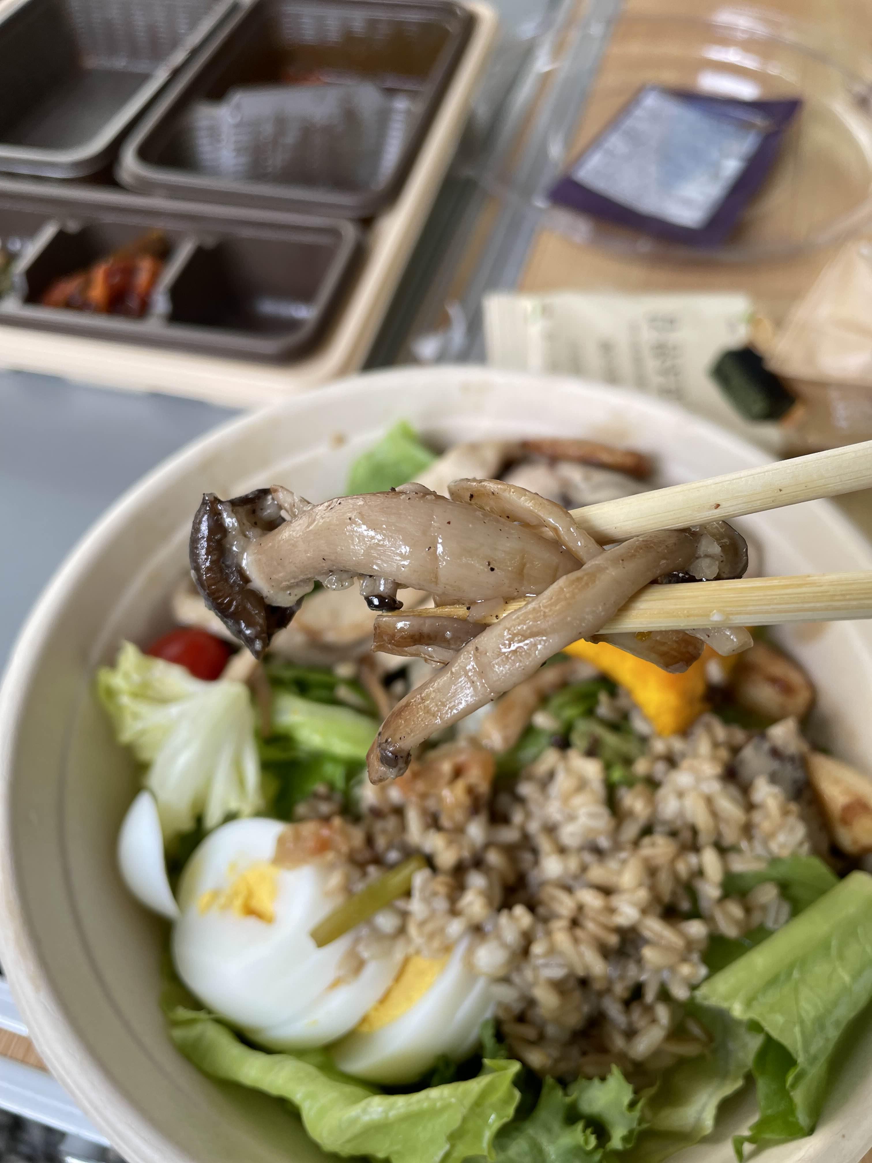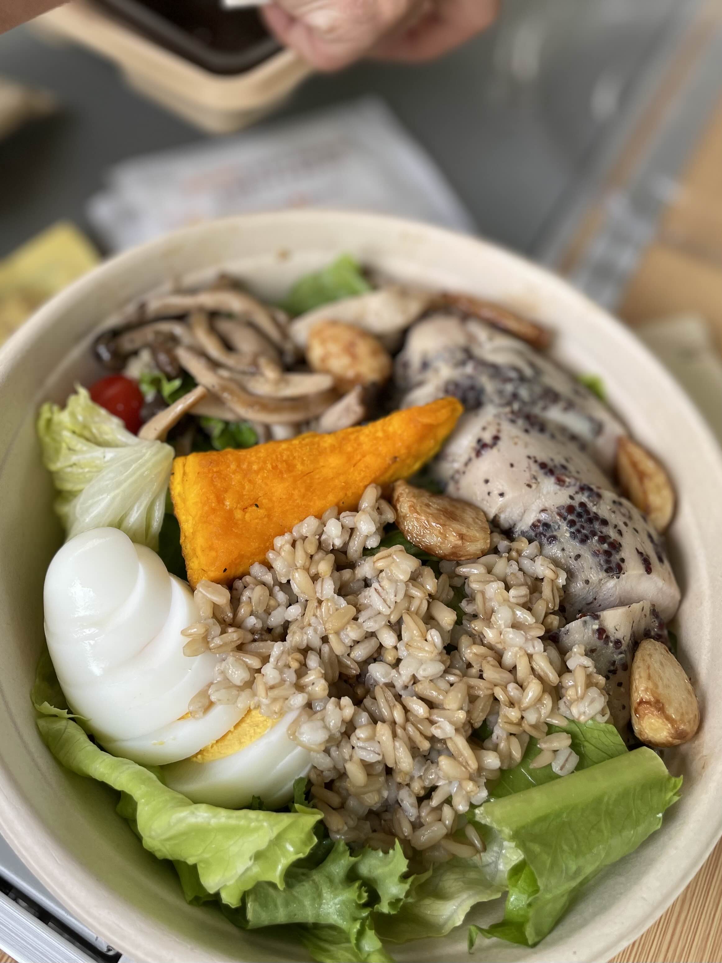삶은 계란과 버섯, 귀리 보리밥, 수비드 닭가슴살에 샐러드를 베이스로 한 도시락이었는데,