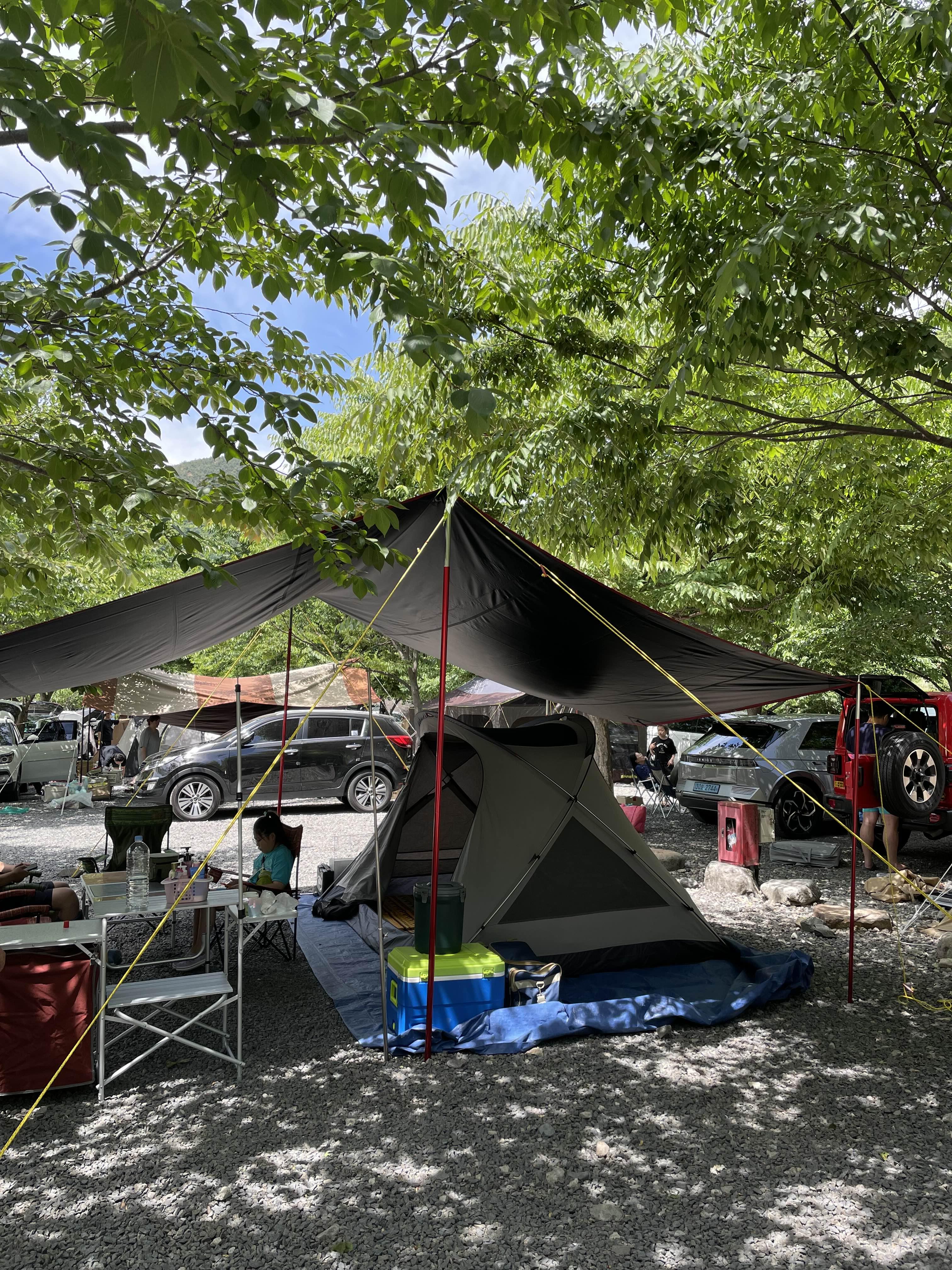차례차례 팩을 박고 사이드 폴대를 세워서 타프 설치를 마무리해 줍니다.