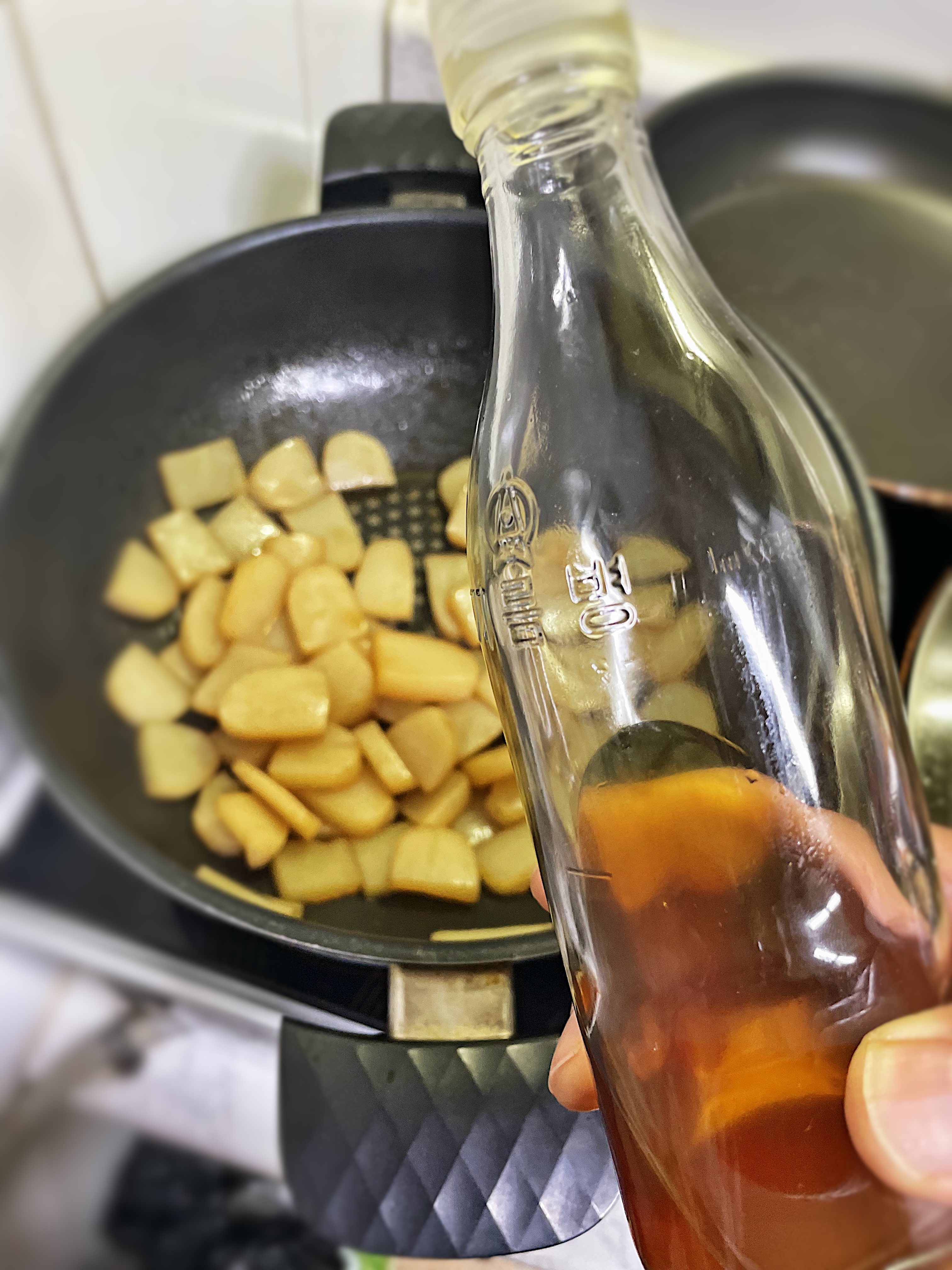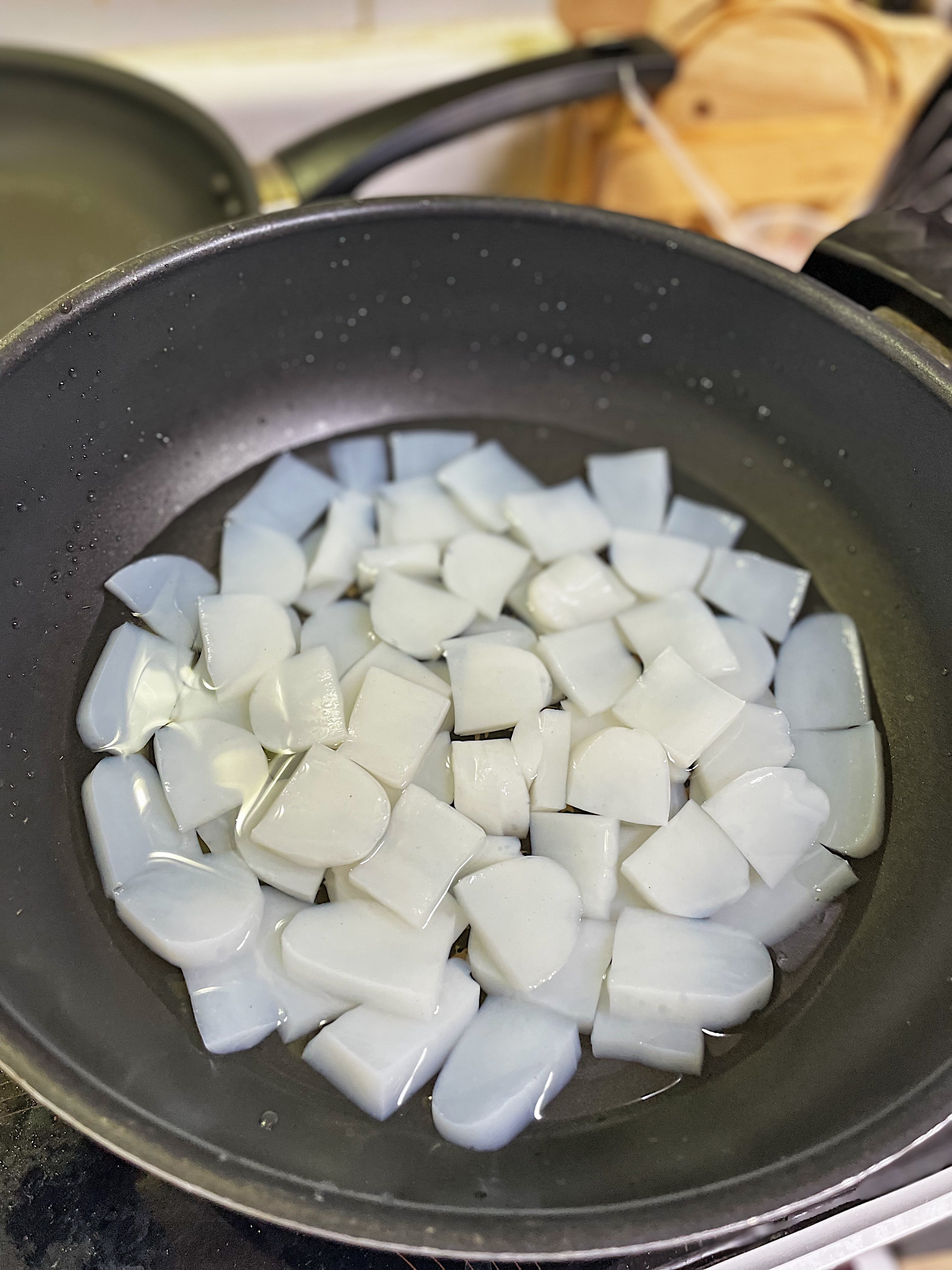 물을 자박하게 담고 식초(2) 를 넣어준 다음 1~2분 정도 데쳐서 곤약 특유의 향을 날려줍니다.