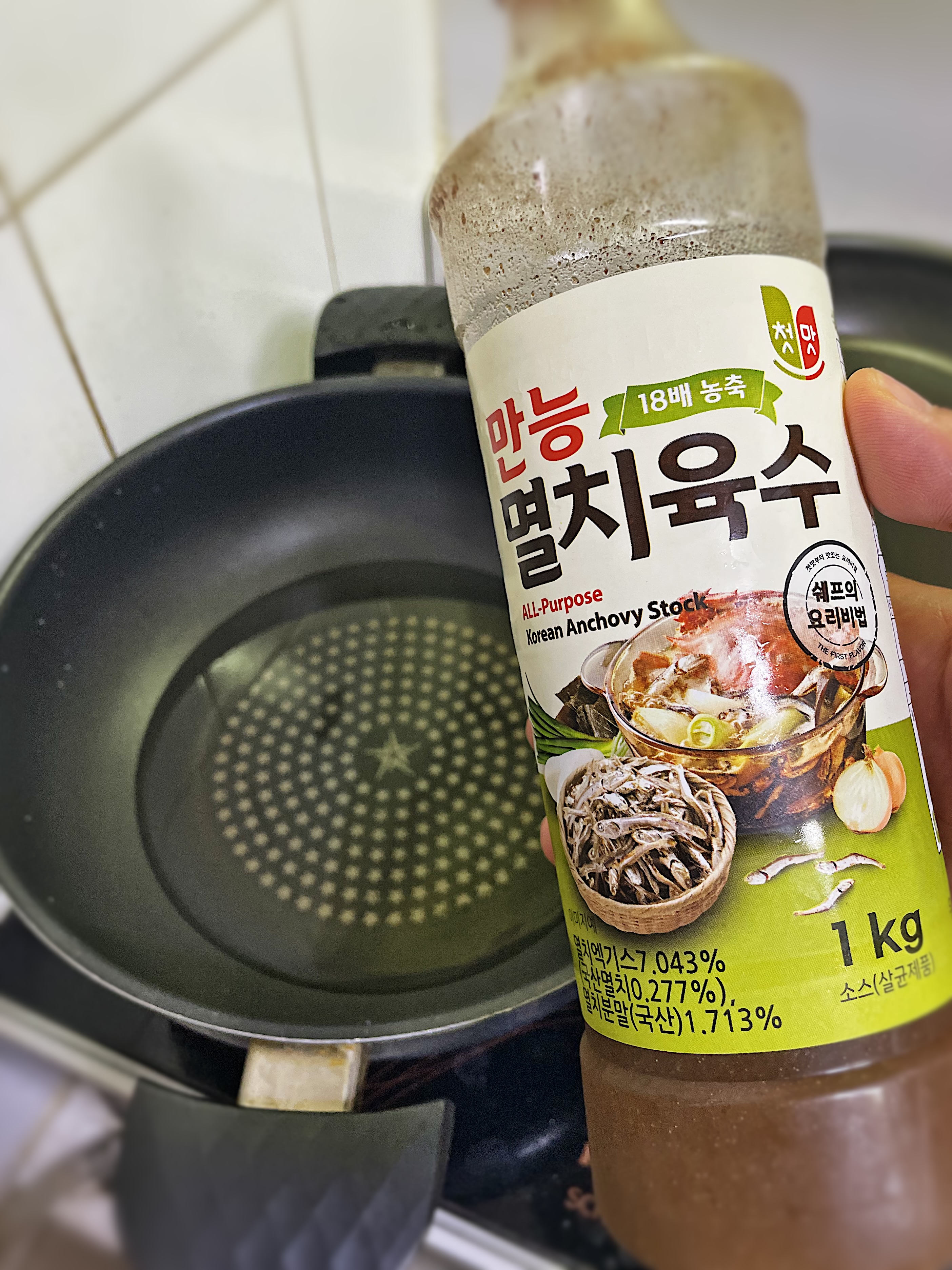 냄비에 물 두컵(500ml) 를 붓고 중불에서 만능 멸치육수(1)을 넣고 간장(5)을 넣어줍니다.