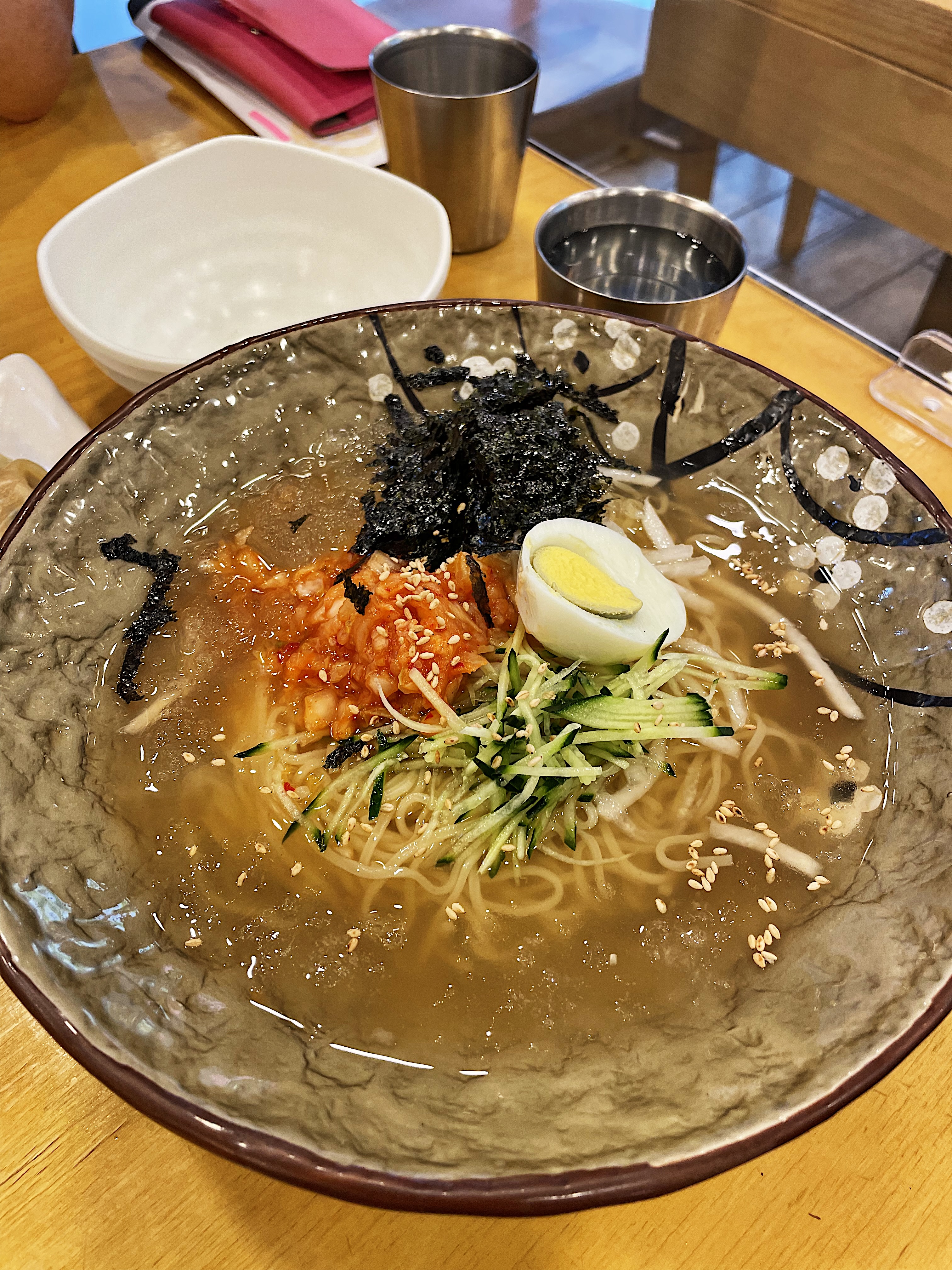 냉국수에는 상큼한 오이와 새콤한 신김치, 김, 삶은 계란 반개가 올려져 있습니다.