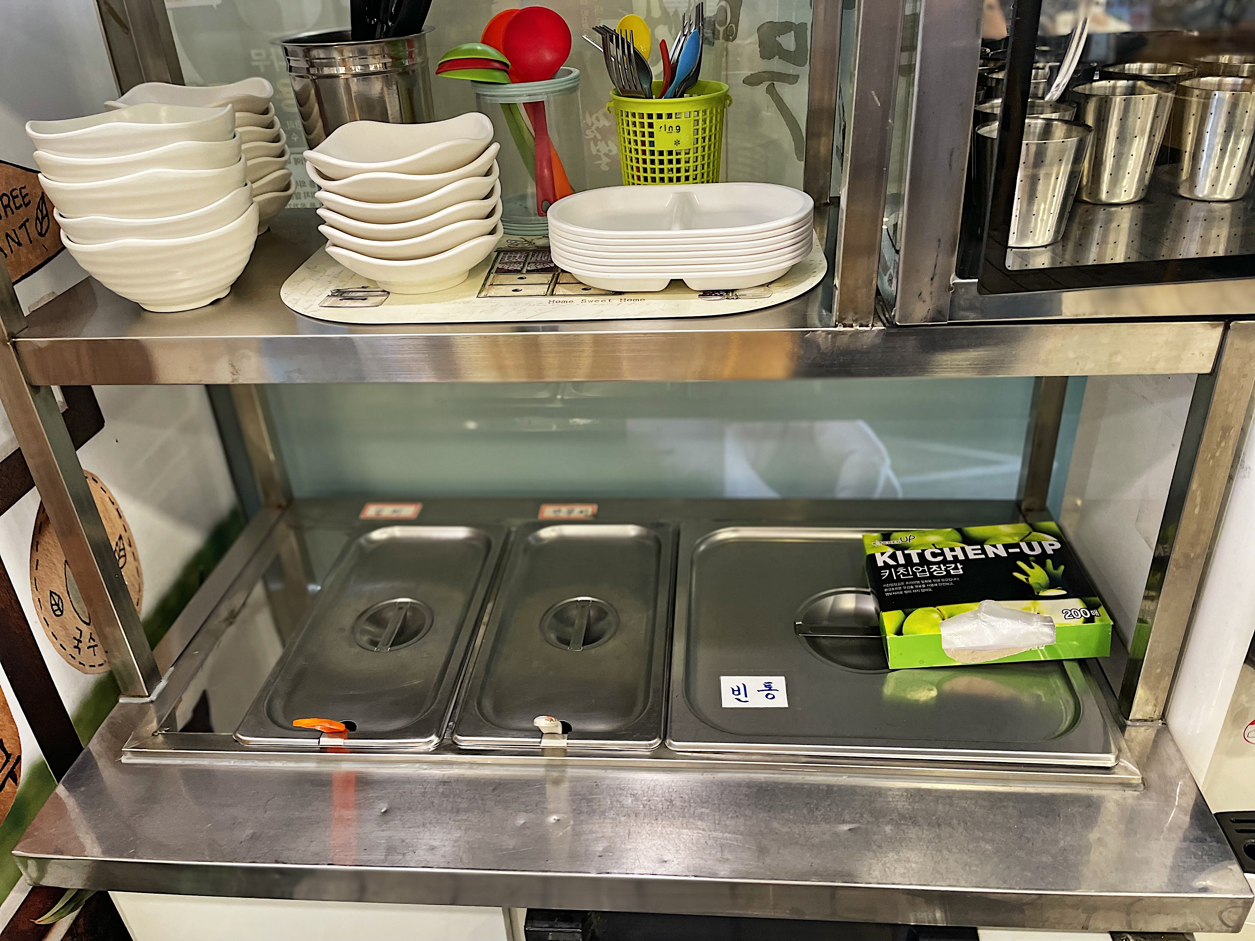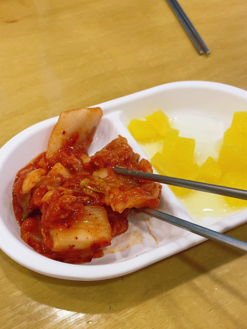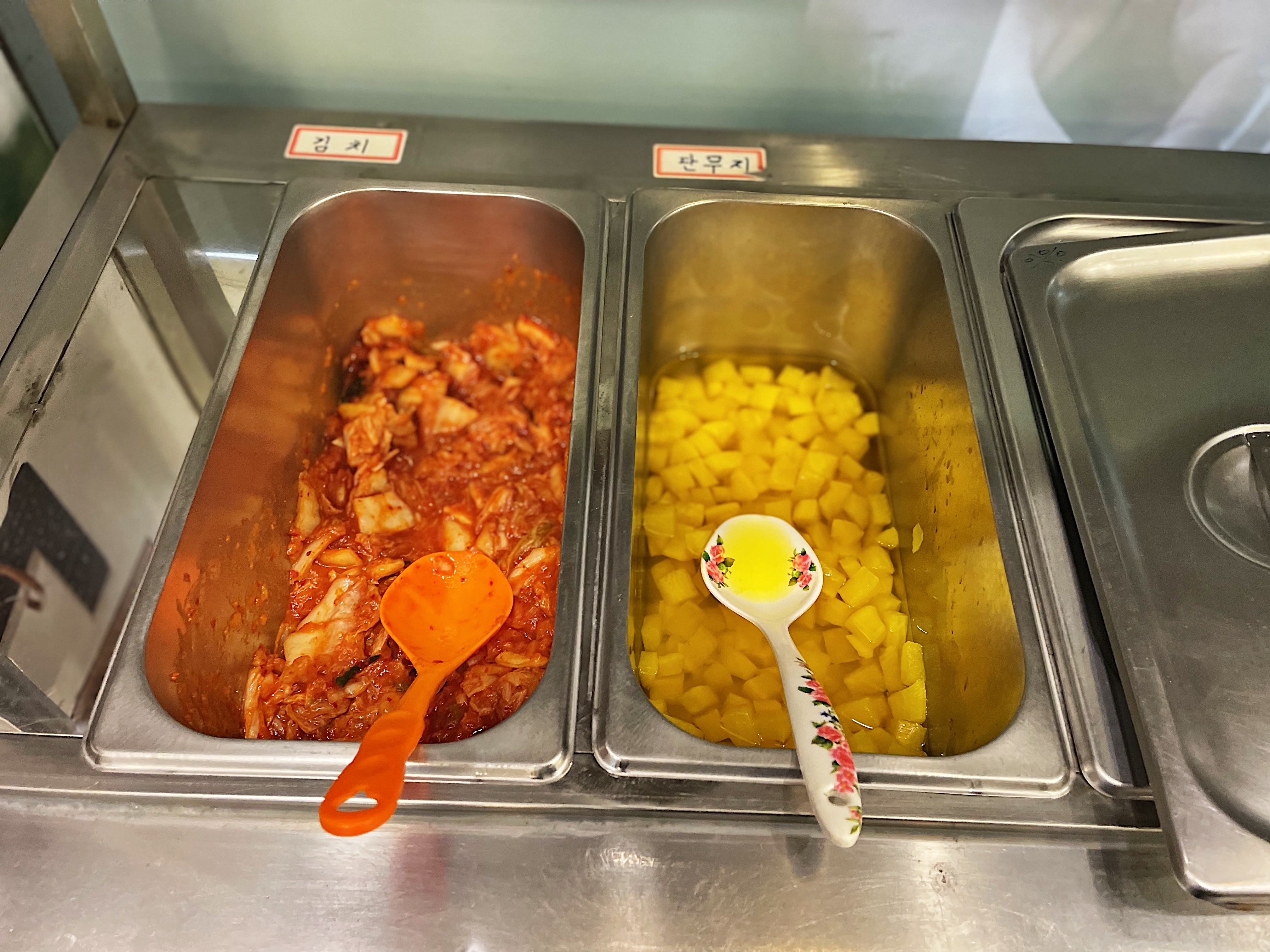 매장 한쪽에는 셀프바가 있어 뭐가 있나 살펴보니 김치와 단무지만 조촐하게 두 통 담겨 있네요.