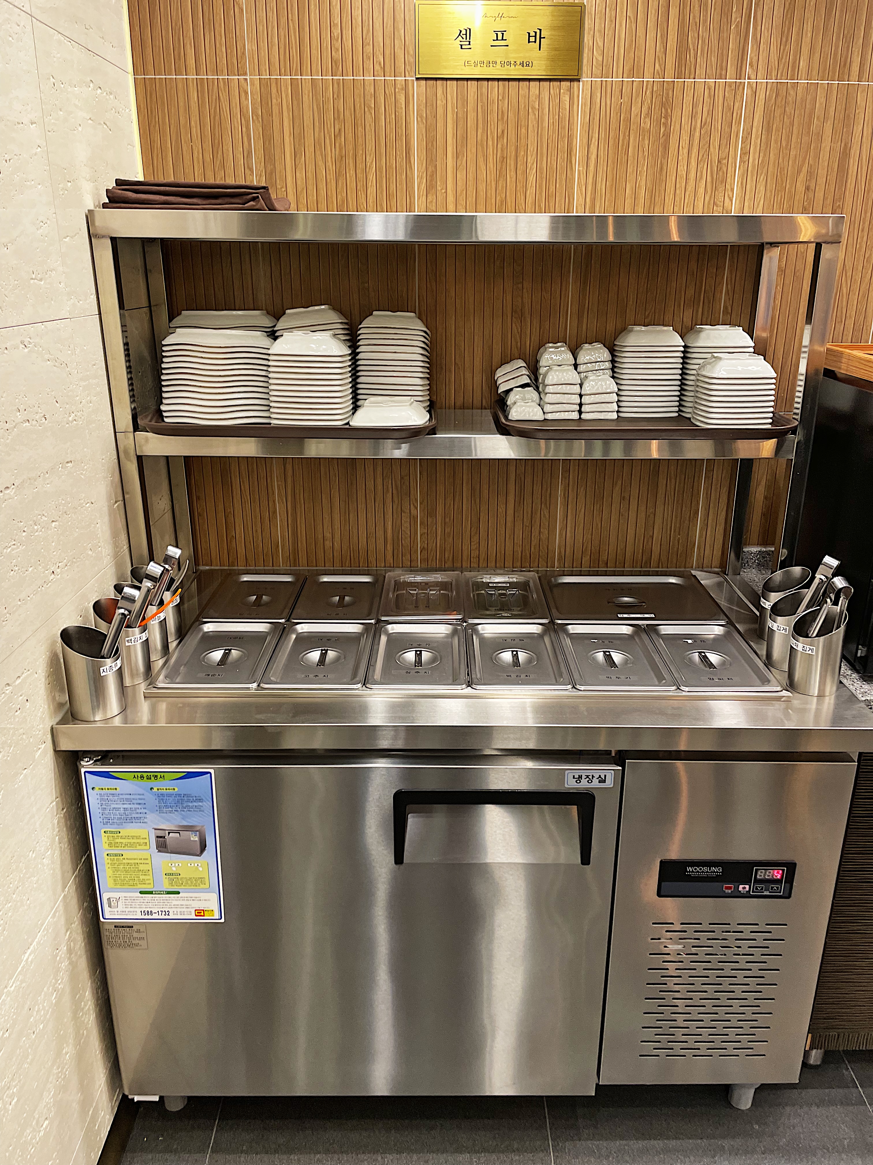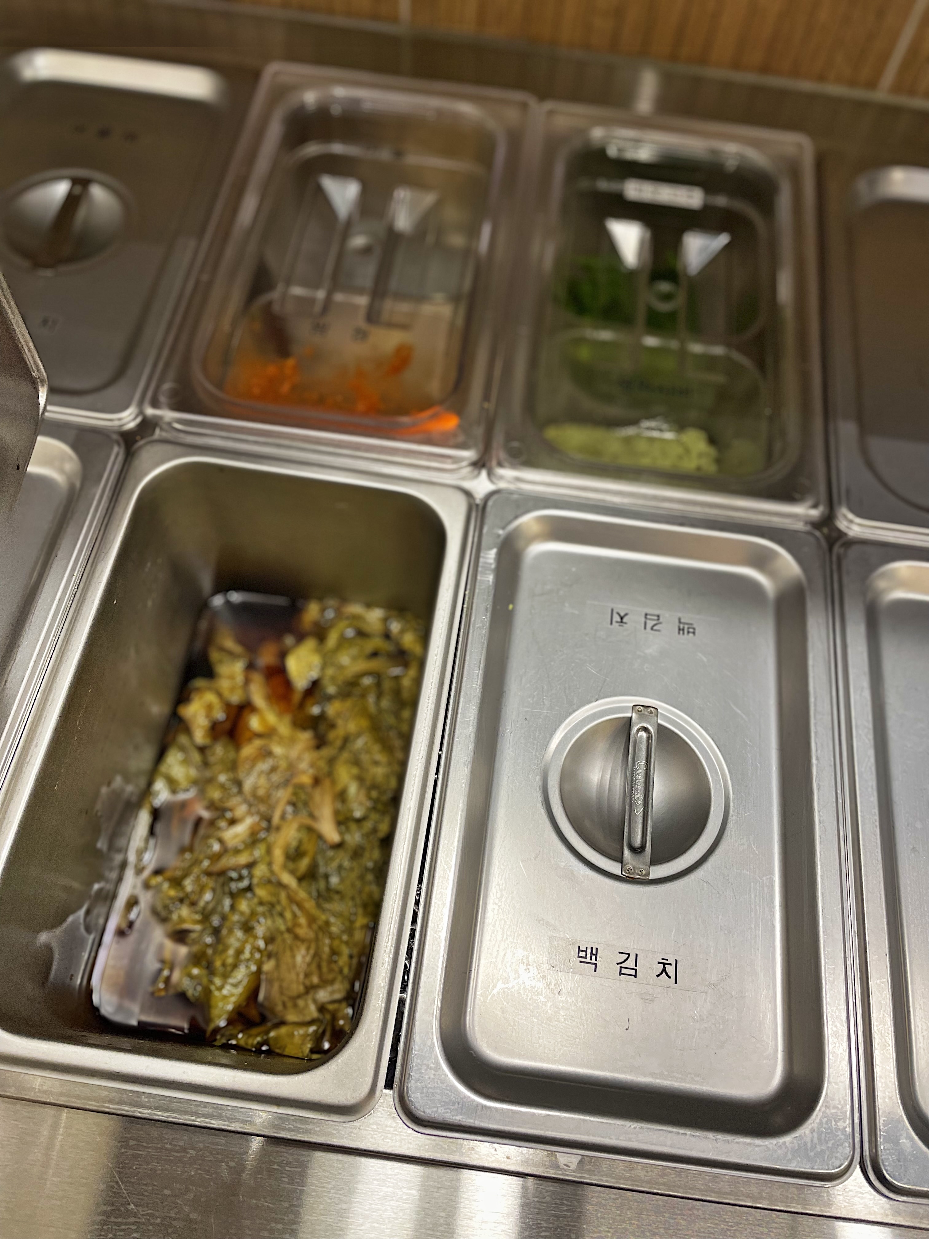 셀프바에는 다양한 종류의 반찬이 각각 칸으로 분리되어 뚜껑을 덮어놓았으며,