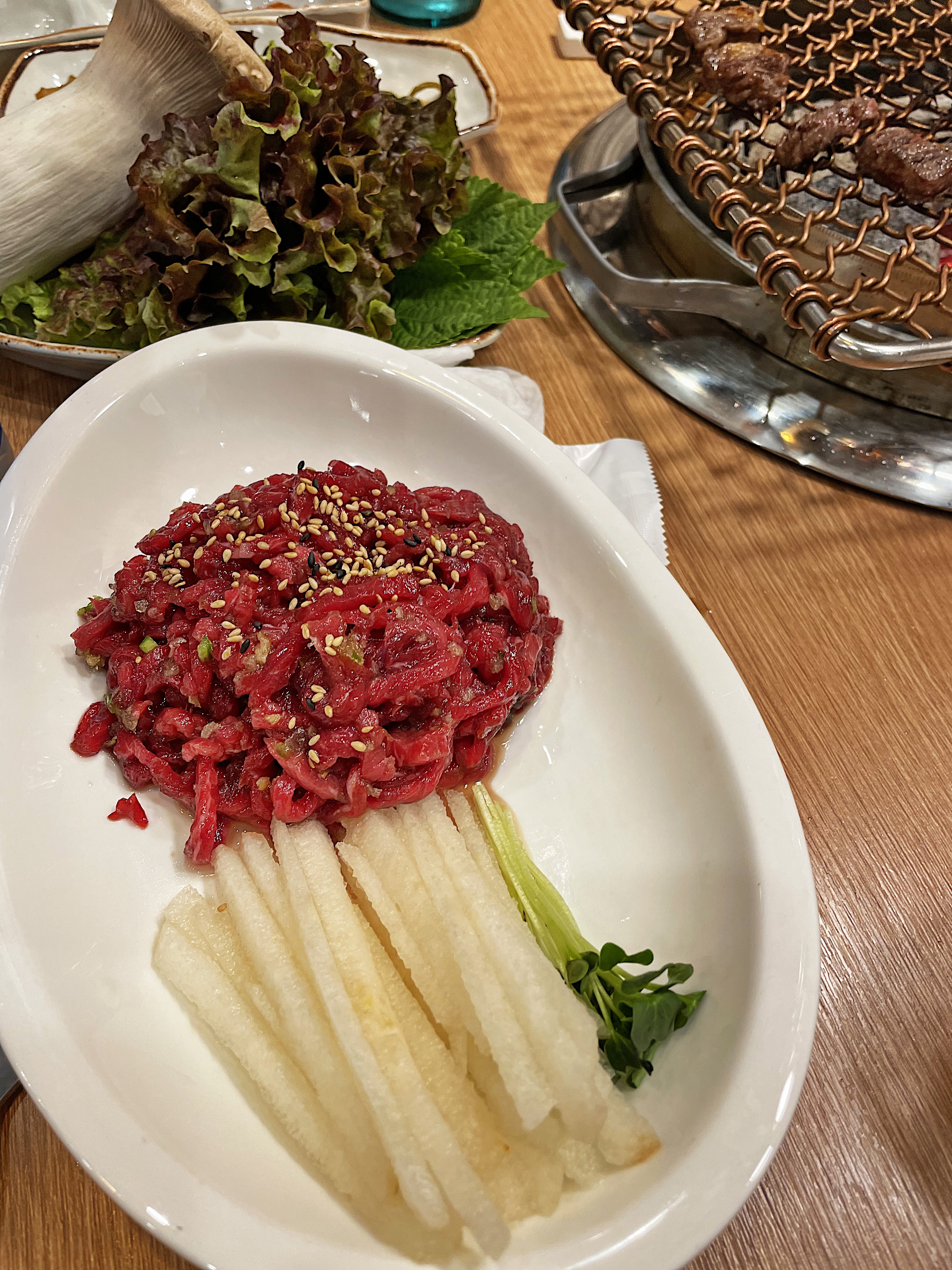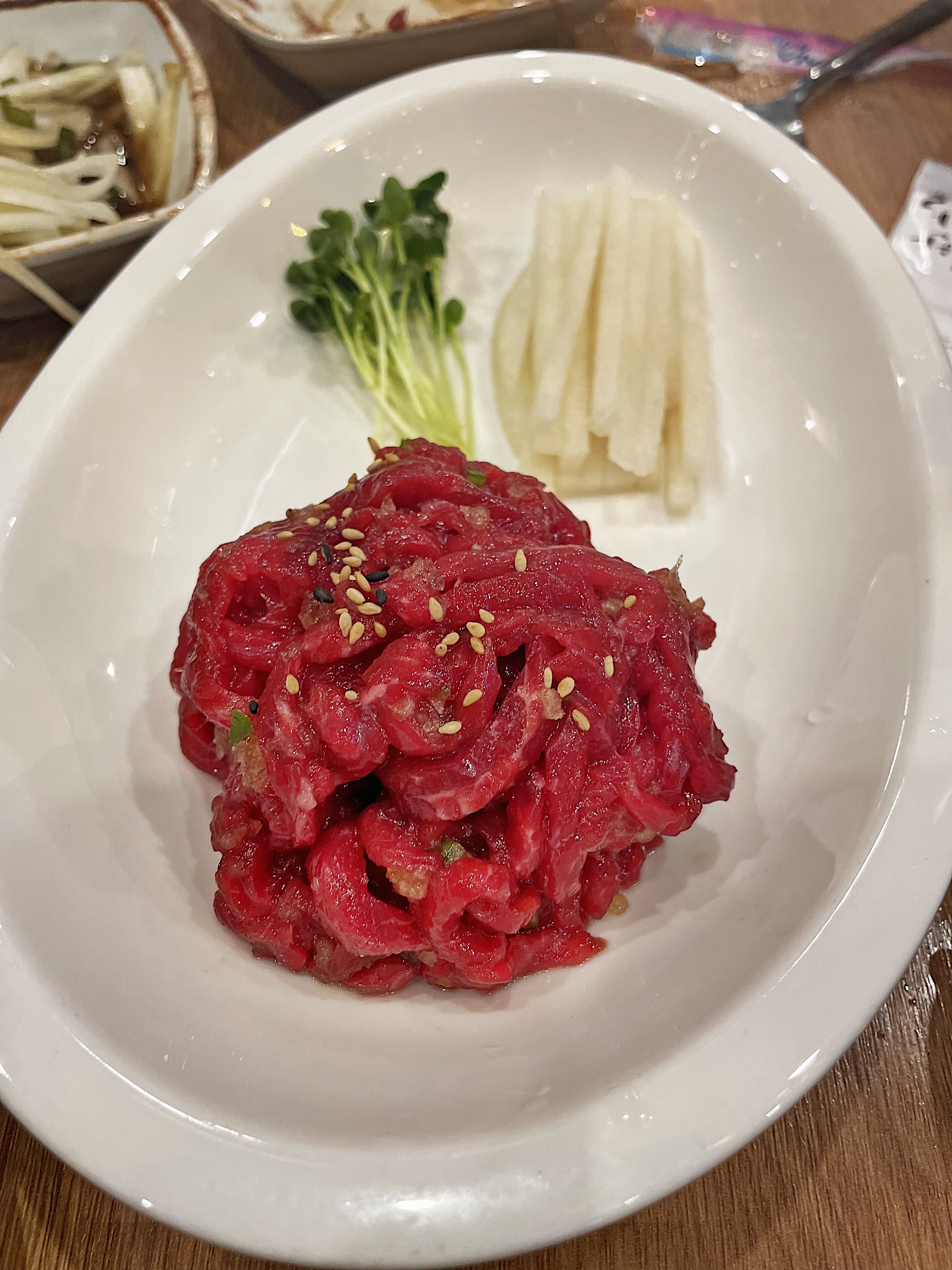 육회에는 채 썬 배와 무순이 함께 접시에 담아져 나왔는데, 잘 기억나지 않지만 계란 노른자도 별도였던 거 같아요.