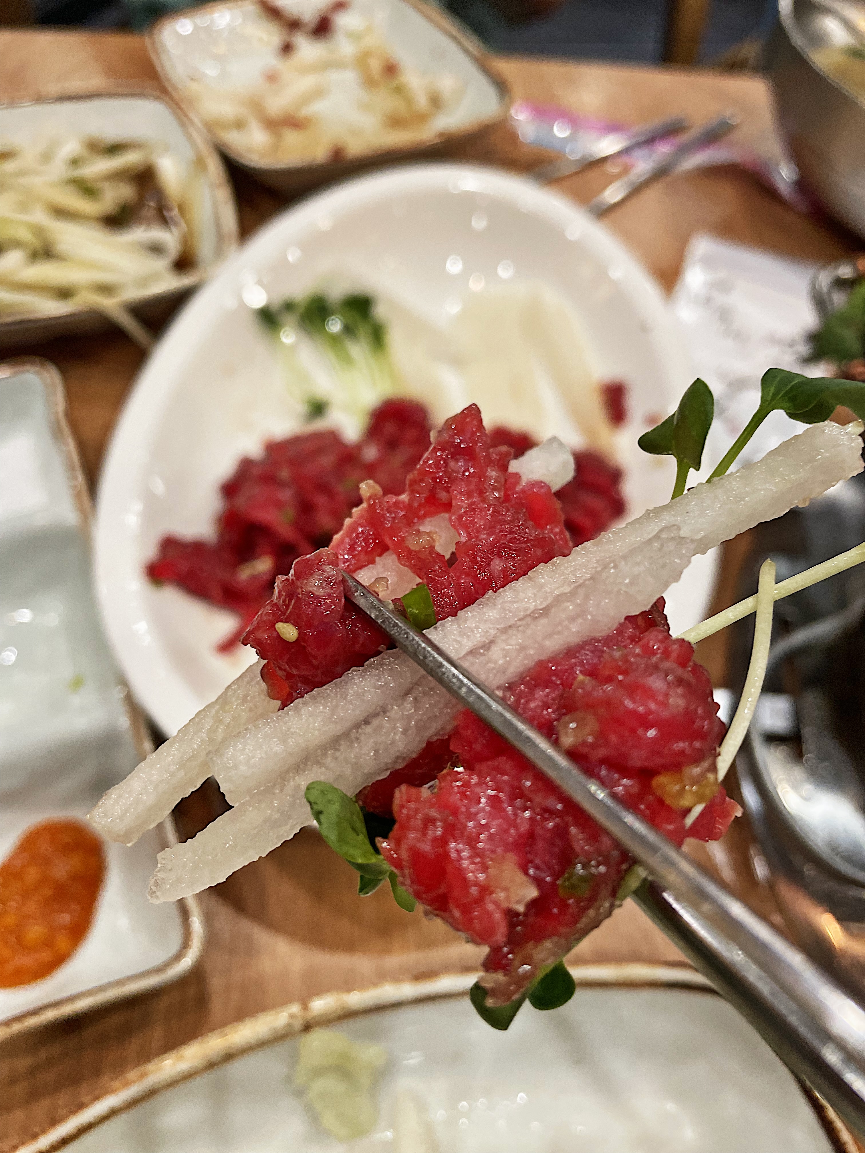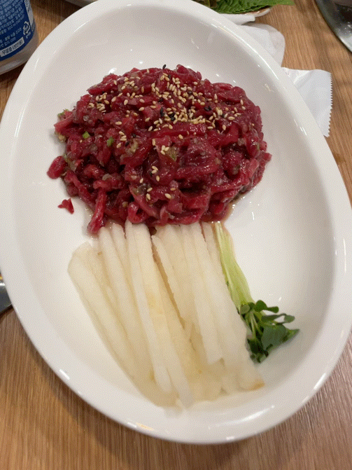 아이들이 육회를 잘 먹길래 겨우 한 젓가락 얻어먹어봤습니다.