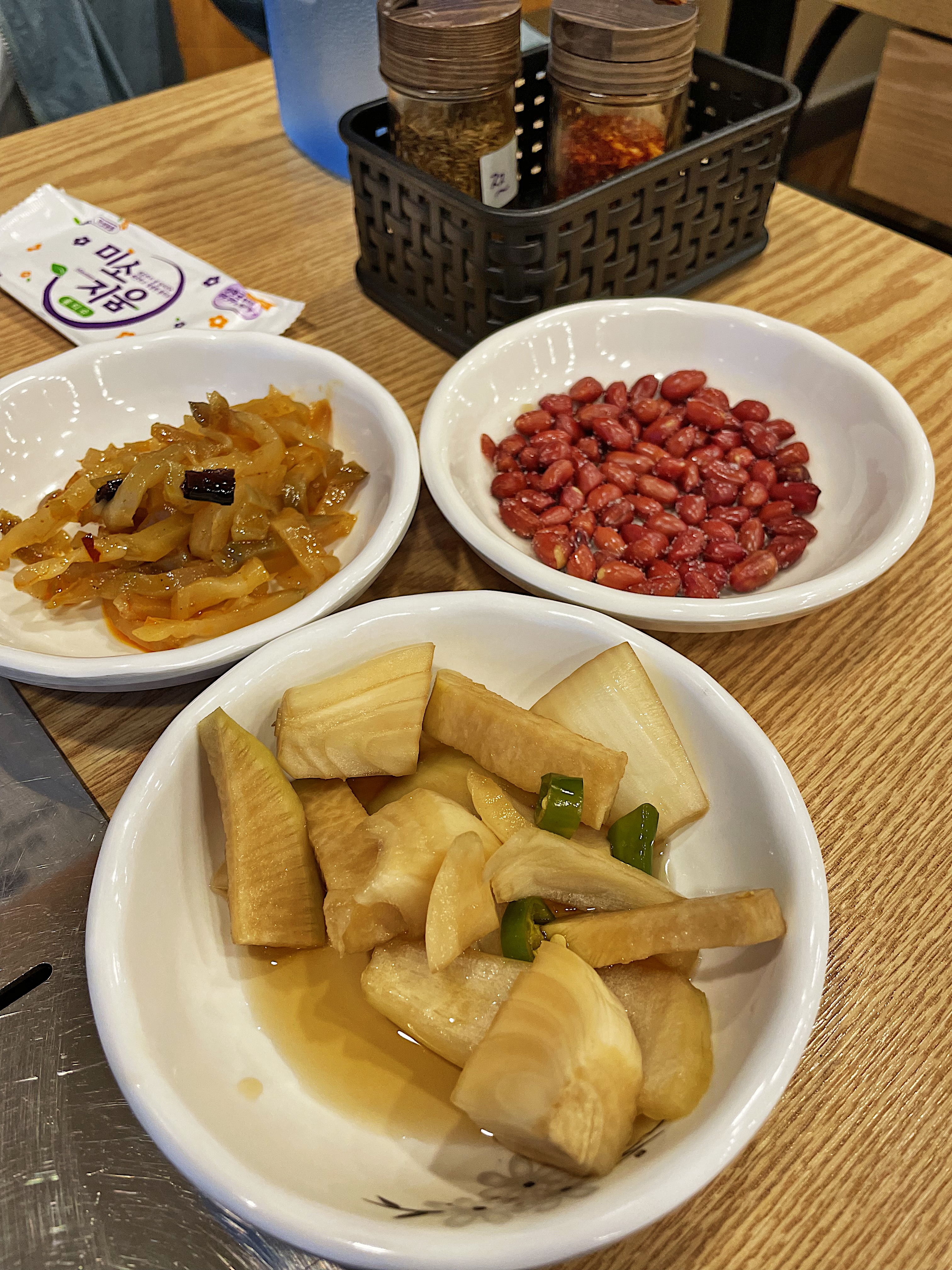 기본 반찬으로는 양파 절임, 땅콩, 그리고 자차이를 내어주고, 테이블에는 쯔란, 고춧가루, 소금이 비치되어 있습니다.