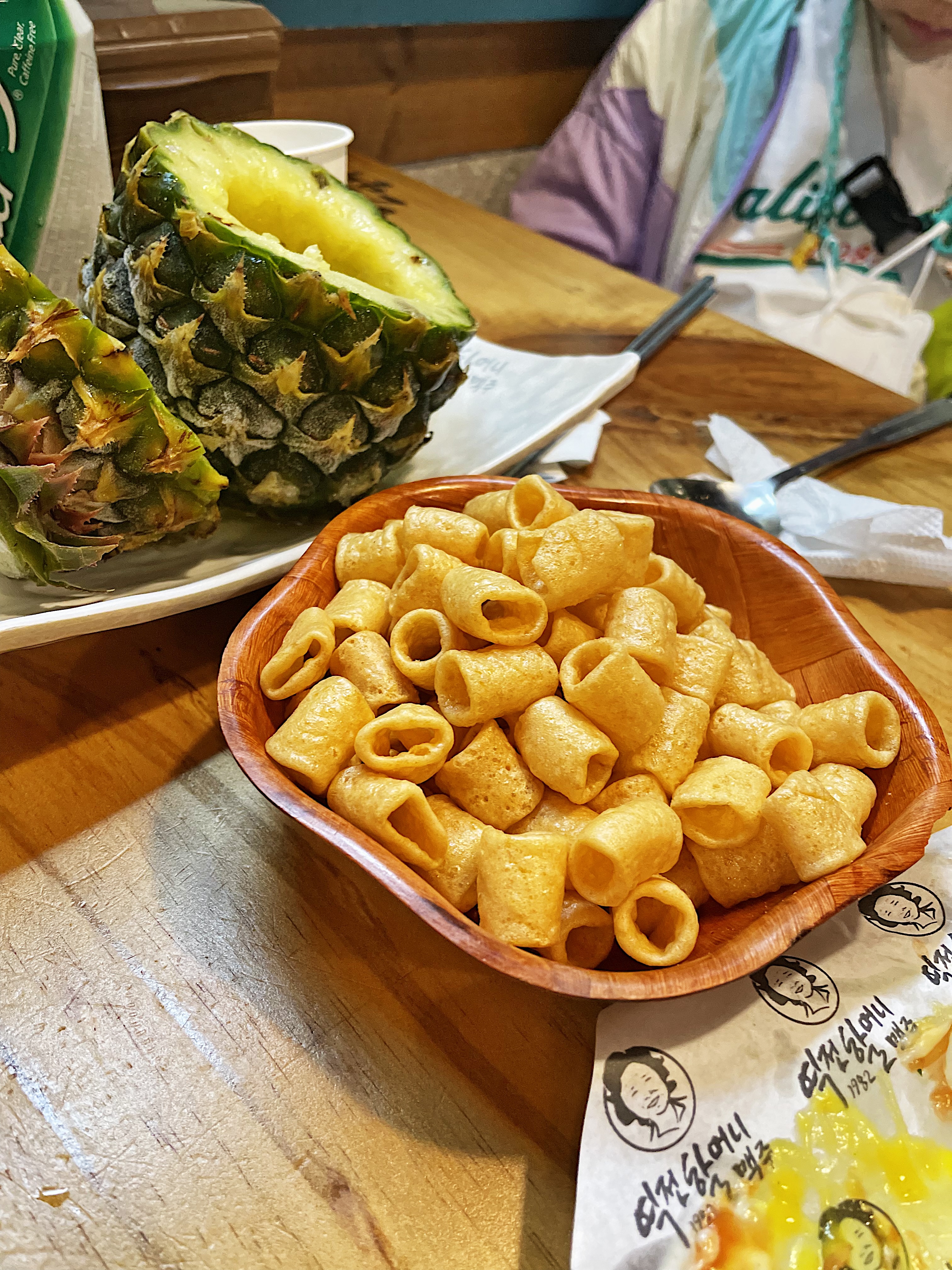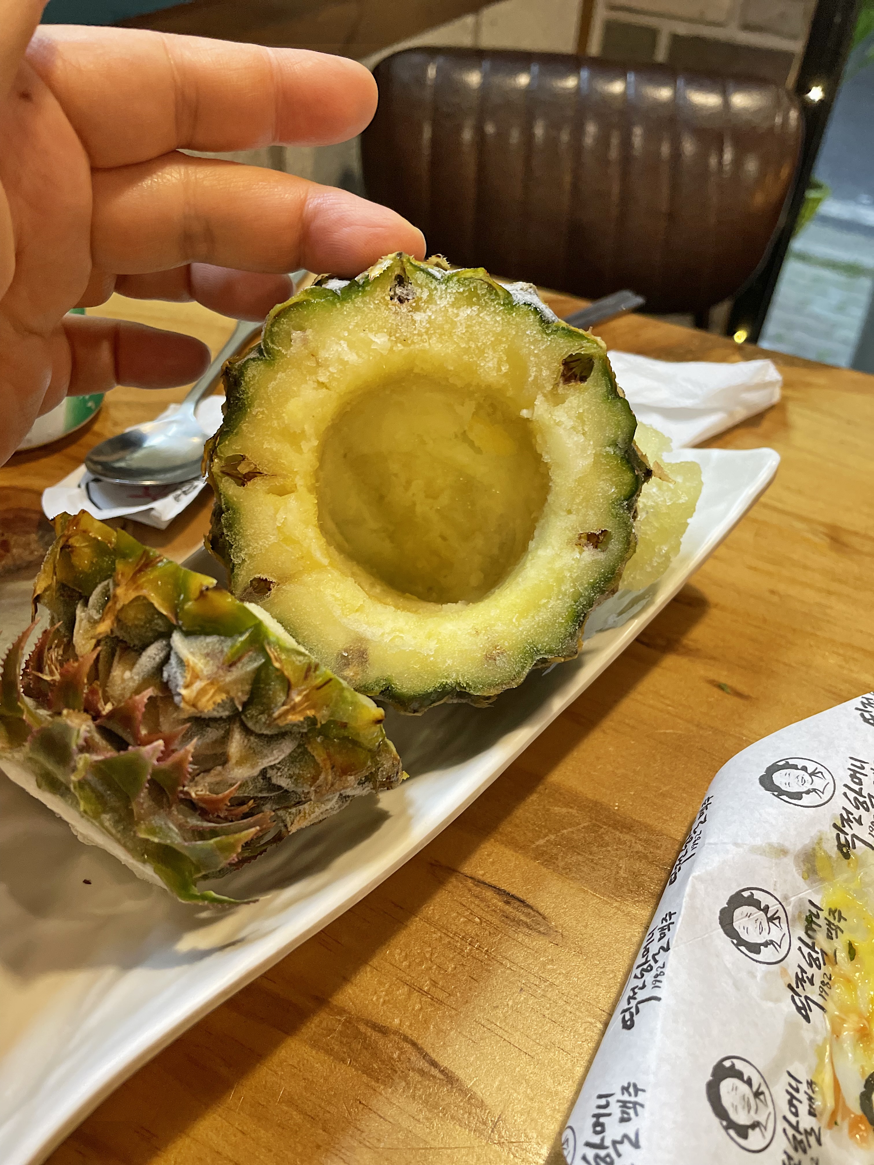 자세히 보니 파인애플 속을 파낸 다음 쿨피스 파인애플맛을 부어서 얼린 것 같아요. (뇌피셜)