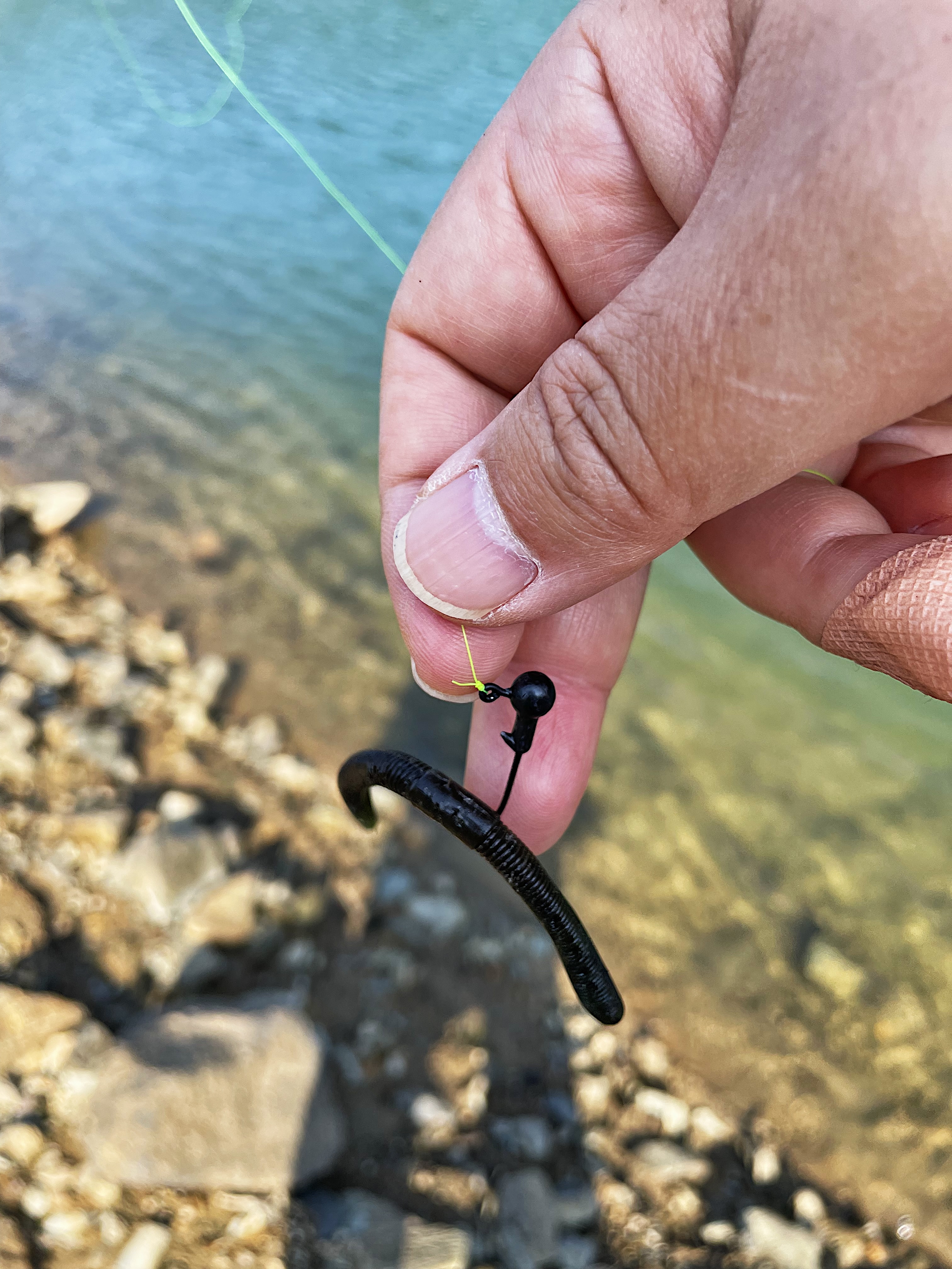 짧게 로드(낚싯대)를 탁탁! 끊어치면(트위칭) 루어가 순간적으로 좌로 우로 휙휙!