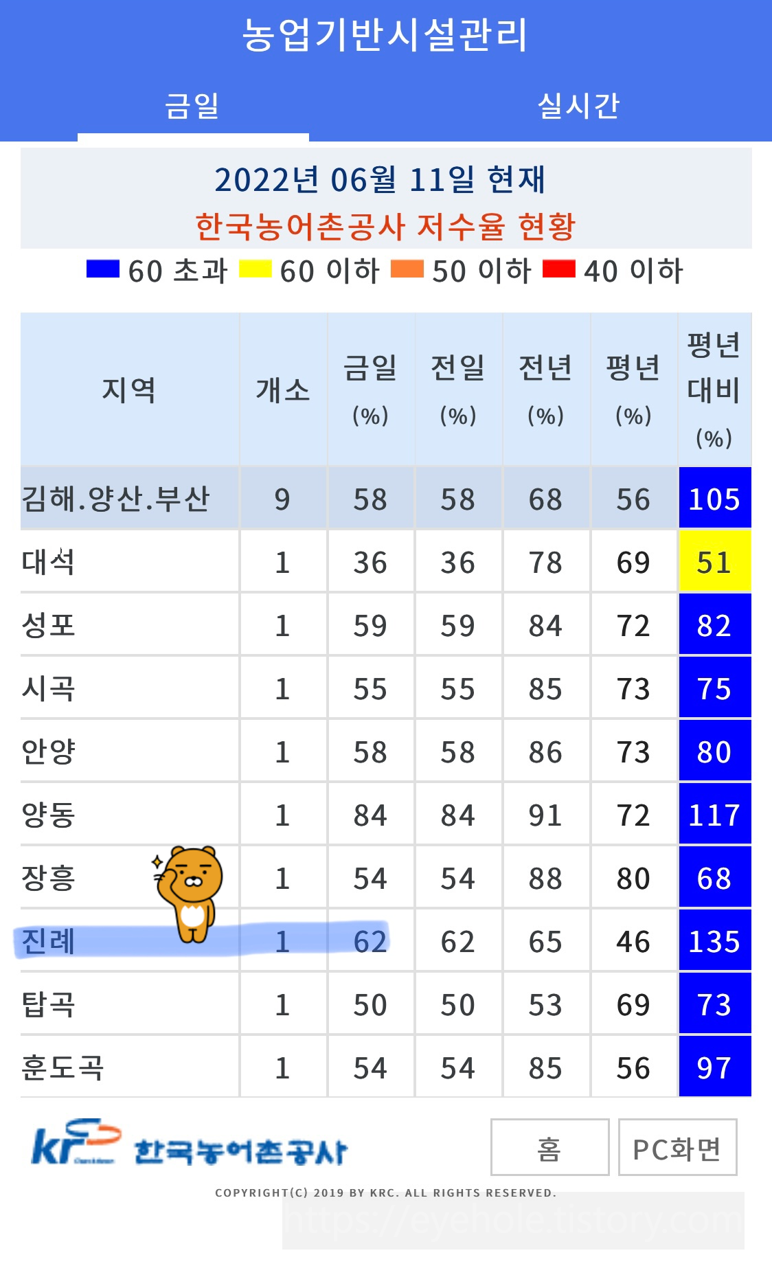 모내기철이 지난 시기라 농어촌공사 사이트를 통해 저수율을 확인해보니 62%입니다.