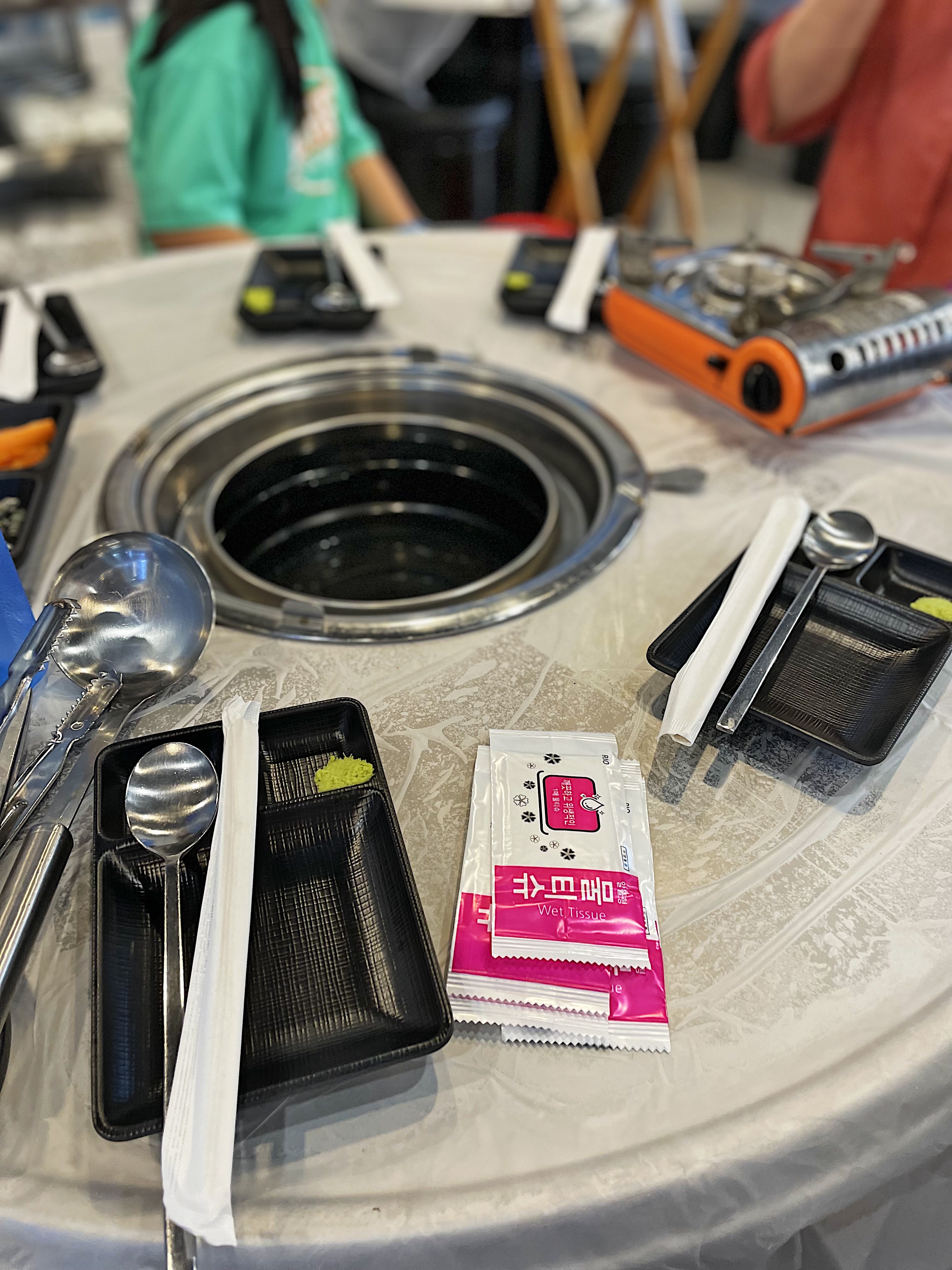 테이블은 뒷고기집 테이블과 비슷한 원형 불판 테이블에 의자 속에 물건을 보관할 수 있는 구조입니다.