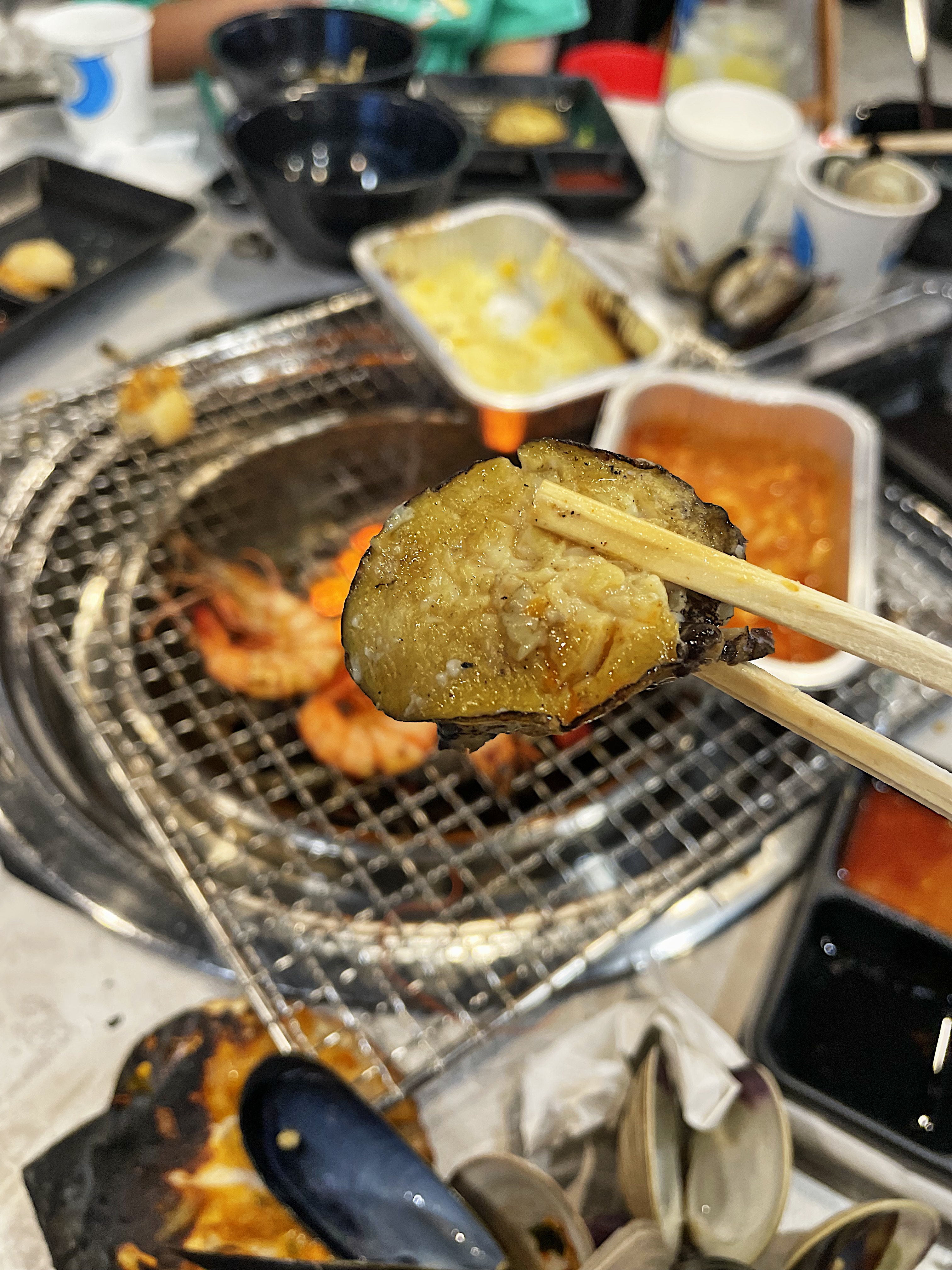 가운데에는 조개를 굽다 보니 불판의 바깥쪽에는 치즈가 익을 공간이 부족했습니다.
