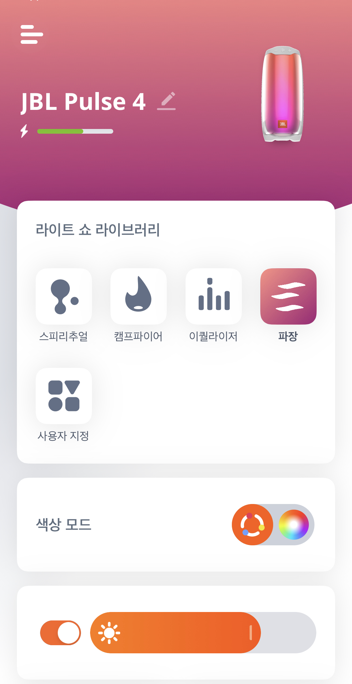 뿐만 아니라 전용 어플인 JBL Portable 을 통해 사용자가 원하는 조명의 색상과 패턴을 생성할 수도 있고,