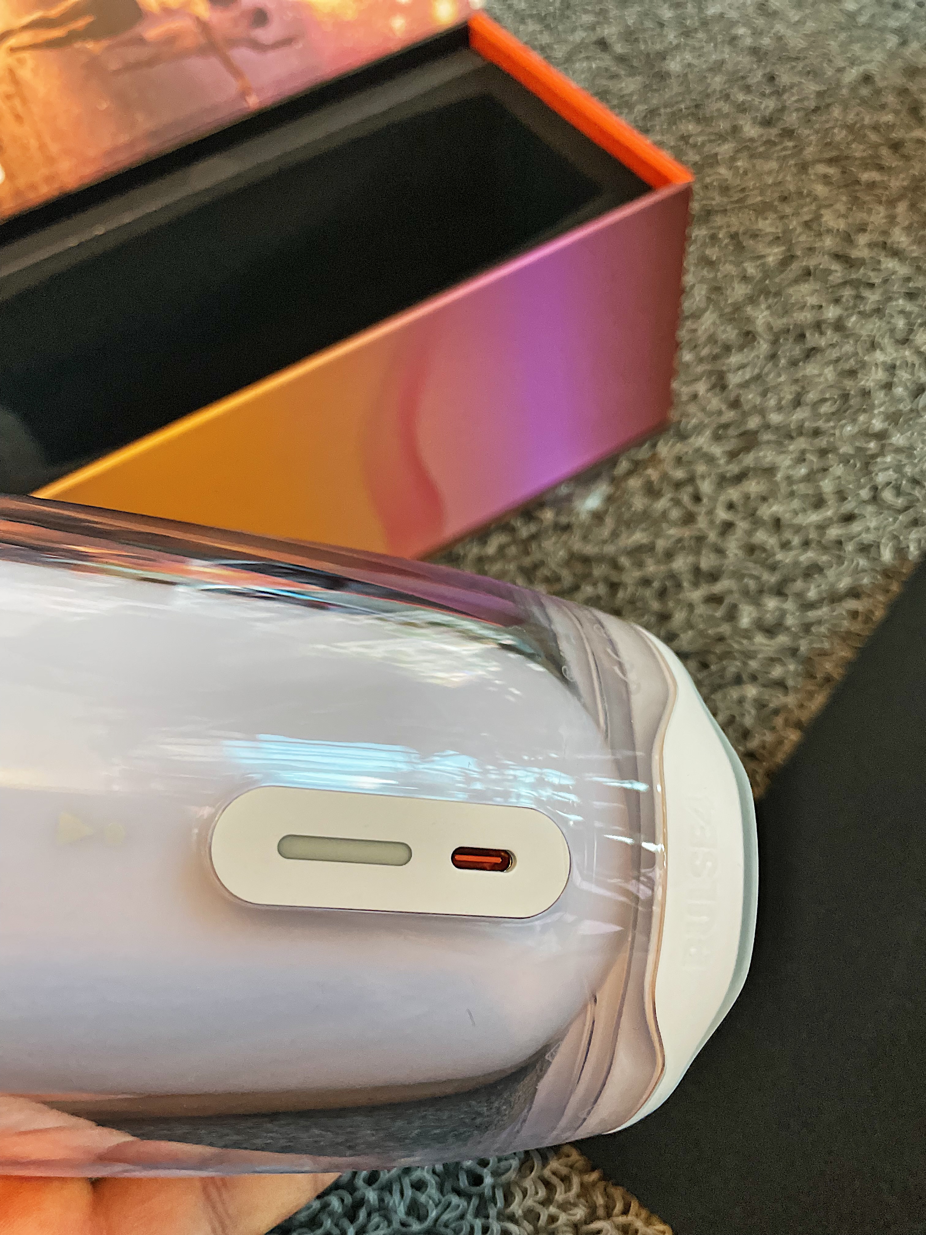 하단 전면에는 빨간 바탕에 흰 글씨로 JBL 로고가 딱! 붙어있고, 뒷면에는 충전단자와 배터리 잔량 표시 램프가 있습니다.