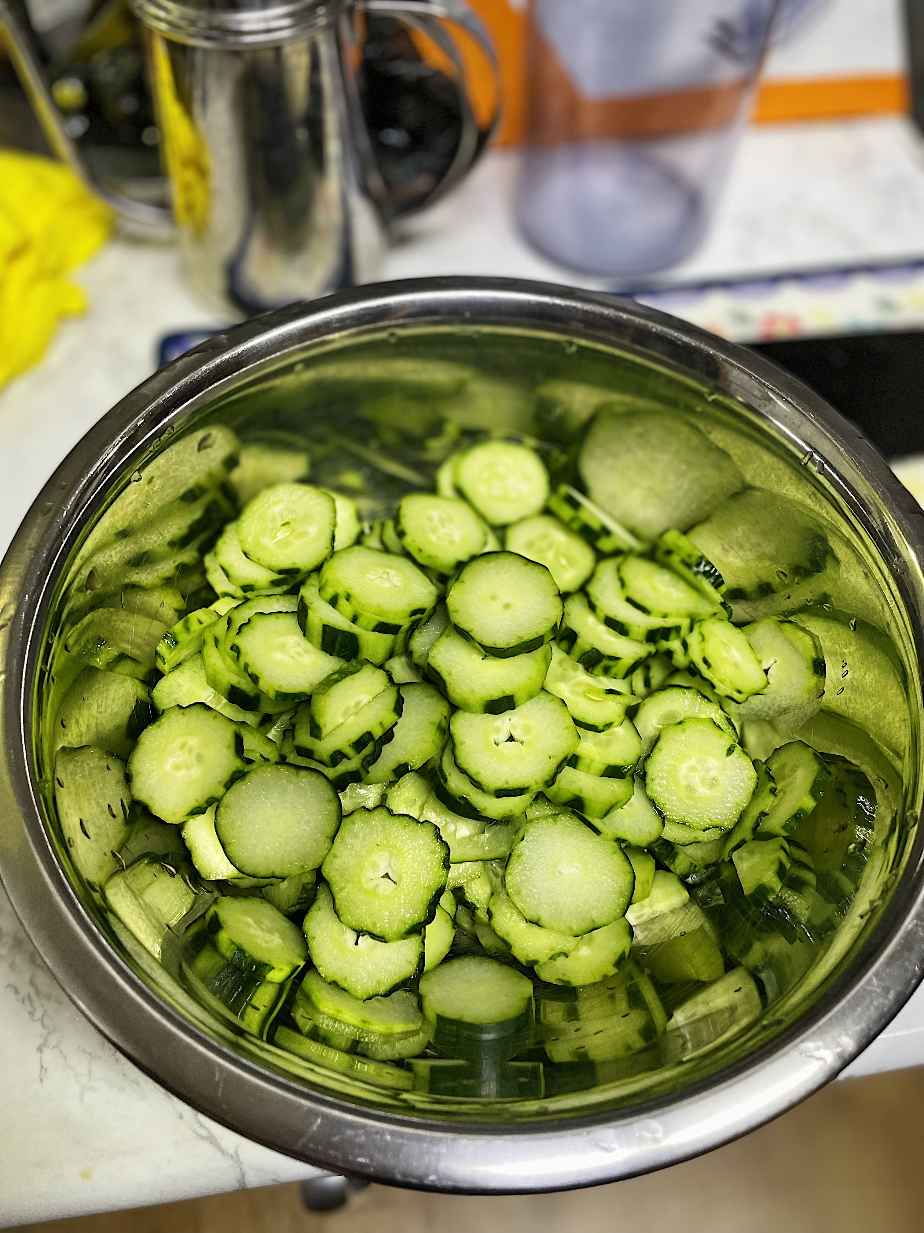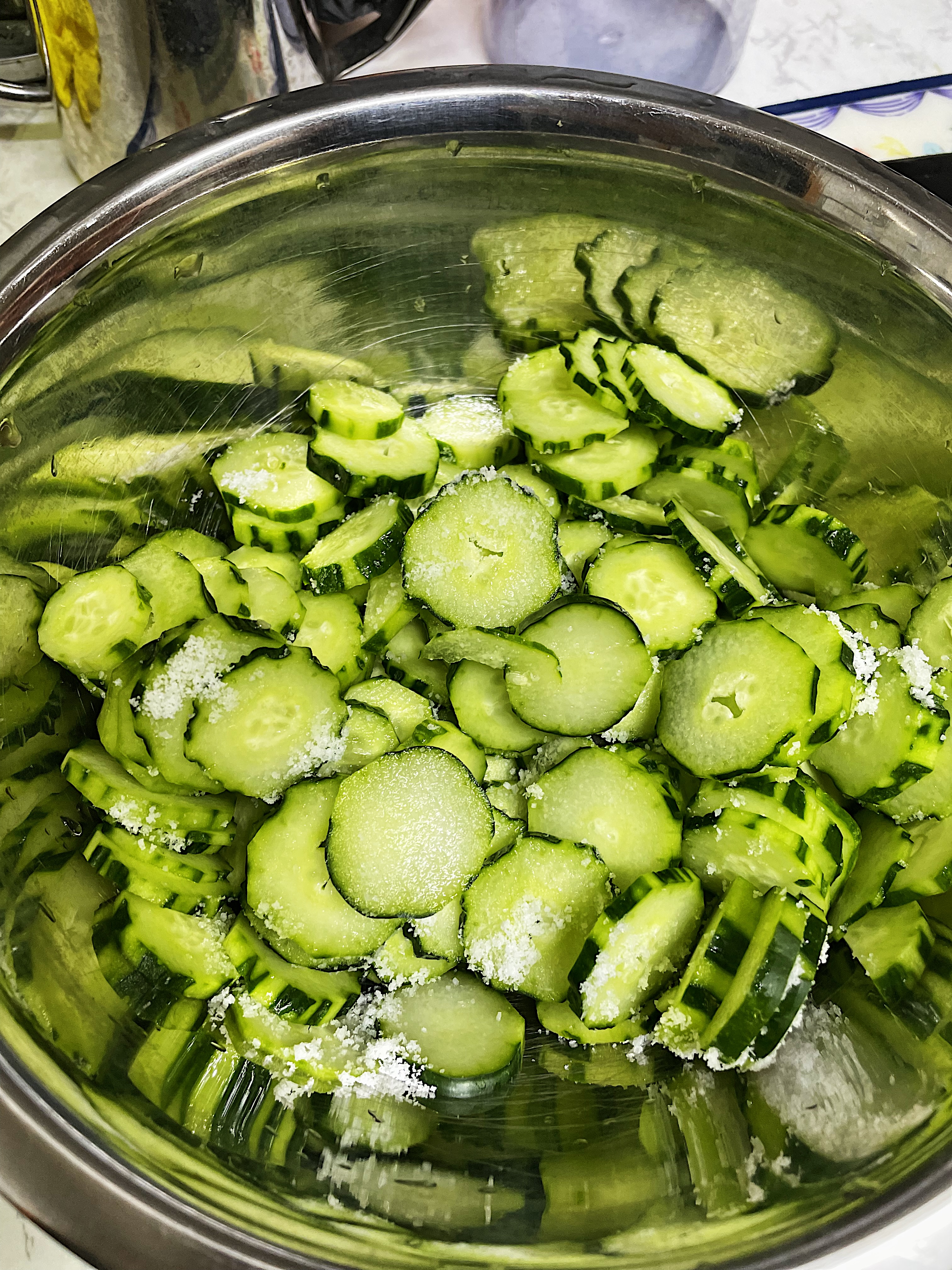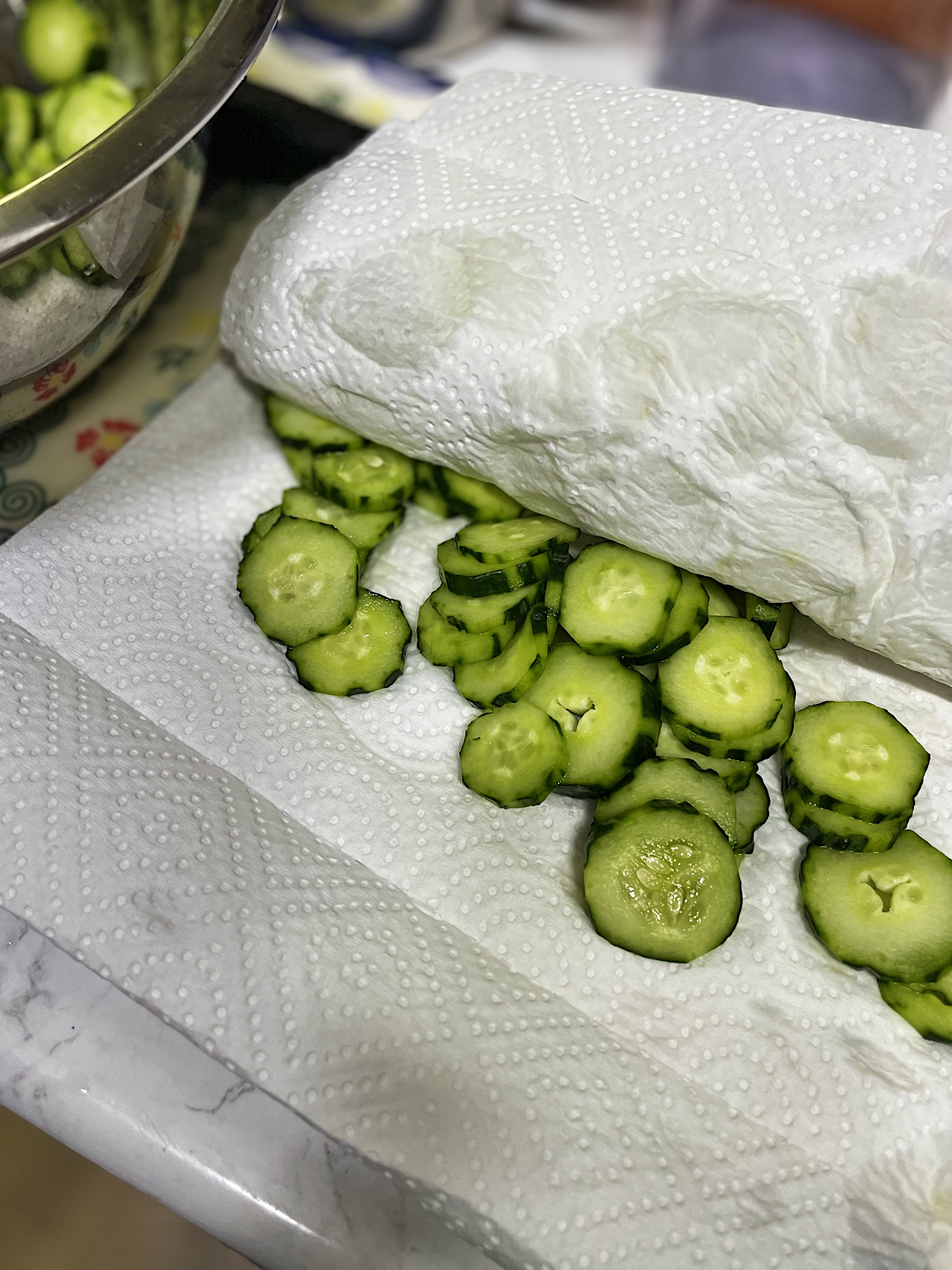 오이 3개를 소금에 빡빡 문질러 씻고, 껍질을 대충 벗긴 다음 얇게 총총총 썰어줍니다.