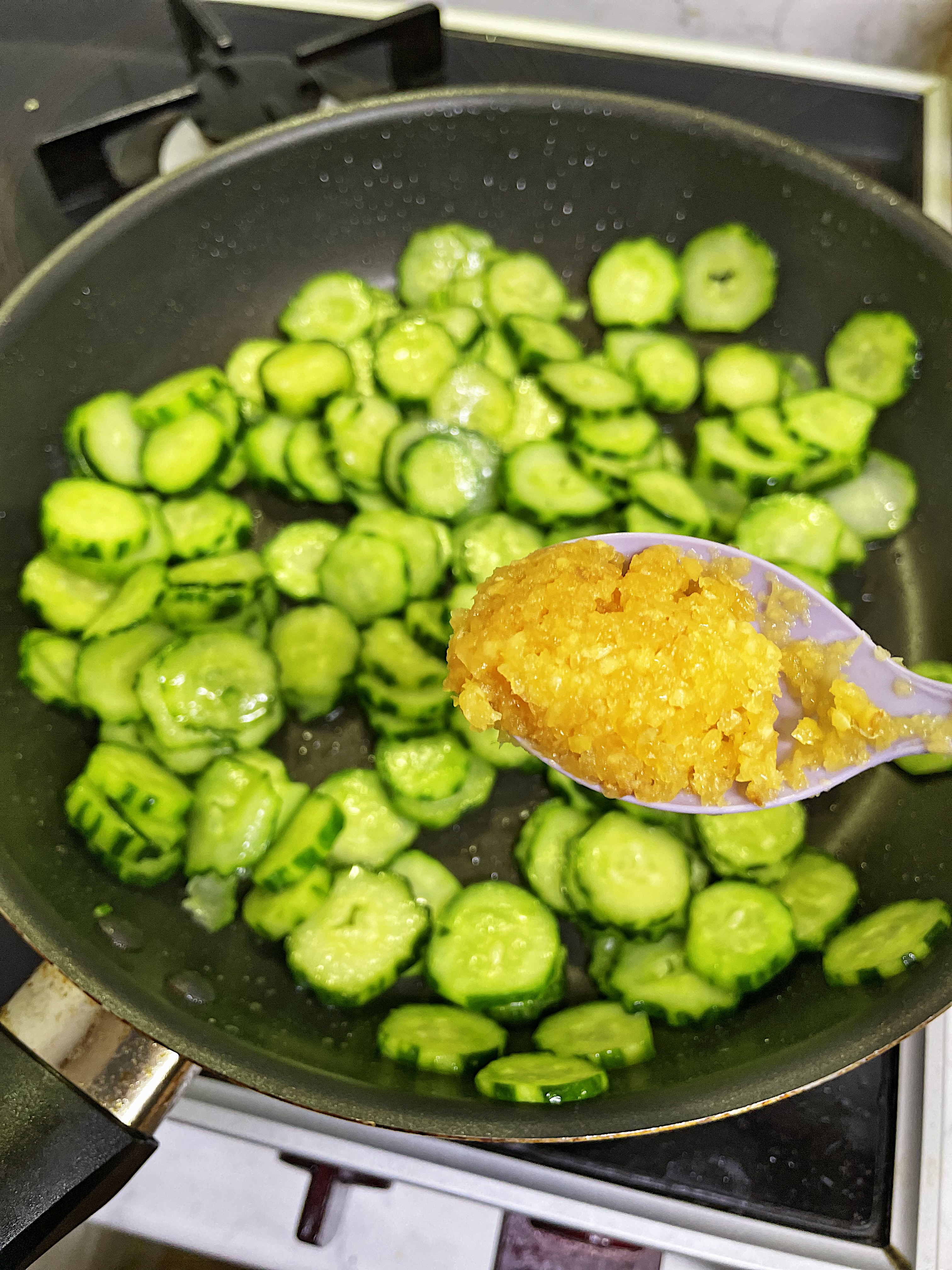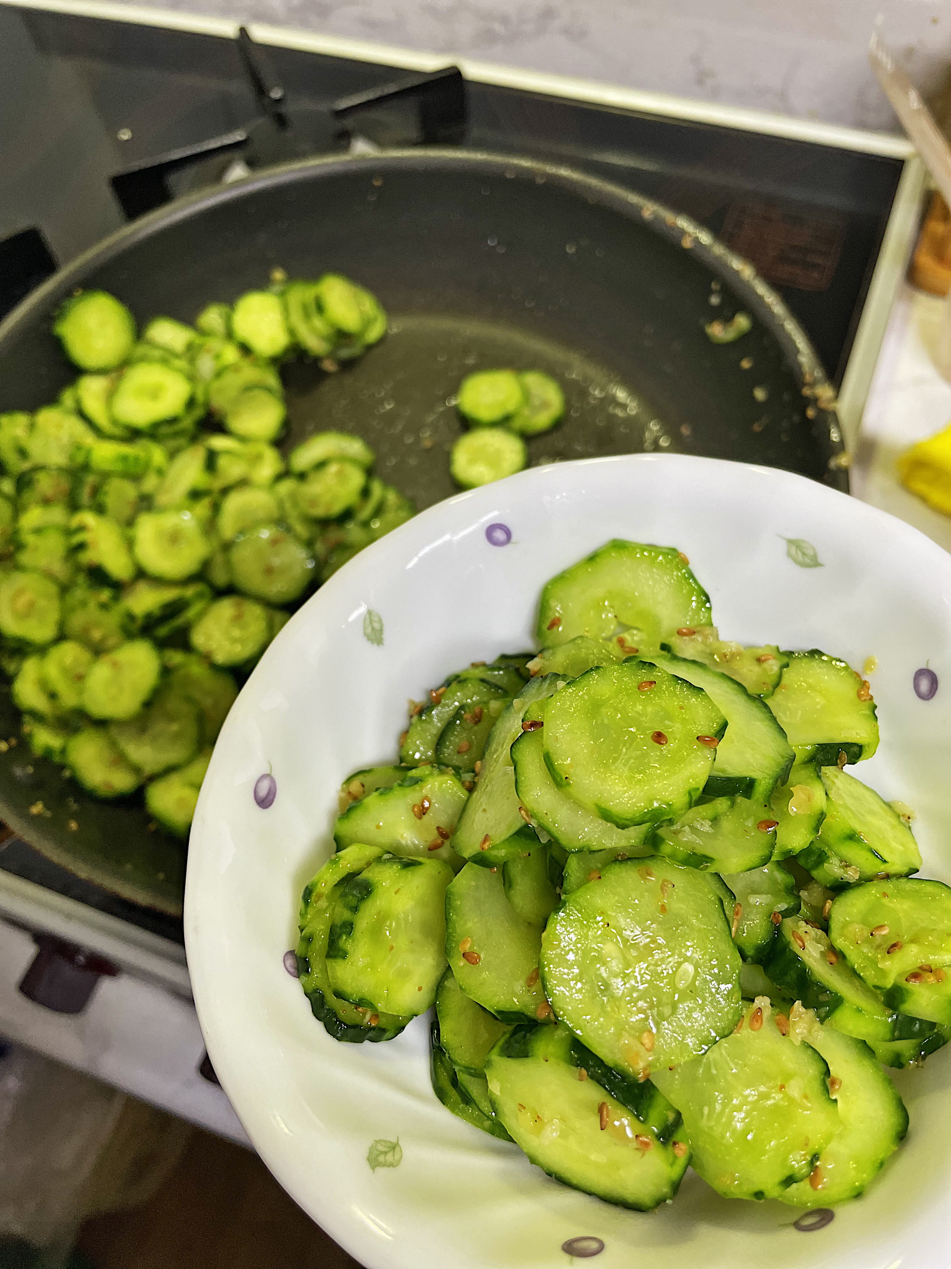 가능하면 오이는 얇게 썰어주는 게 좋은 것 같고, 소금에 절여준 다음 키친타올로 꾹꾹 물기를 잘 제거하고 조금 강한 불로 조리해 주셔야 아삭아삭한 식감이 살아있는 오이나물이 완성되는 것 같습니다.