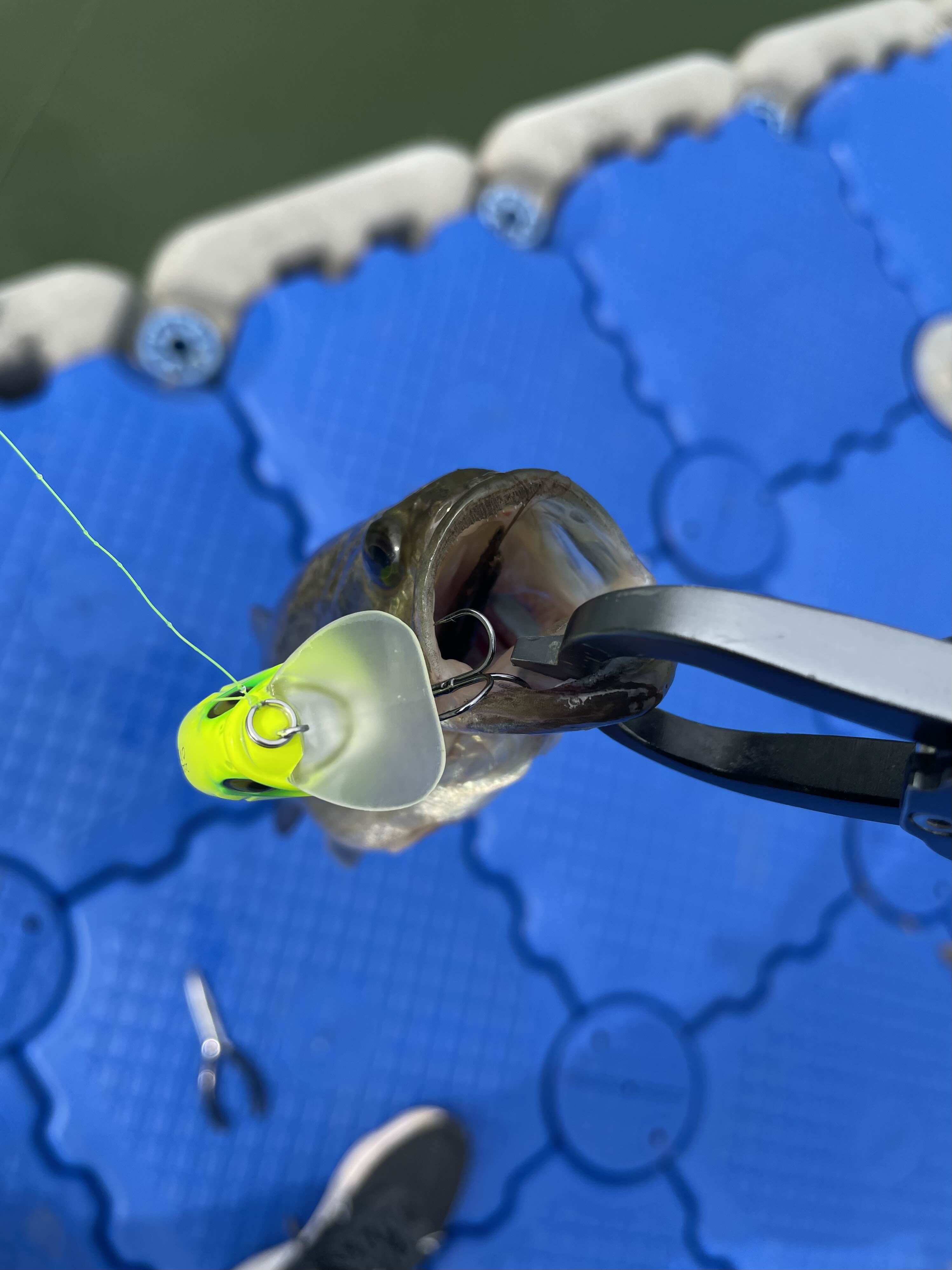 표층에 뒤뚱뒤뚱 움직이는 루어를 물속에 있던 배스가 올라와 확! 덮치는 모습을 눈으로 보는 건 색다른 재미입니다.