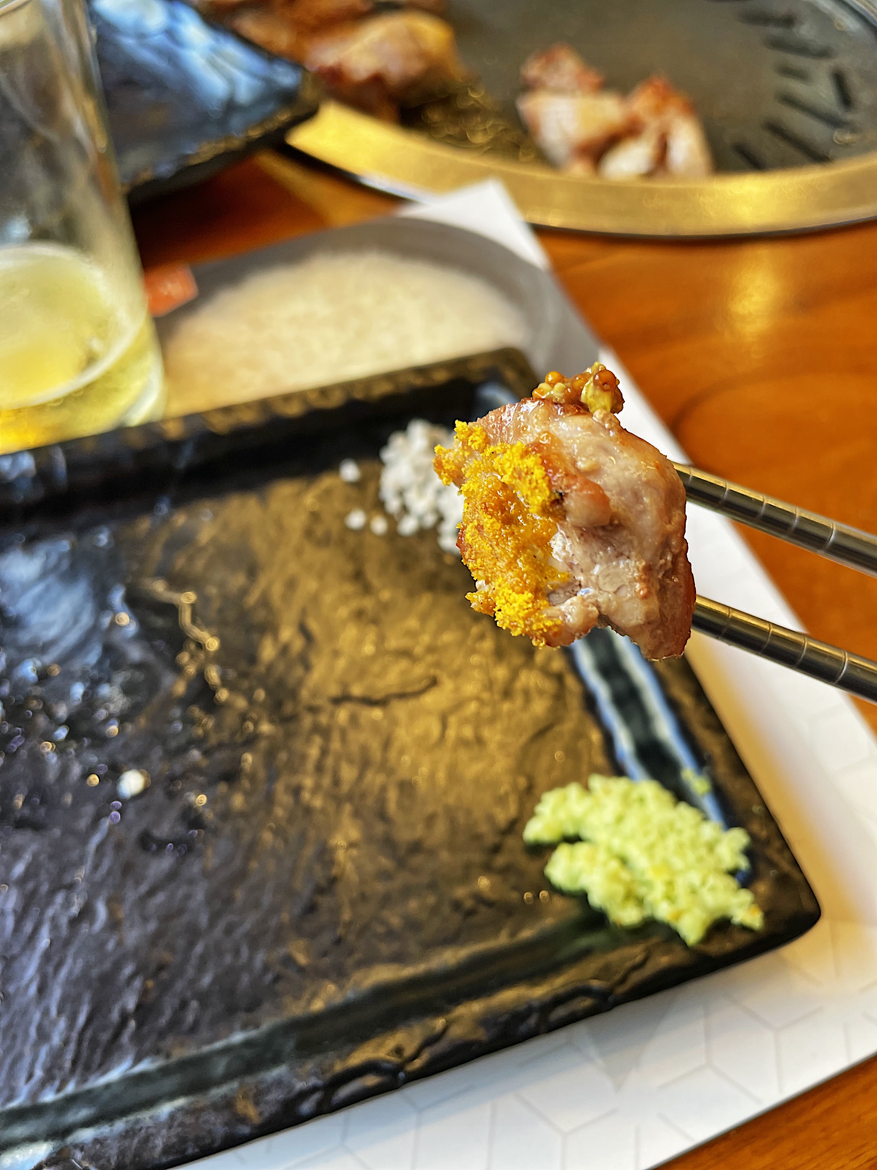 그리고 곁들여 먹는 소스에는 홀그레인 머스터드, 카레가루, 쌈장, 와사비, 소금 등이 보입니다.