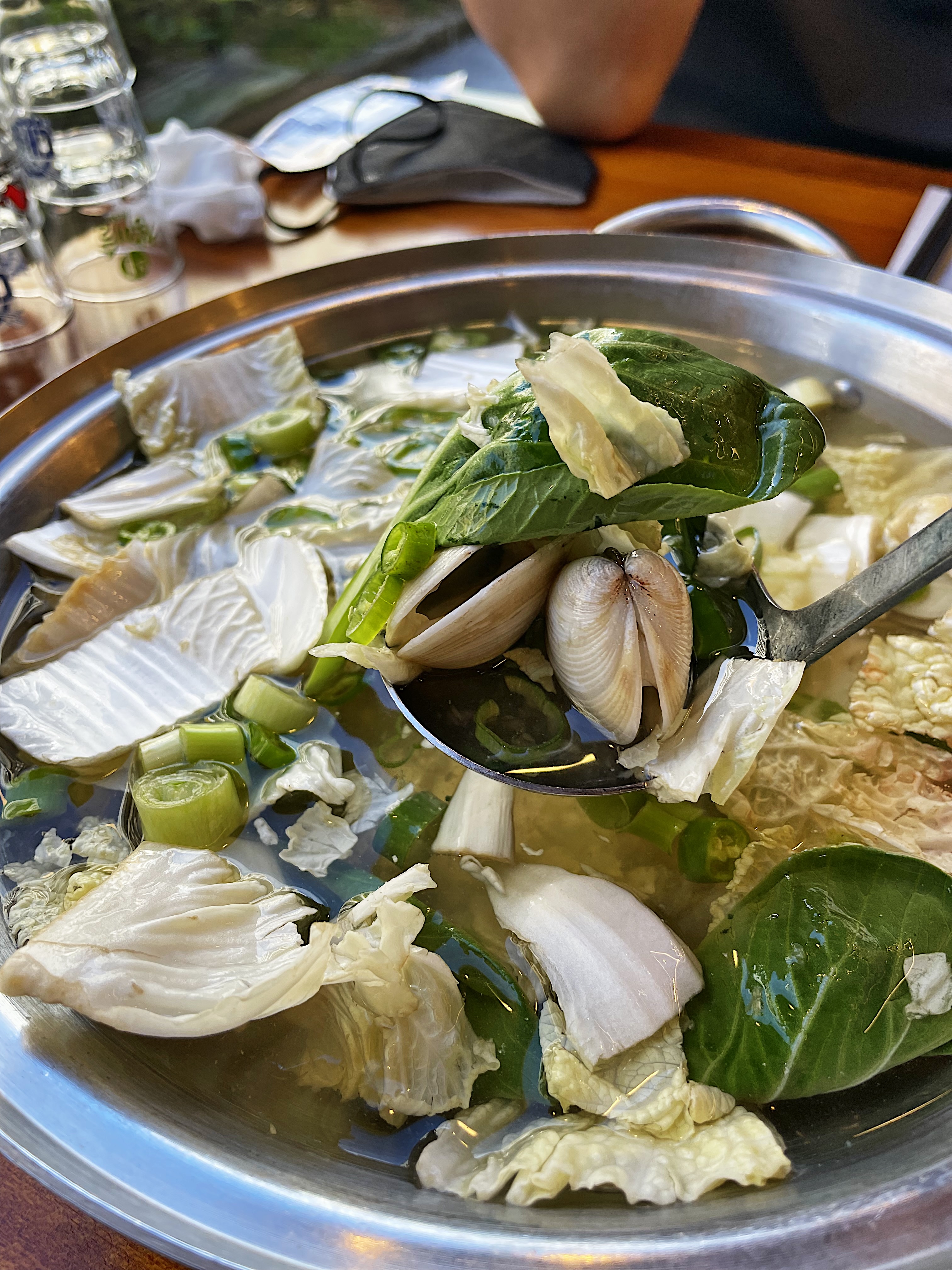 국자로 살짝 들어보니 안에 바지락이 들어 있는 조개탕이었습니다.