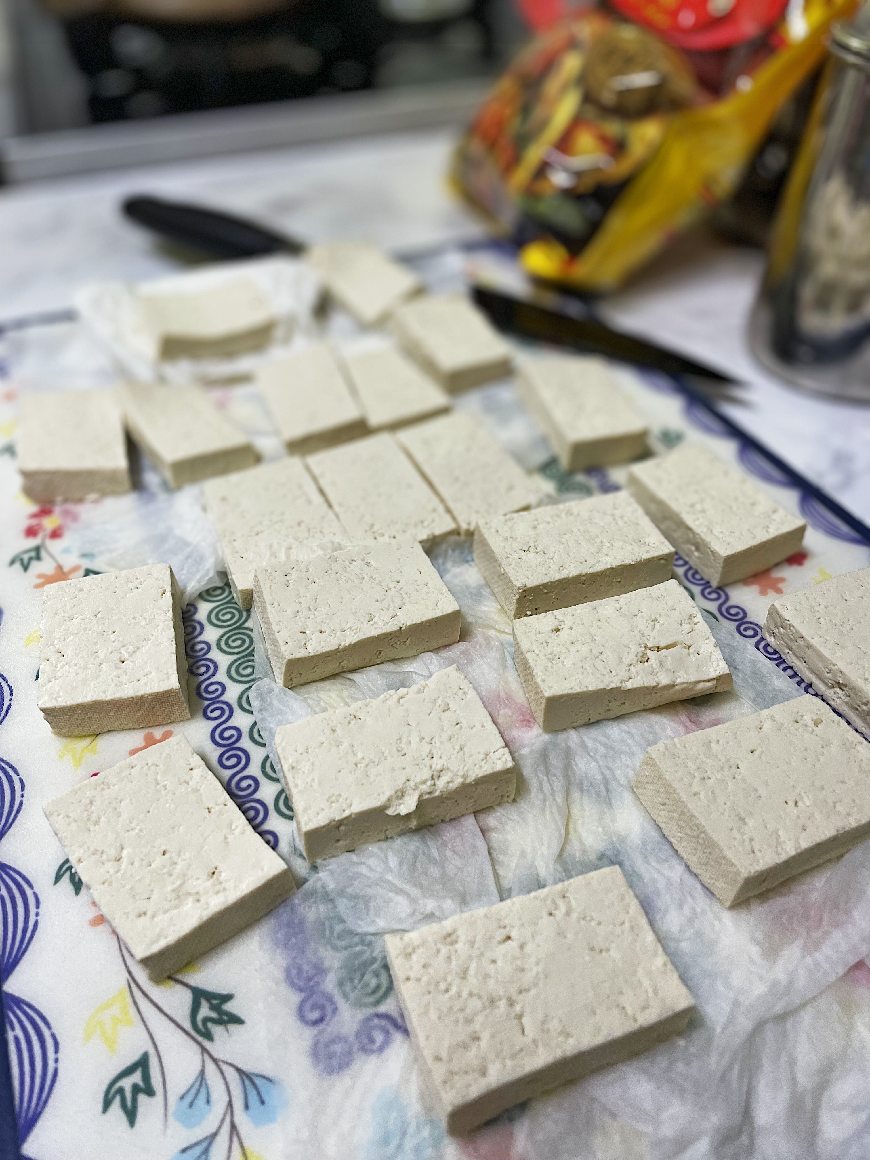 키친타올을 이용해서 두부의 물기를 제거해 줍니다.