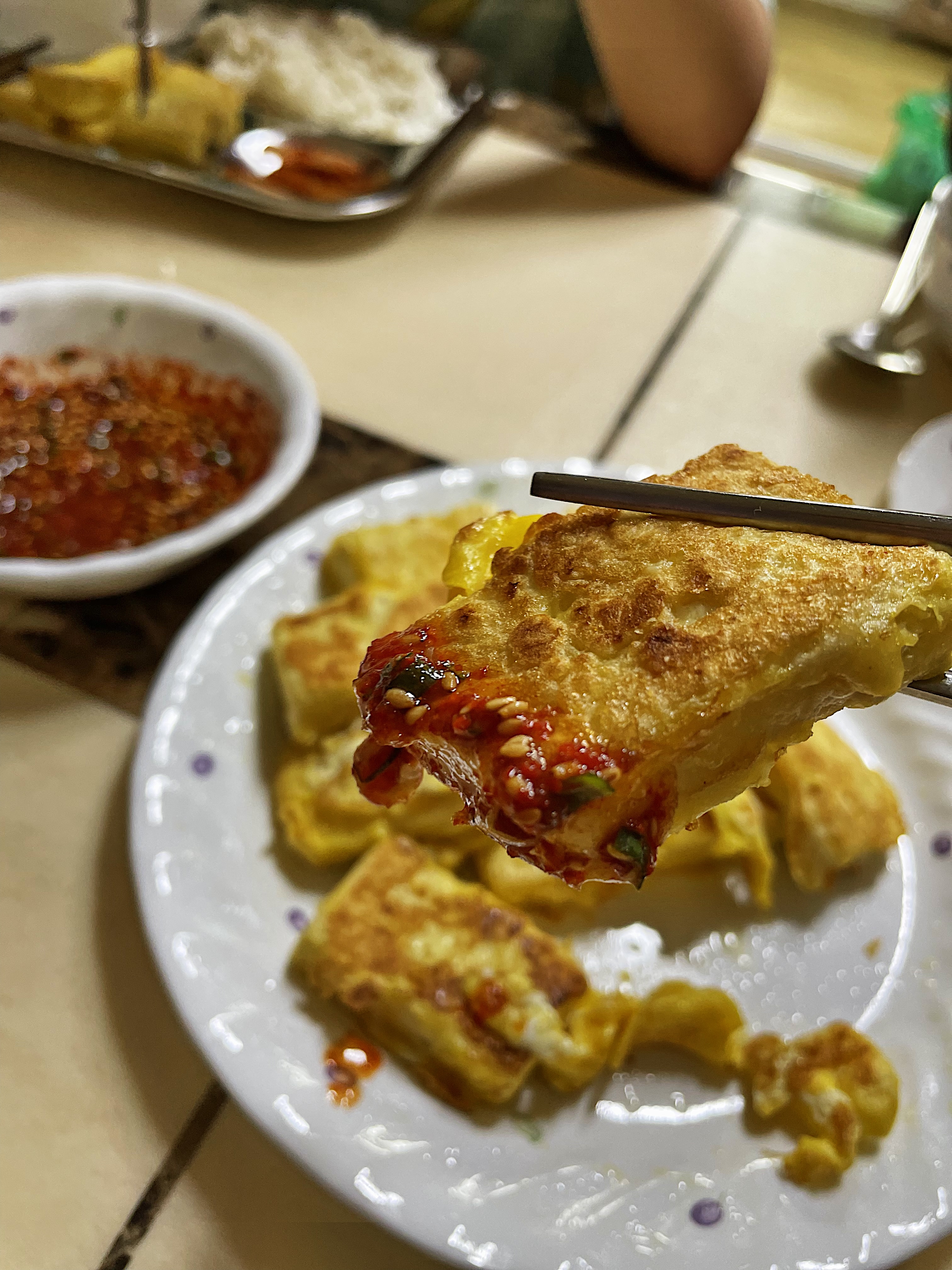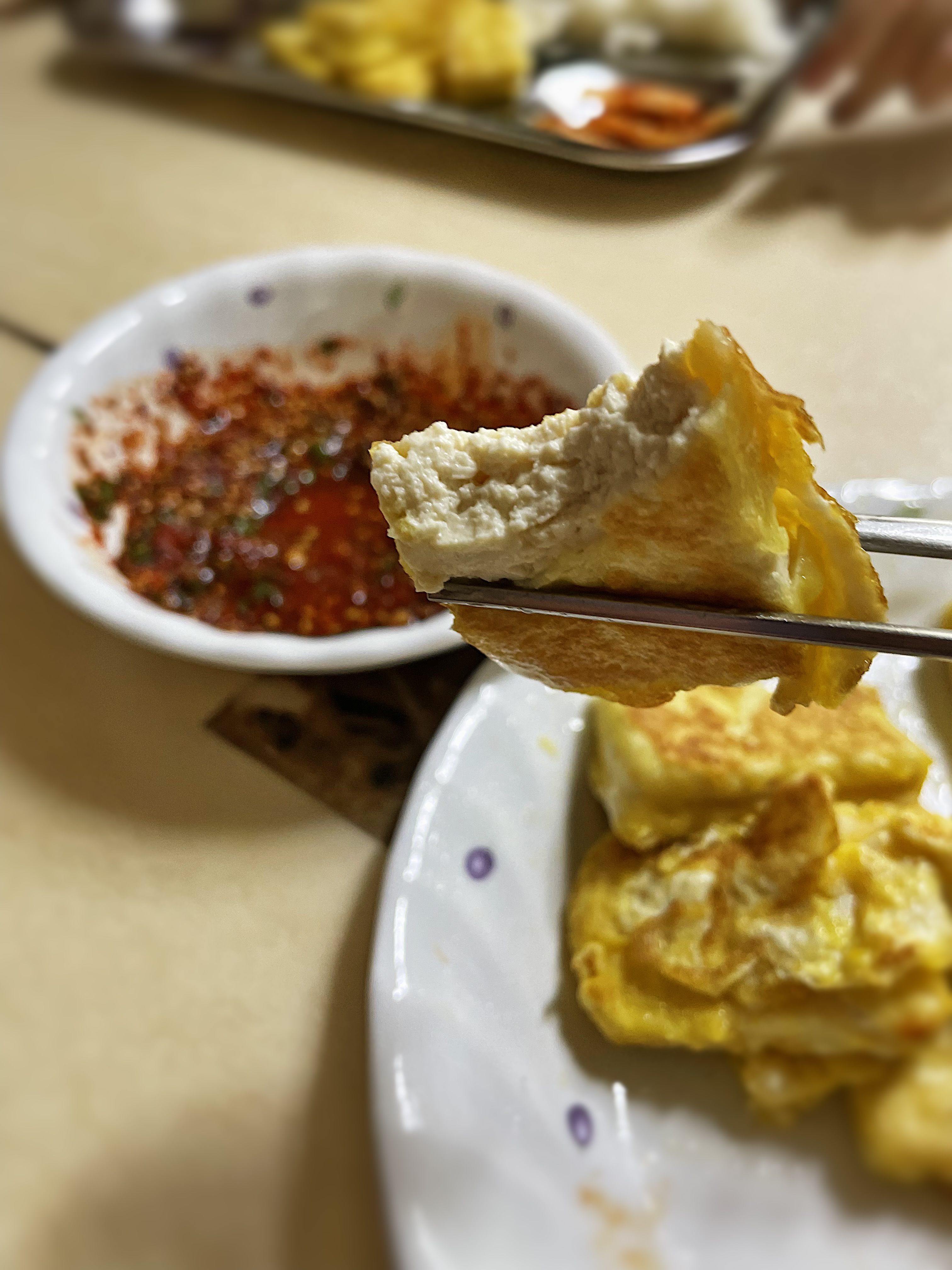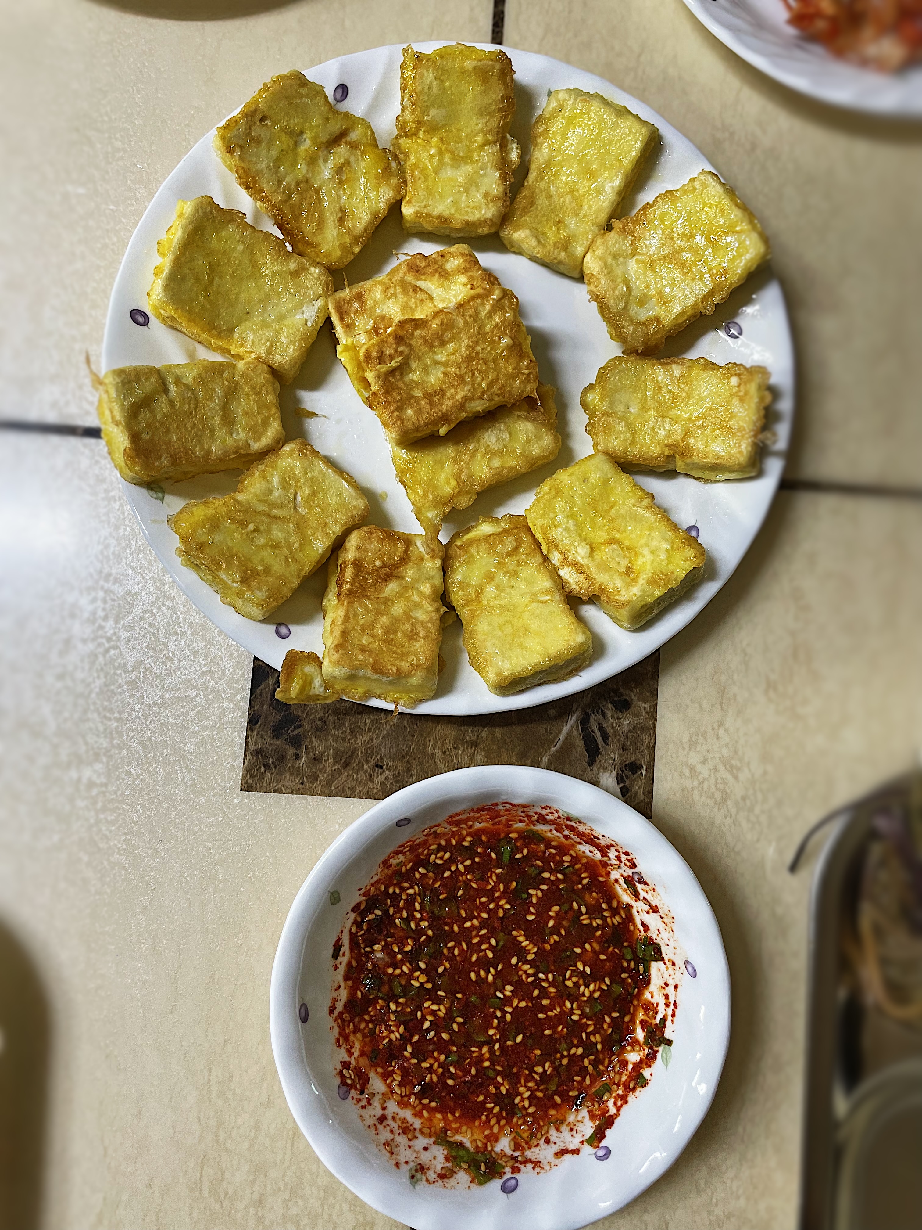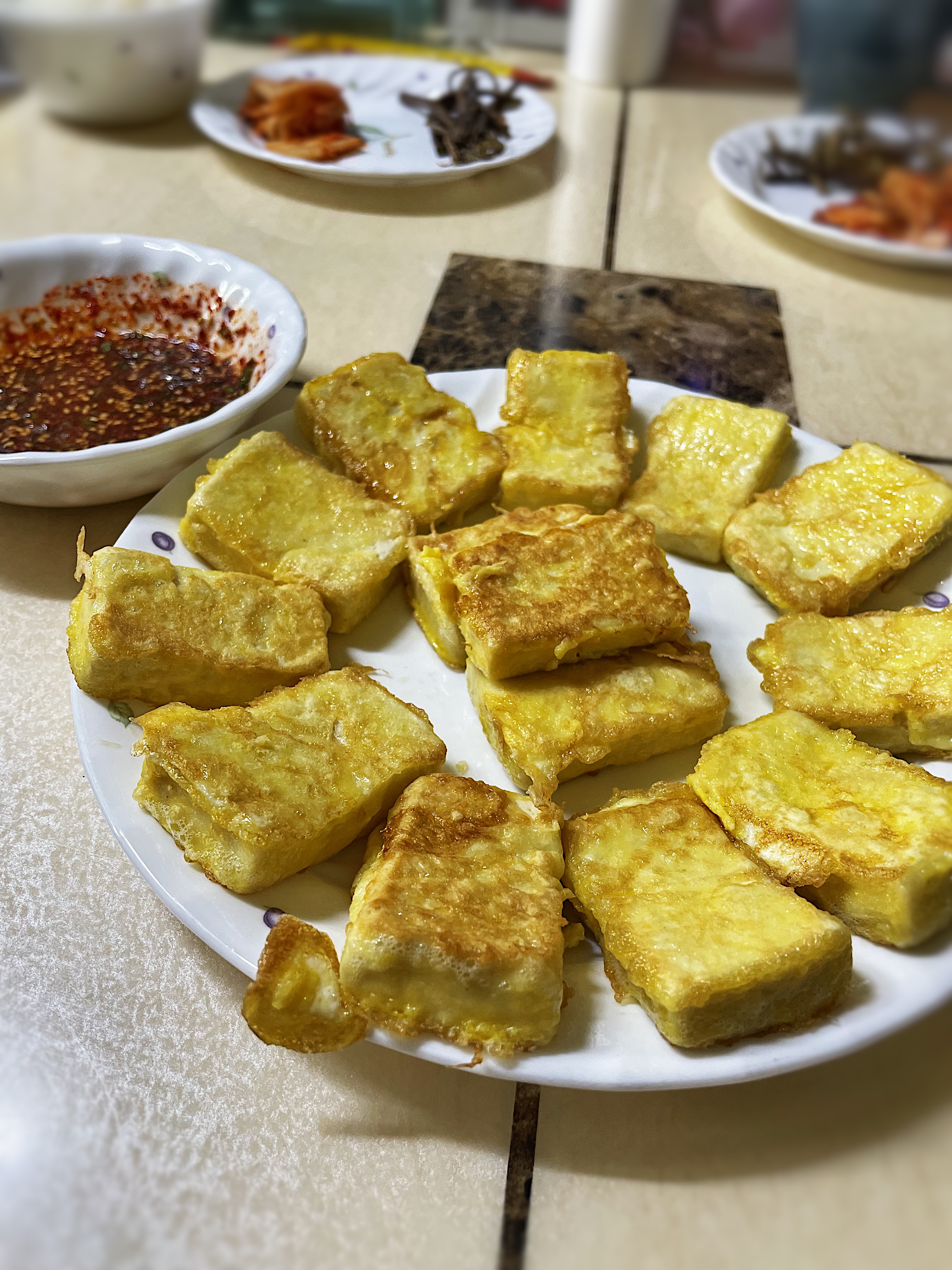 튀긴건 아니지만 수분을 쫙 빼고 부쳐서 그런지 아주 고소하고 담백합니다.