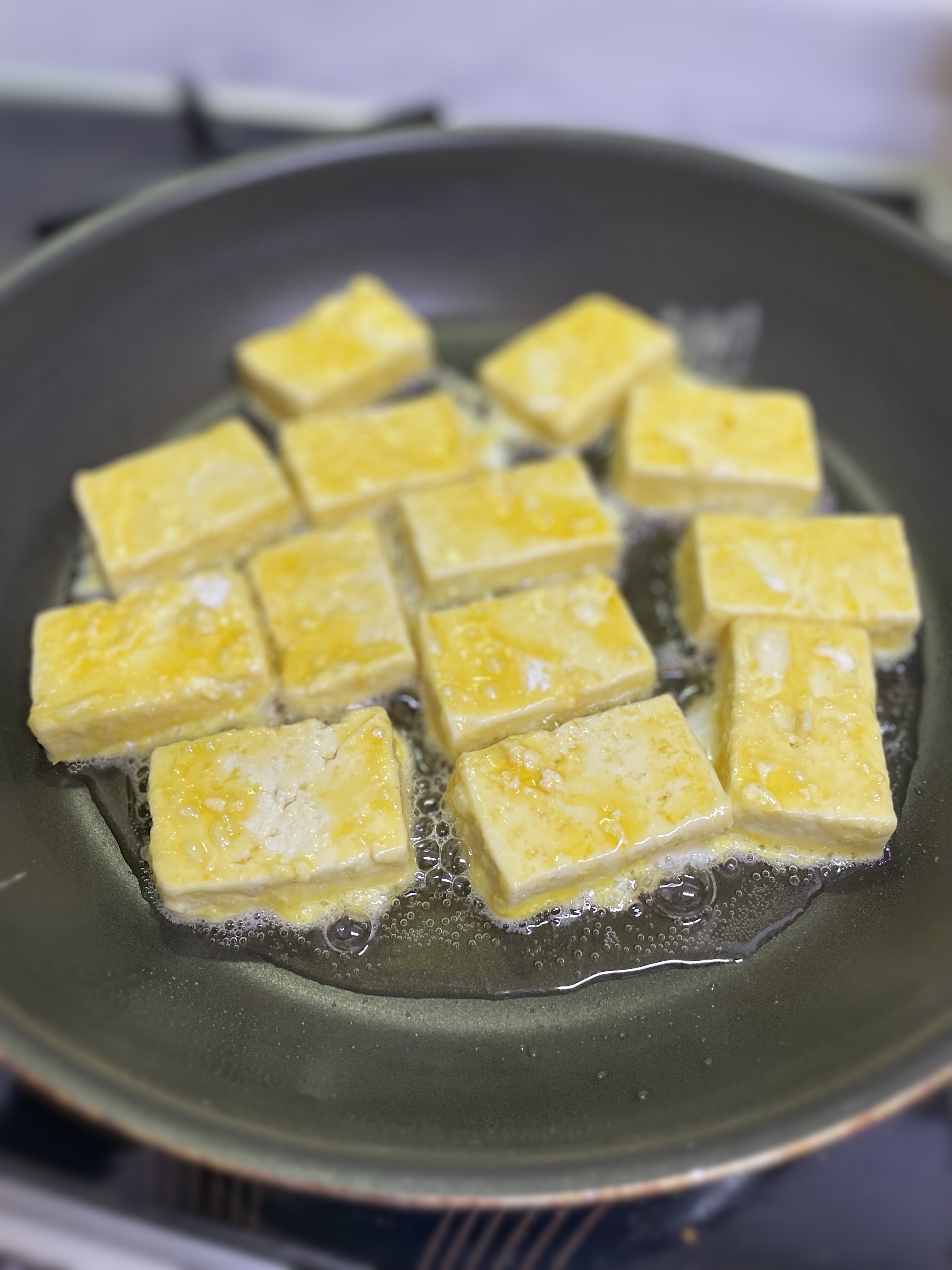 부침가루 묻힌 두부를 계란옷 한 번 더 입혀준 다음 후라이팬에 구워줍니다.