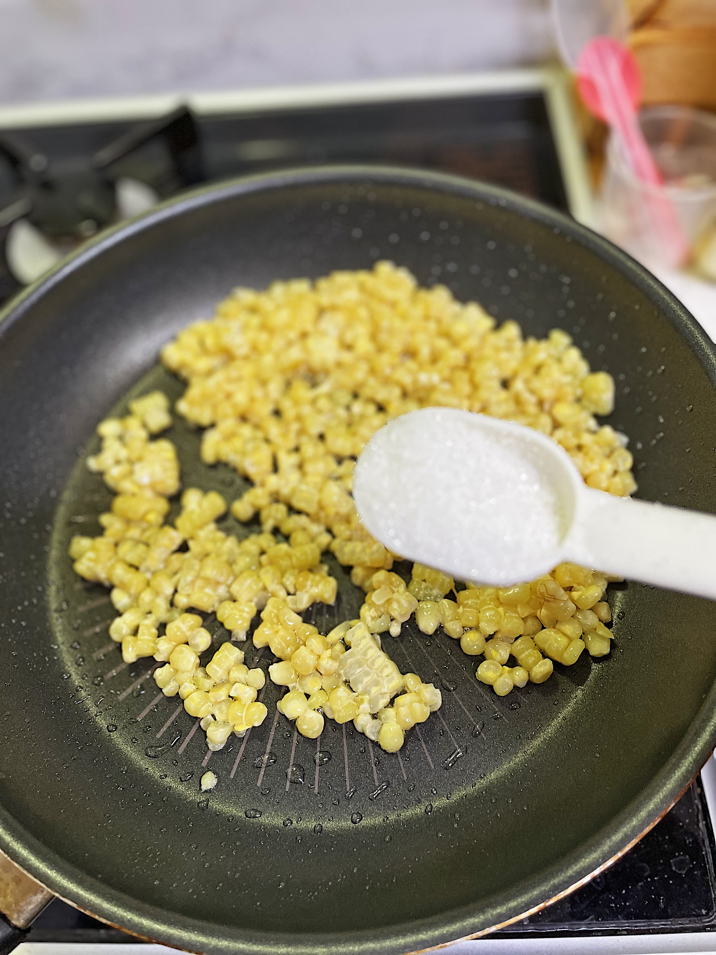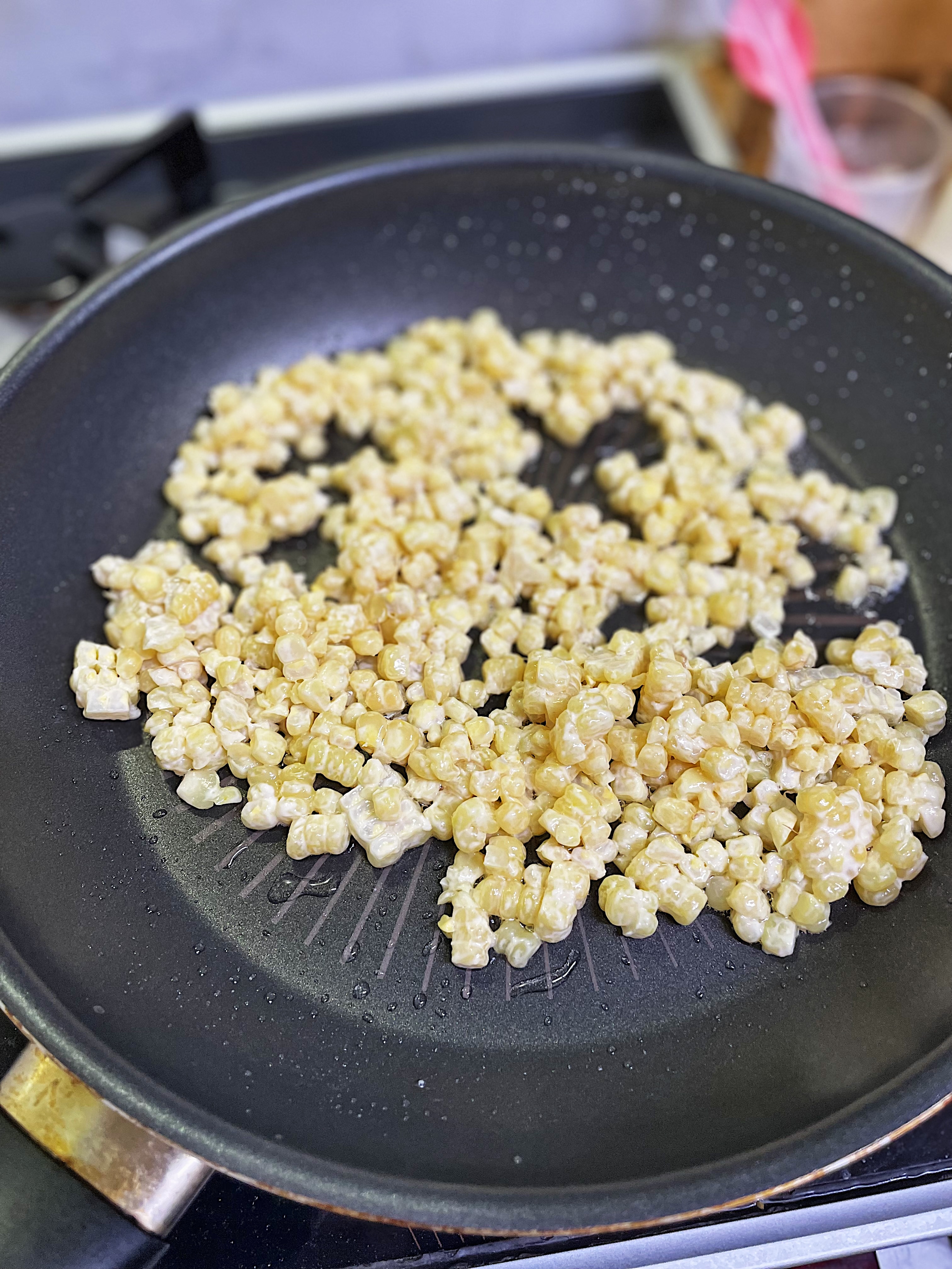중약불로 달궈진 팬에 기름 살짝 둘러주고 마요네즈 묻힌 옥수수 알갱이를 뒤적뒤적 익혀줍니다.