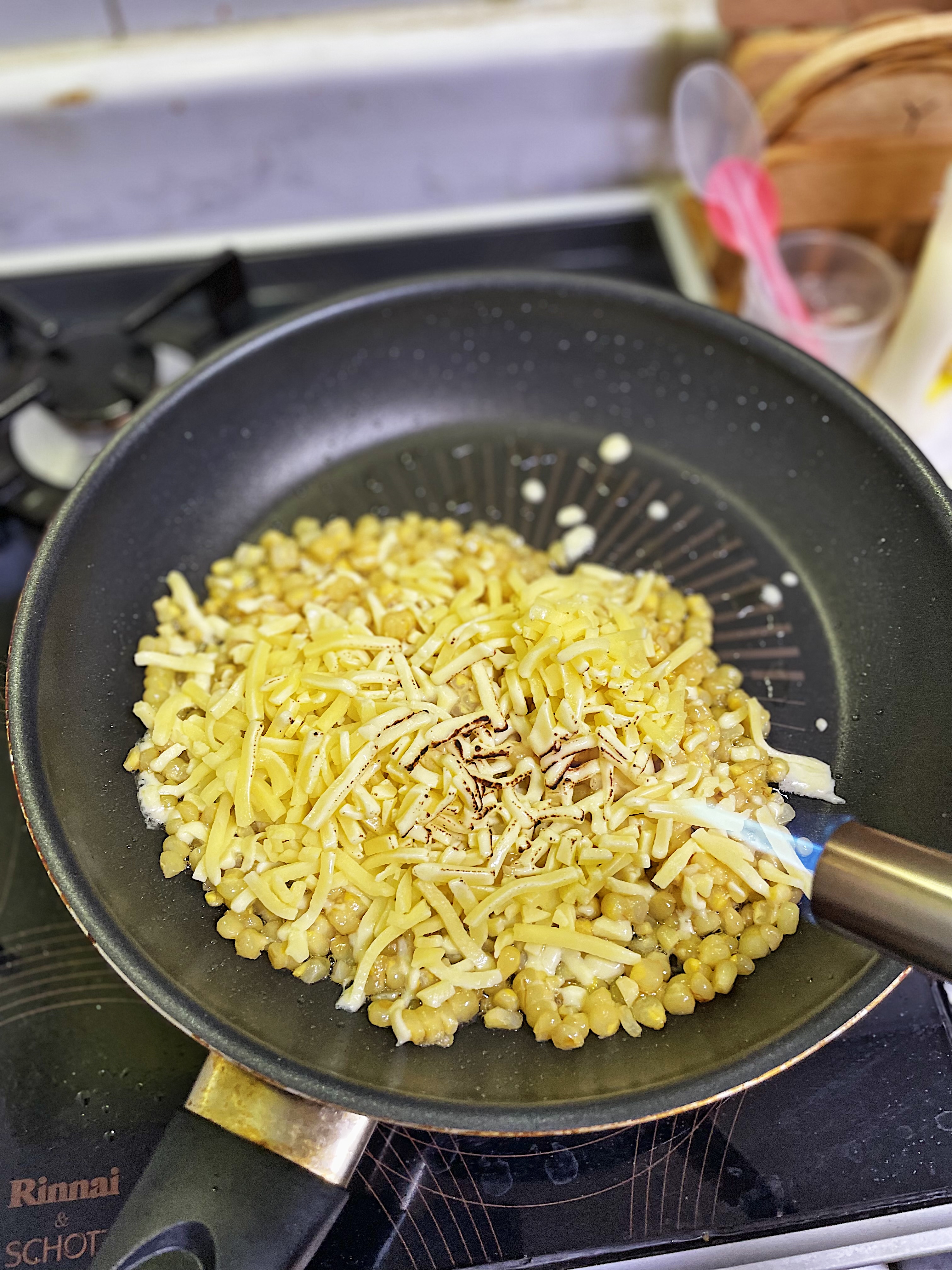 어느 정도 콘이 익었다 싶으면 위에 치즈를 가득 올려준 다음 뚜껑을 덮어주고 복사열로 익혀주면 되는데,