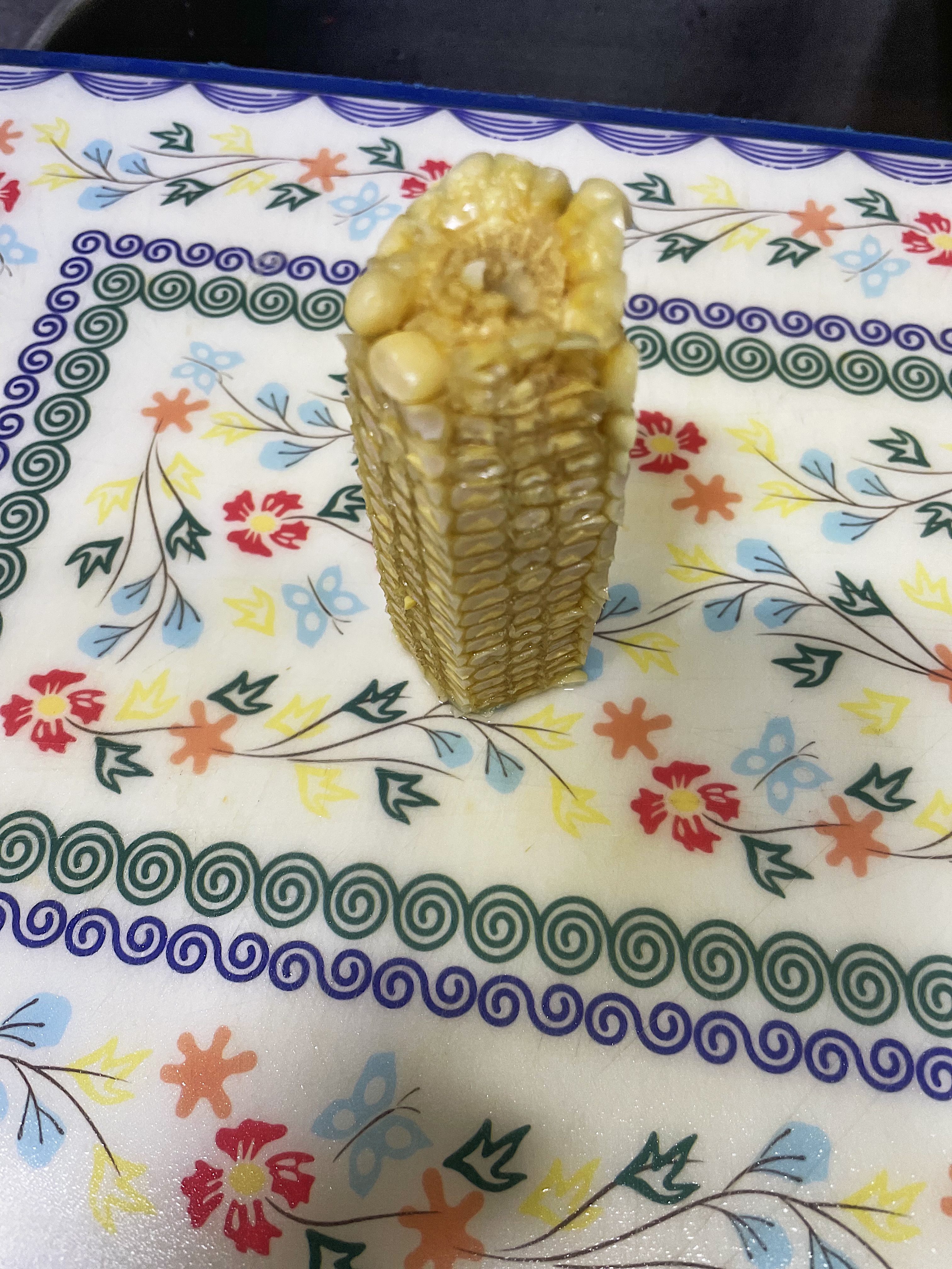 제일 먼저 옥수수를 반으로 분질러서 이렇게 세워두고 칼로 슥슥 알맹이만 탈곡(?) 해 줍니다.