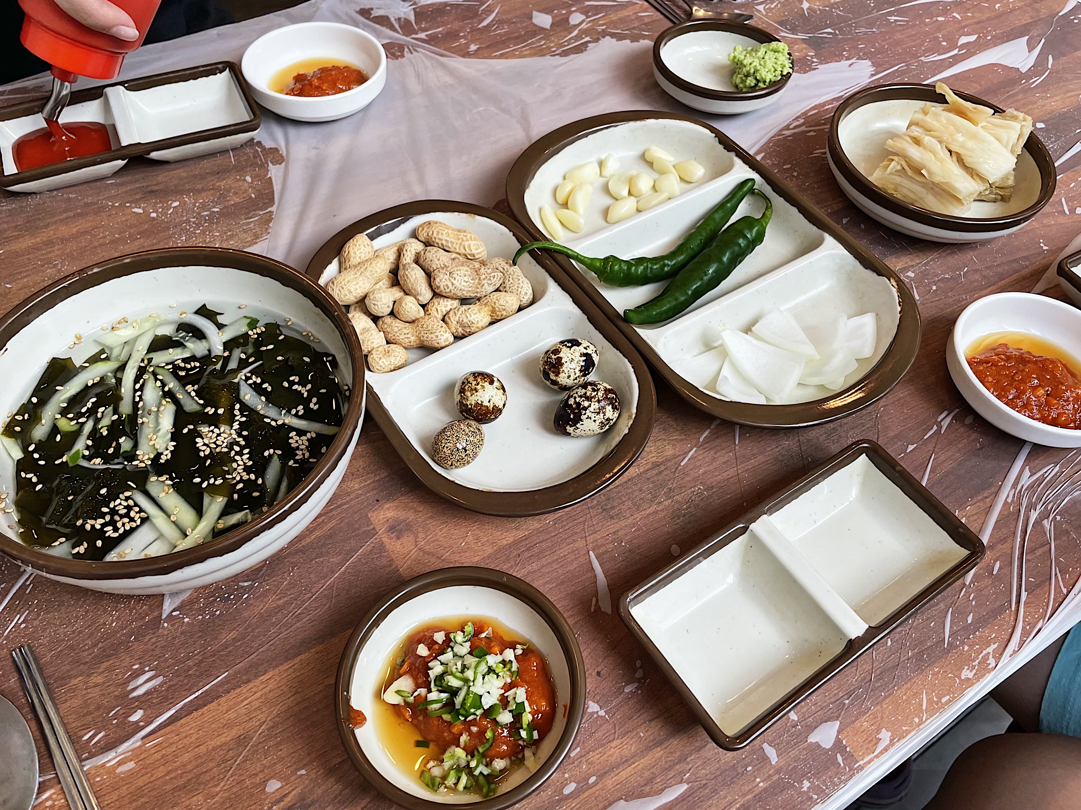기본 반찬은 땅콩과 메추리알, 묵은지 김치와 마늘, 양파, 고추, 쌈채소