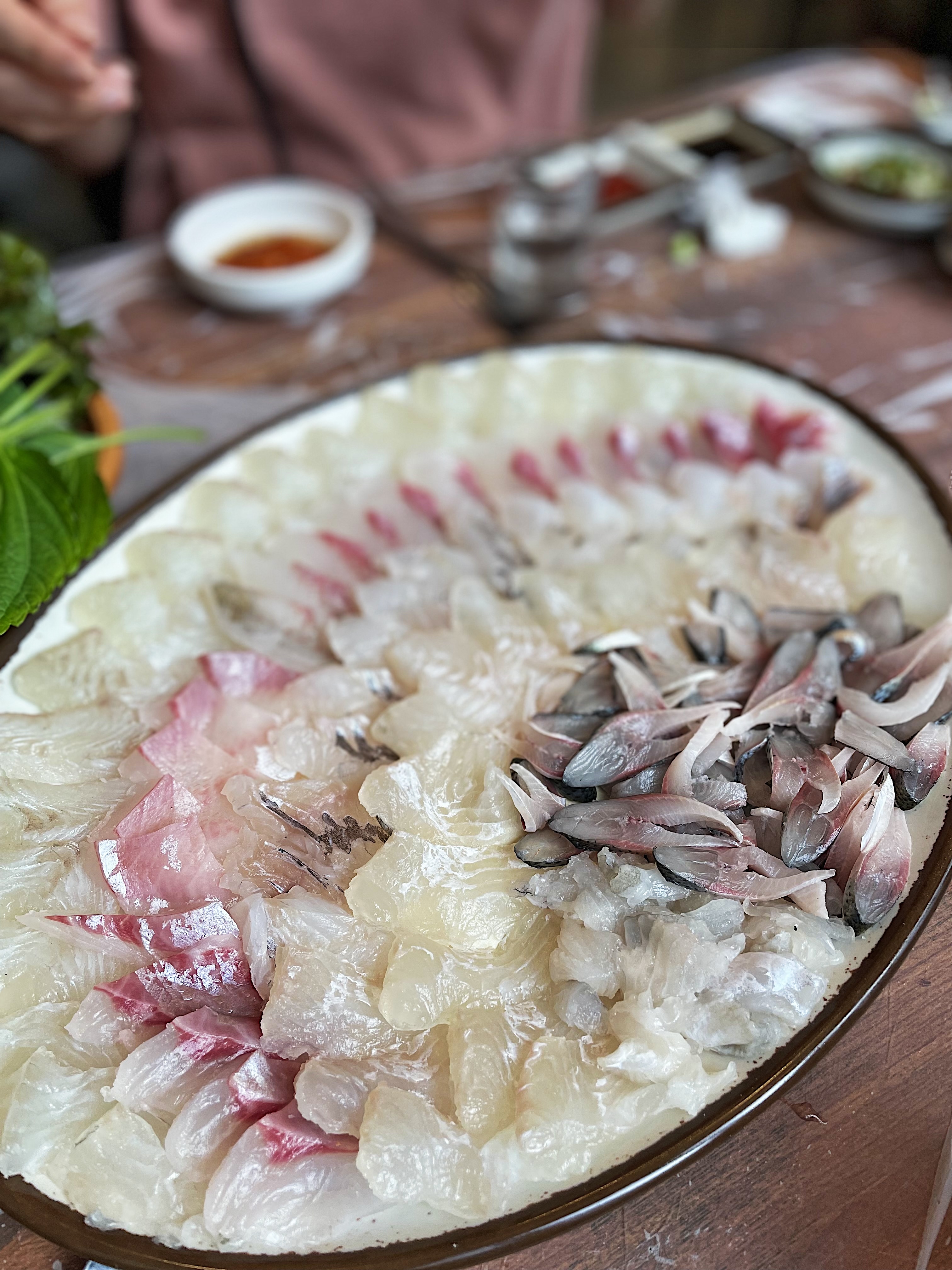 전어는 뼈째(세꼬시) 로 썰고, 도톰한 광어는 지느러미살까지 아주 고소하고 좋습니다.