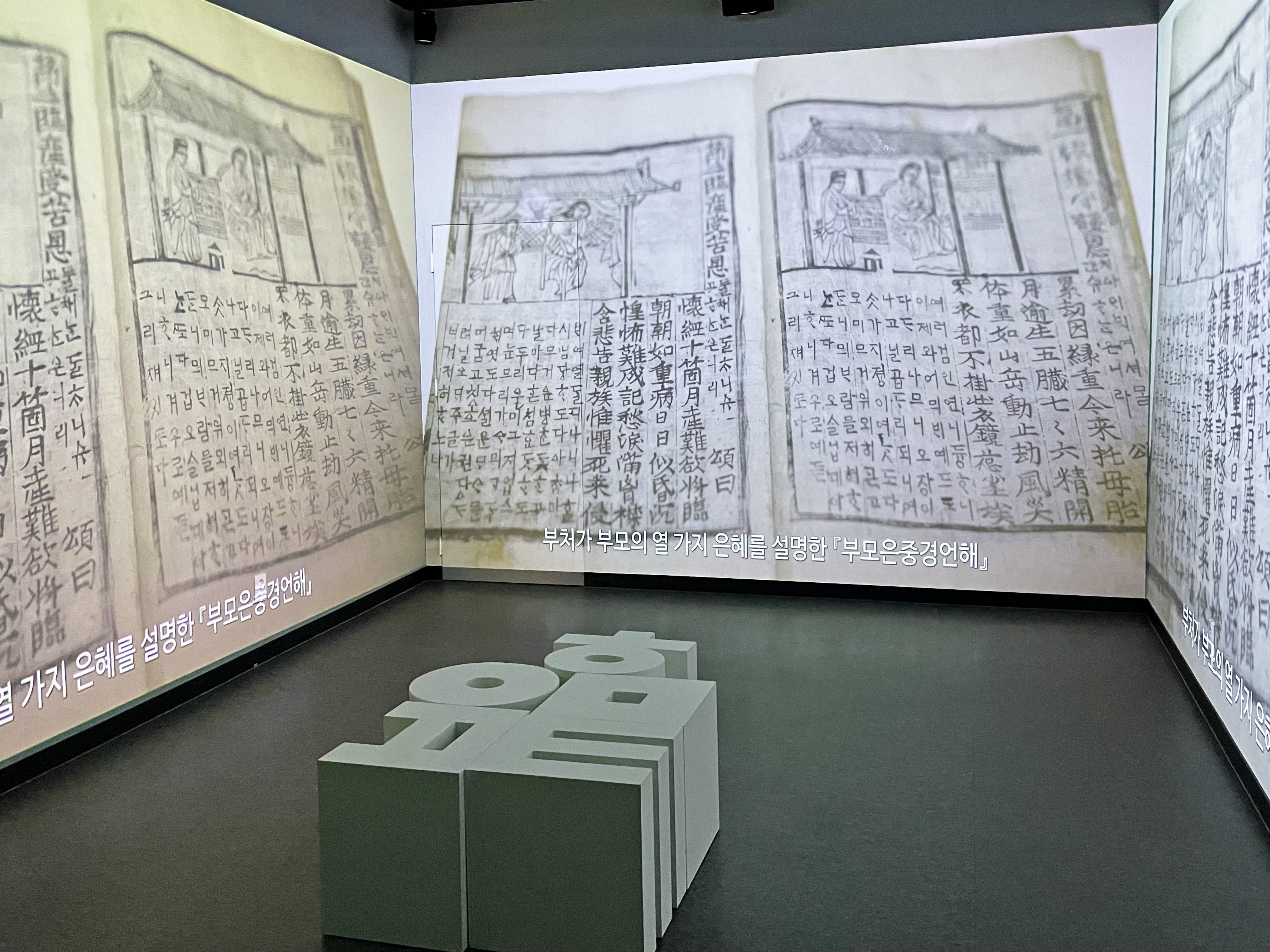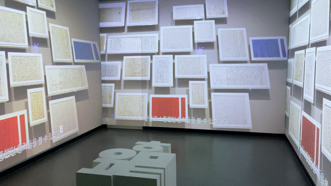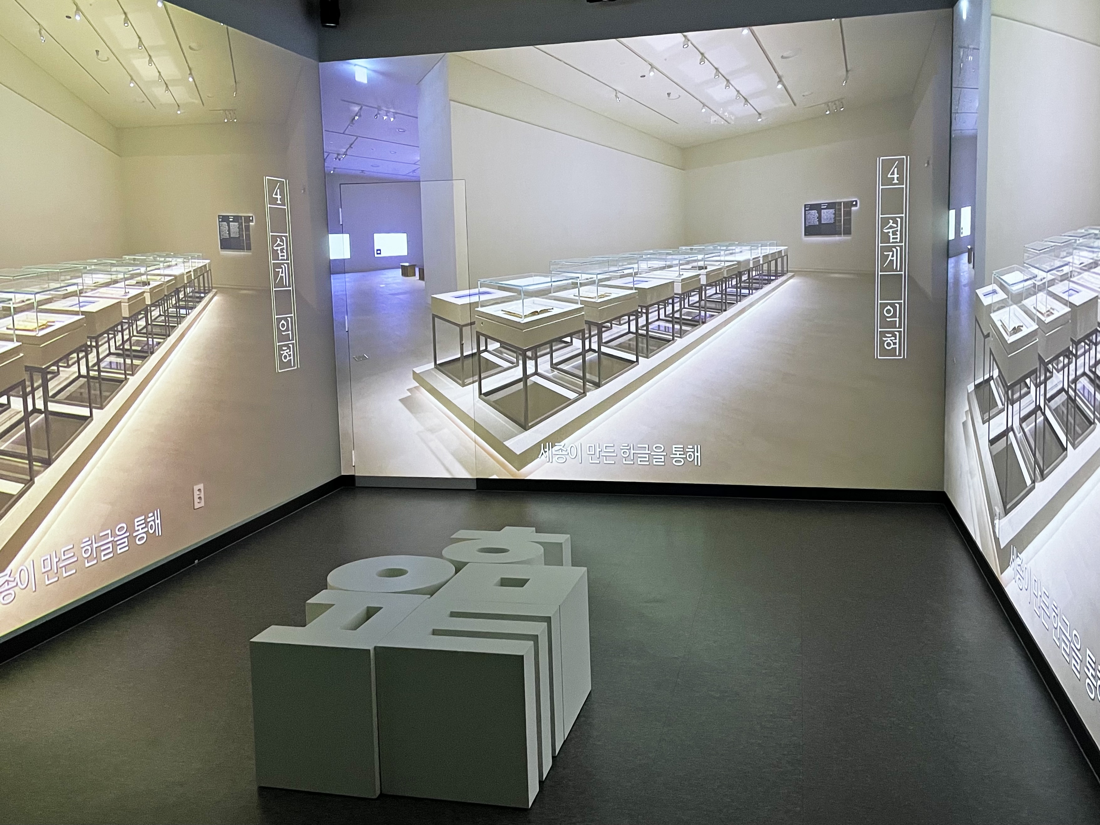 한글과 관련된 다양한 내용이 3개의 벽면에 비춰지고 있었습니다.