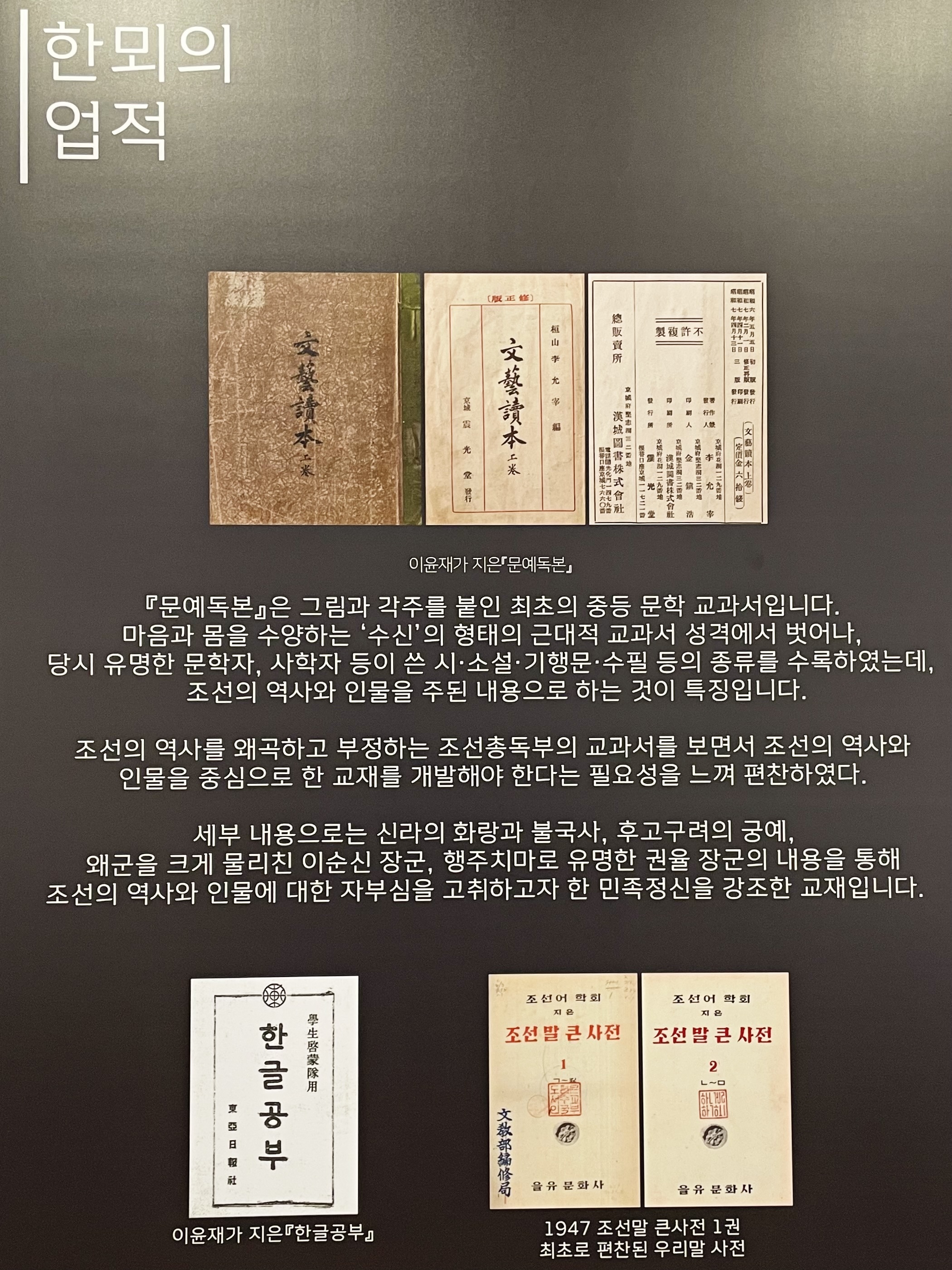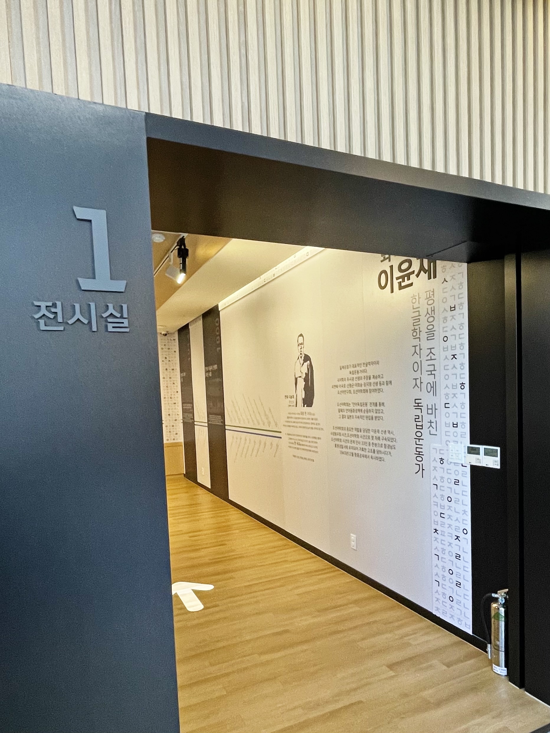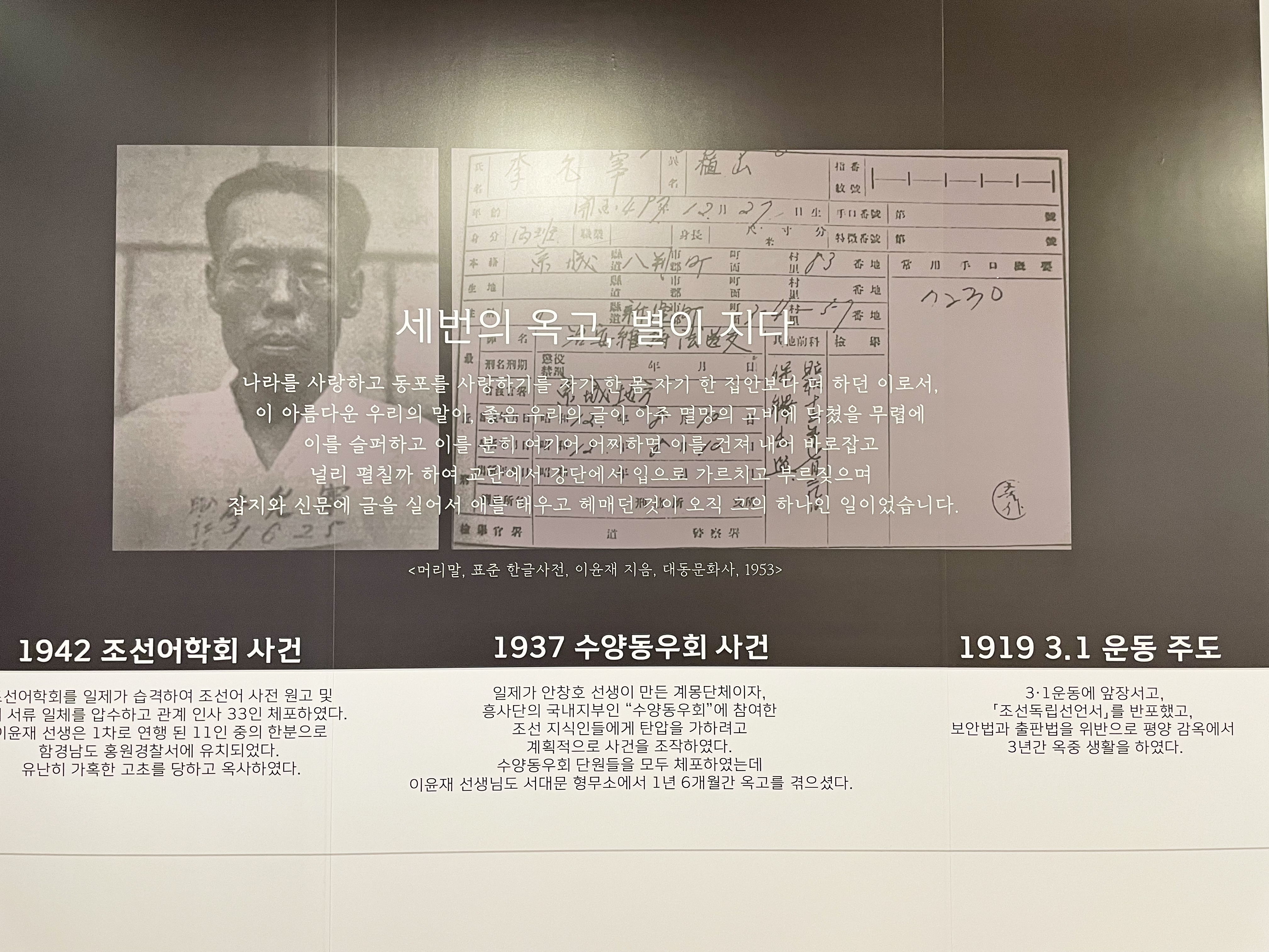 제2전시실에 '눈뫼 허웅' 선생이 있었다면, 제1전시실에는 '한뫼 이윤재' 선생의 업적을 찾아볼 수 있습니다.
