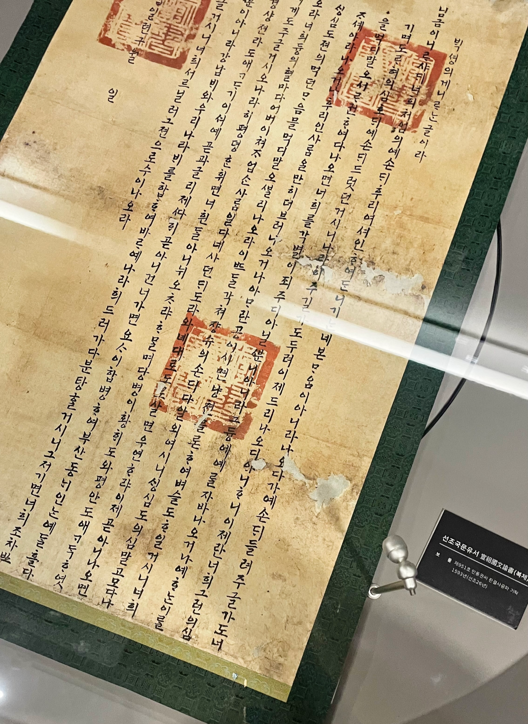 국가지정문화재 보물 제951호로 지정된 "선조국문유서"는 순한글로 기록된 최초의 공문서라는 점에서 역사적 가치가 높을 뿐 아니라, 조선시대의 언어적 형태를 잘 반영하고 있다는 점에서 국어사적 자료로서도 매우 중요하다고 합니다.