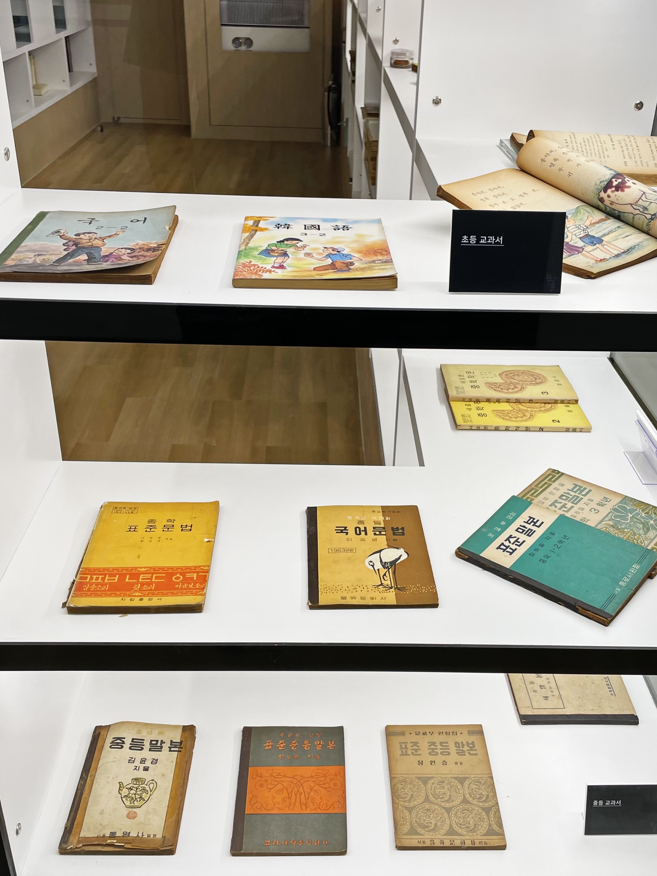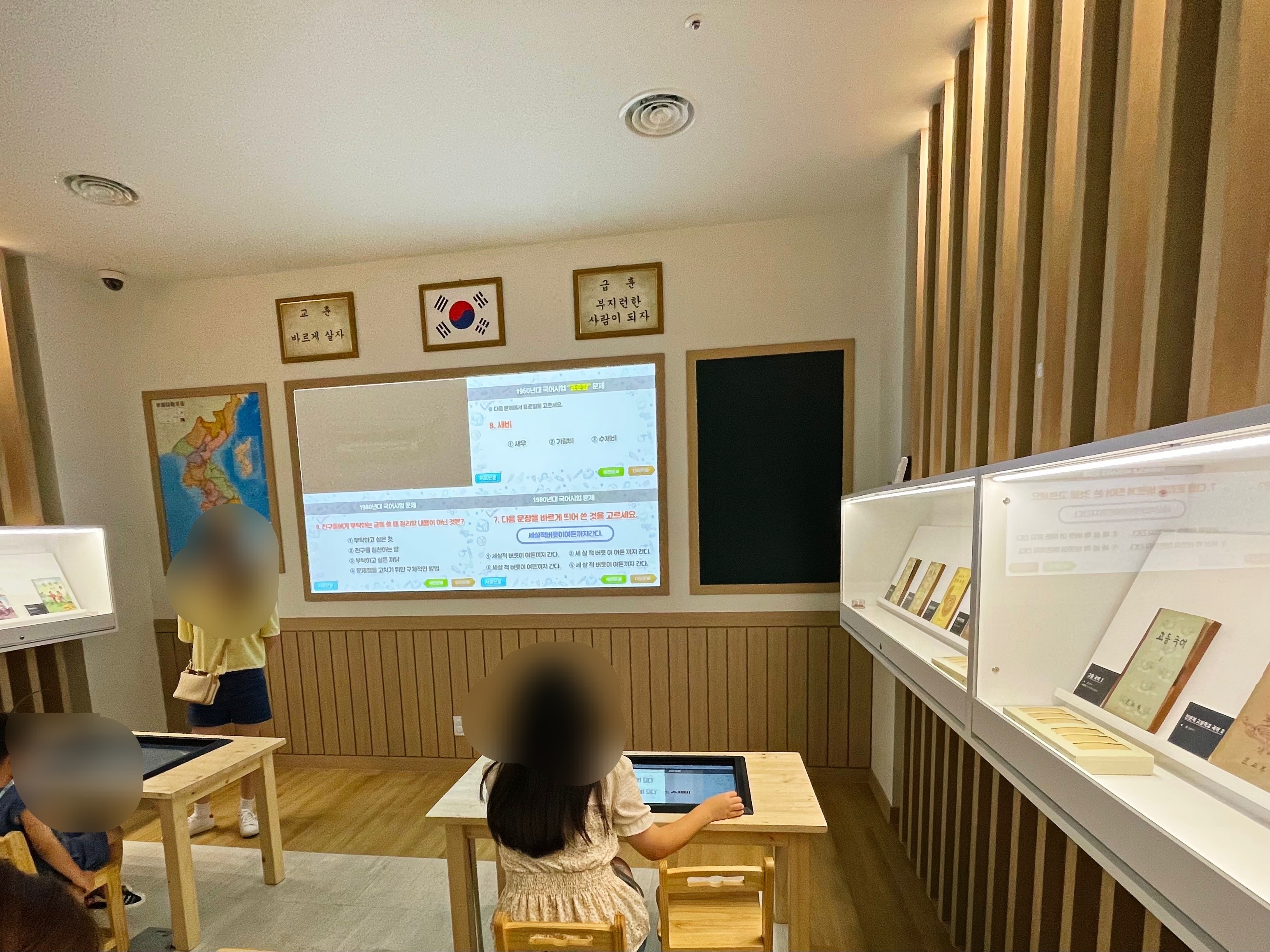 책상마다 터치 스크린이 설치되어 있고, 한쪽 벽면에는 예전의 국어 교과서도 함께 전시되어 있습니다.