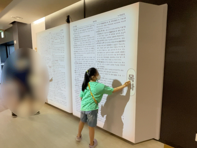 빔 프로젝터로 화면을 비추어 상호작용이 가능하도록 만들어진 이 사전은 아이들이 직접 터치해서 사전을 둘러볼 수 있어서 많은 방문객들의 관심을 받고 있었습니다.