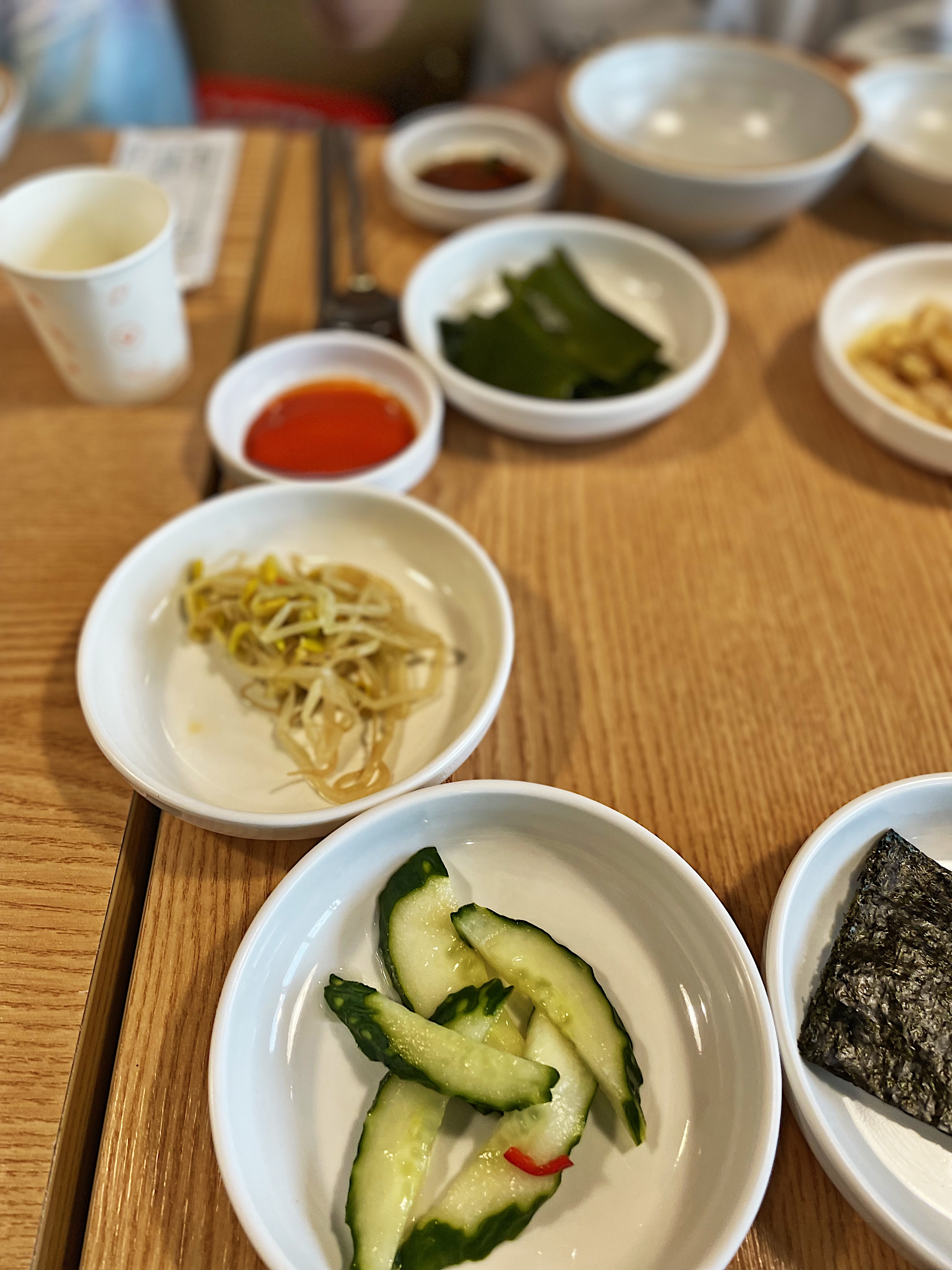 오이 초무침, 숙주나물, 배추김치, 맨 김, 다시마 쌈, 쌈무 볶음(?) 이 나왔습니다.